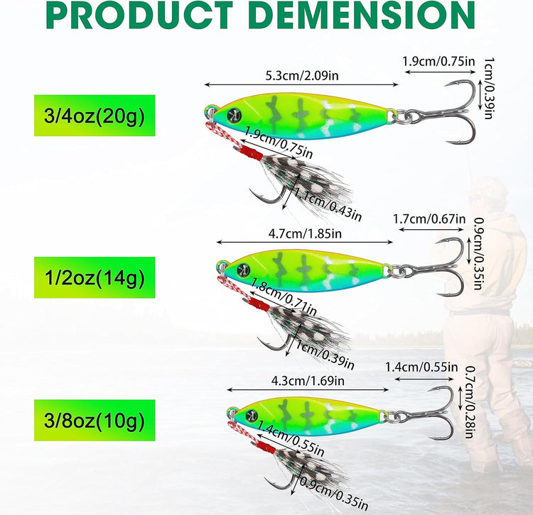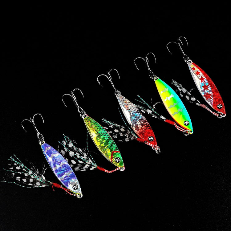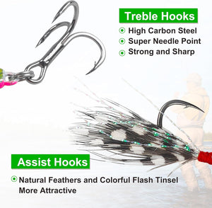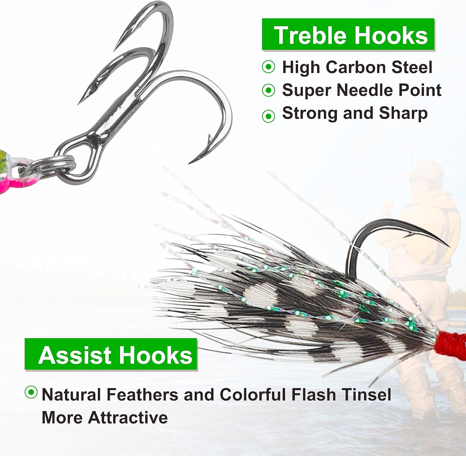 - 【Ultra Sharp Hooks】Sinking vertical jigging lure is equipped with an enhanced treble hook and assist hook,sharp and anti-rust,Tied with feather and colorful flash tinsel which can make more vibrant and attractive,increasing the chances of catching big fish