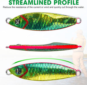 - 【Long-Range Casting】Jigging spoon lures constructed with unique streamlined profile and solid body, which can reduce the resistance to wind and achieve long casting,quicker to hit the deep water,entices fishes in the bottom to strike.