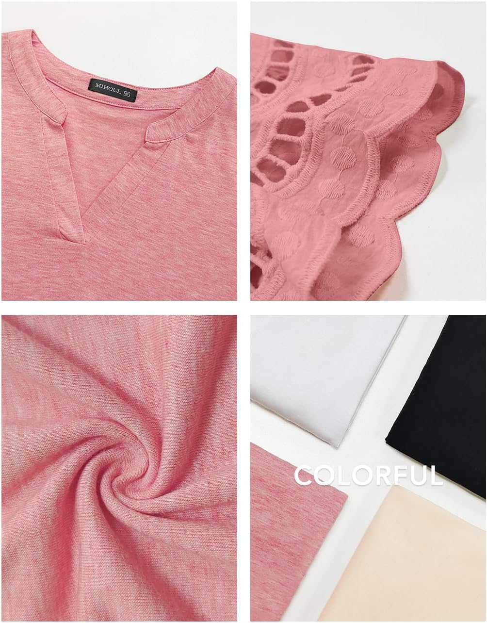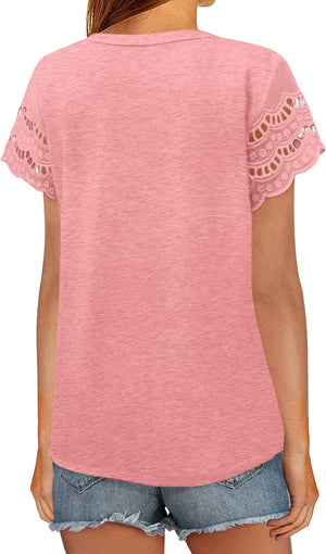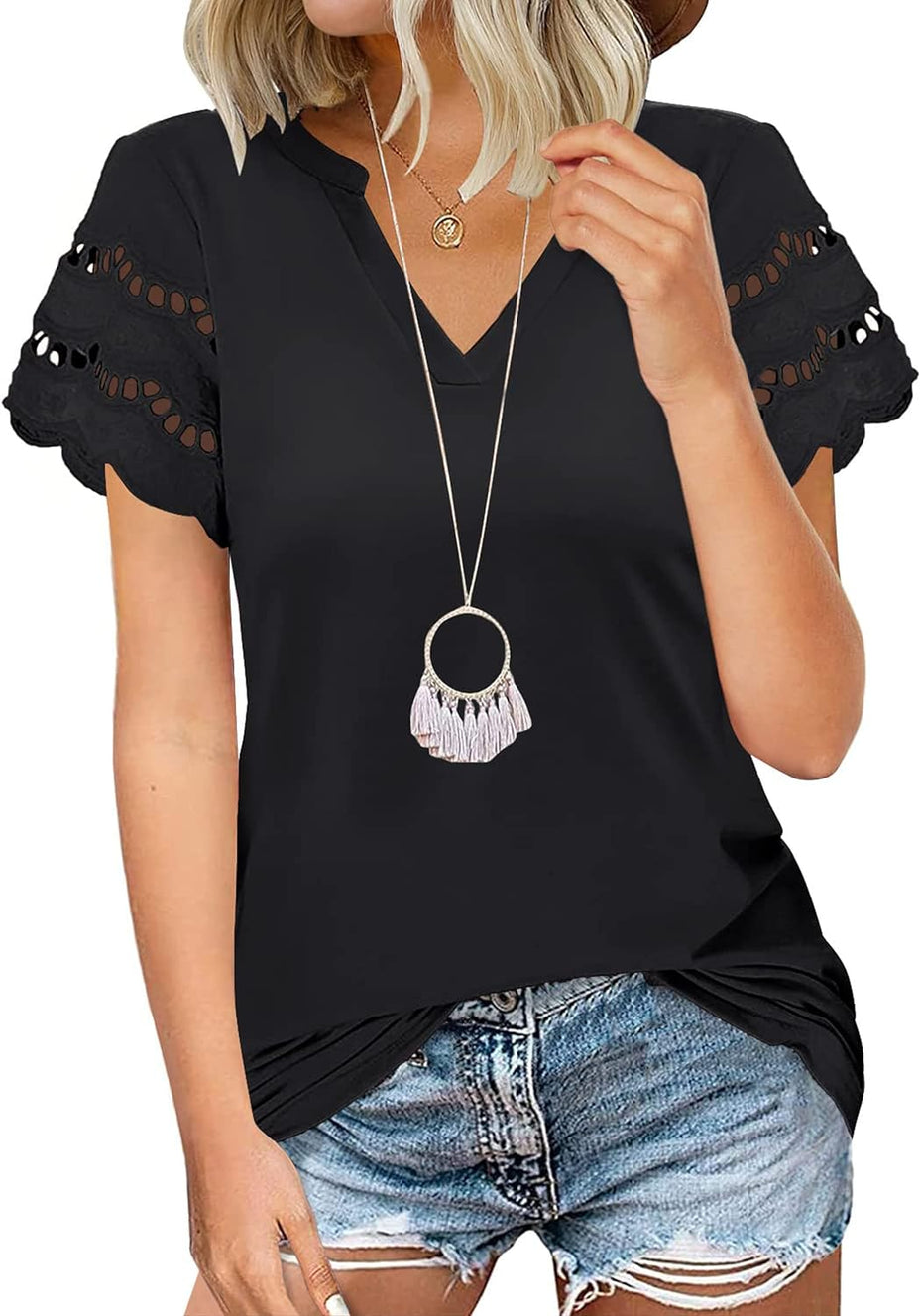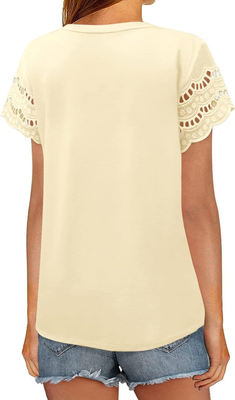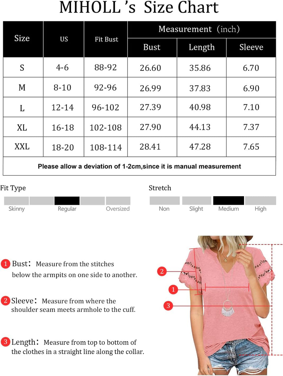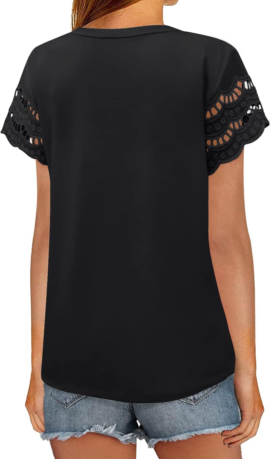 MIHOLL Women's Lace Short Sleeve V Neck Shirts Loose Casual Tops Tee Shirt