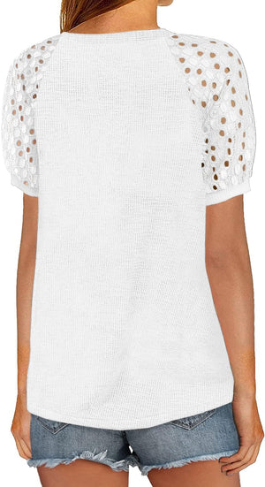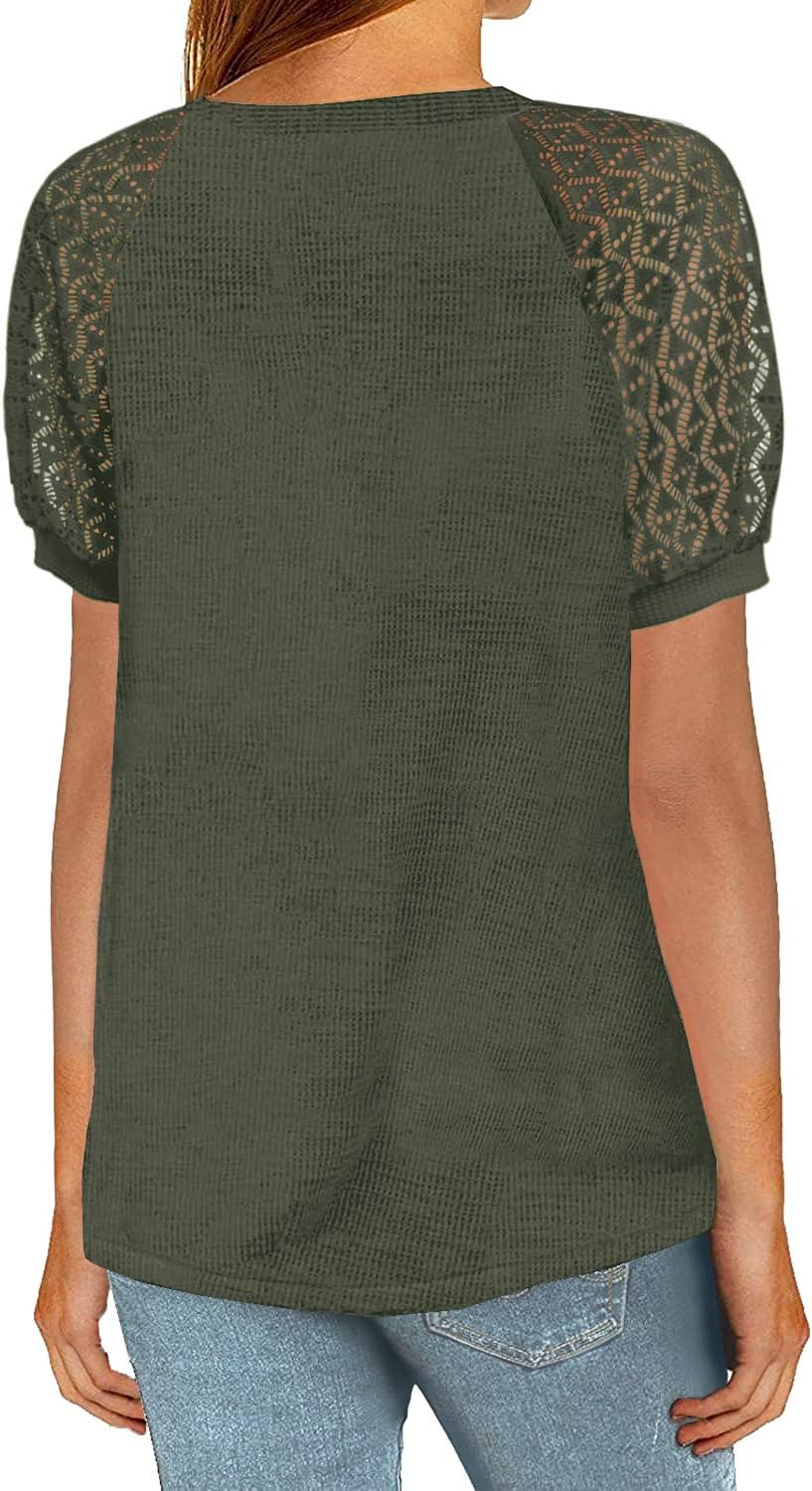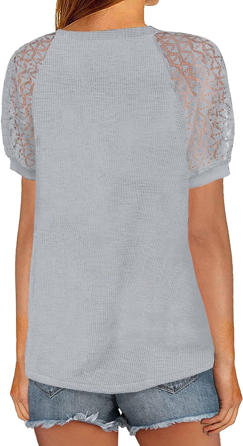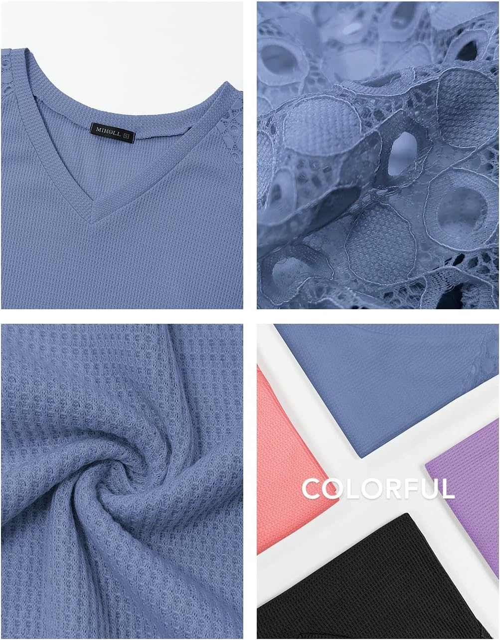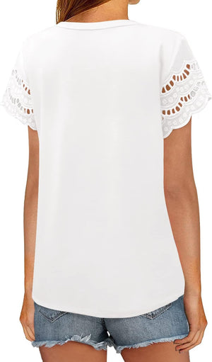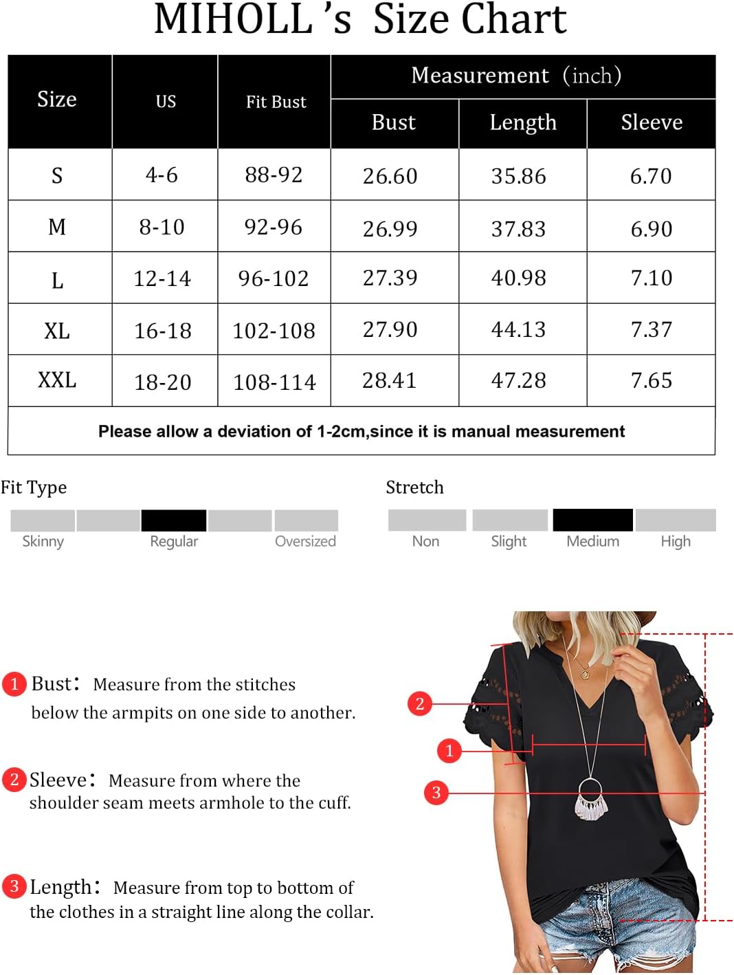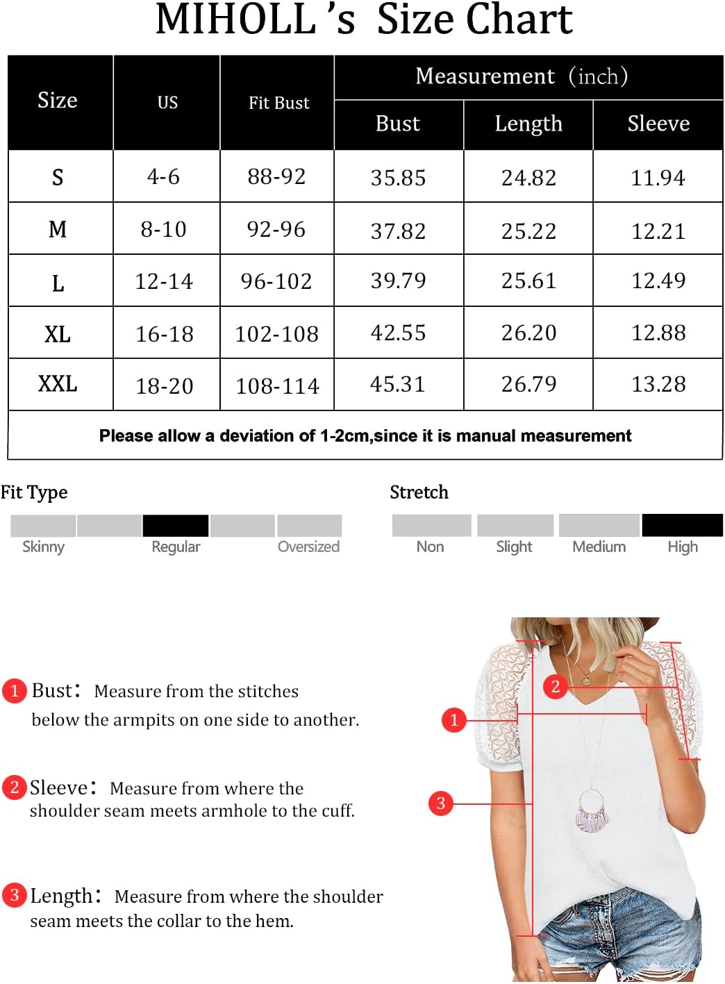MIHOLL Women's Lace Short Sleeve V Neck Shirts Loose Casual Tops Tee Shirt