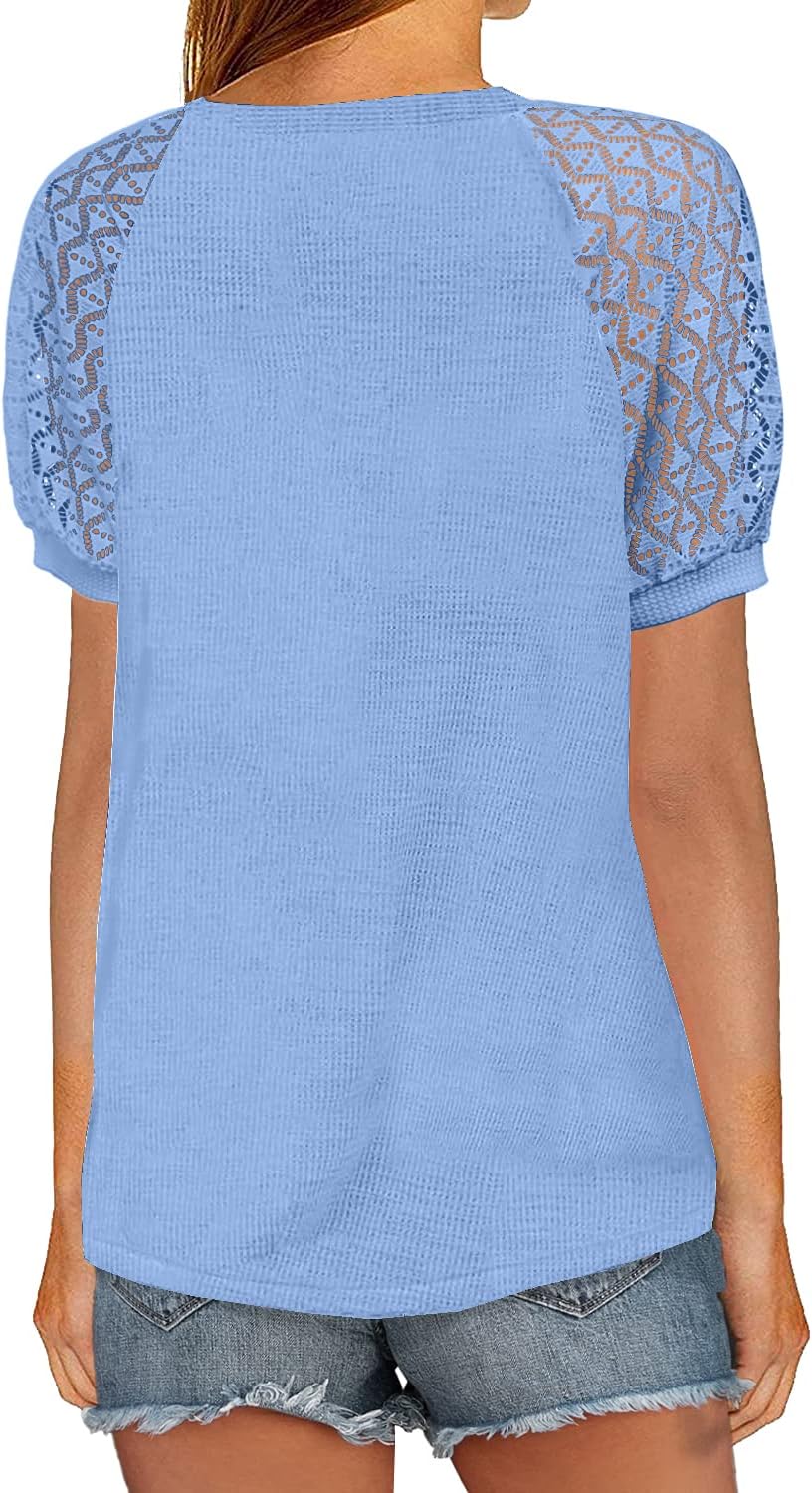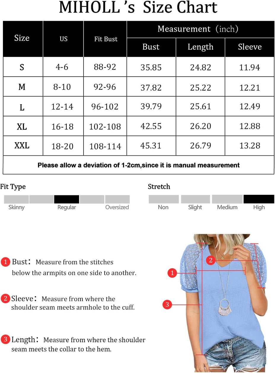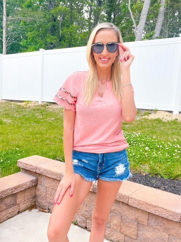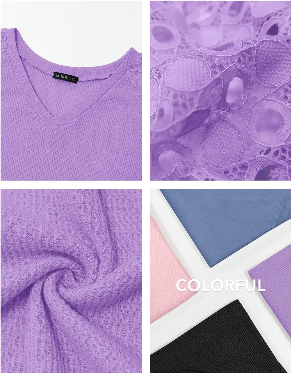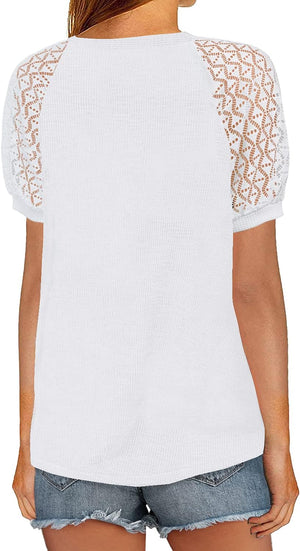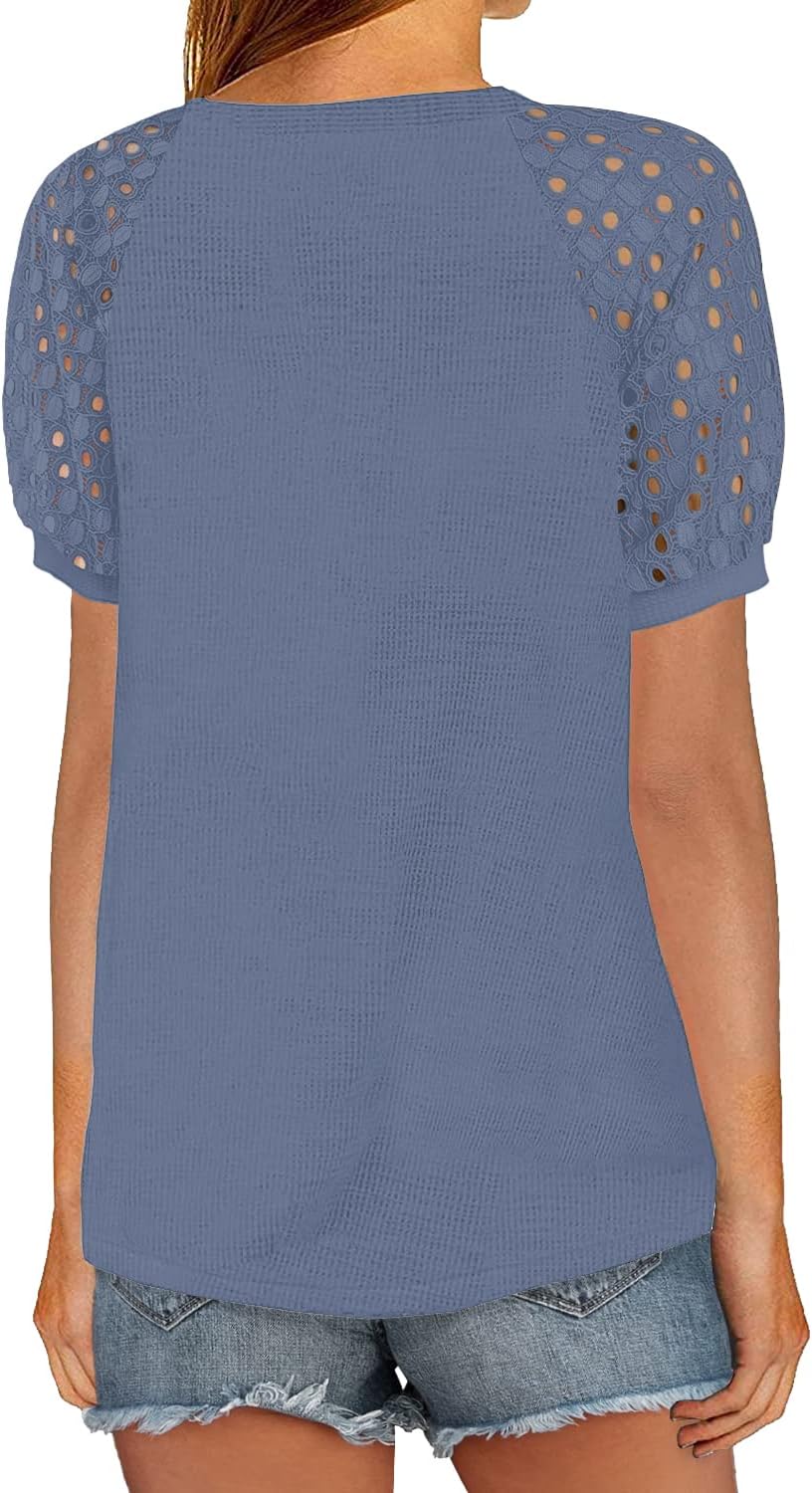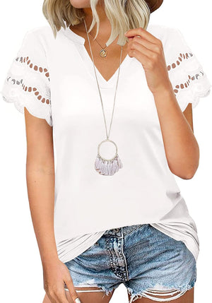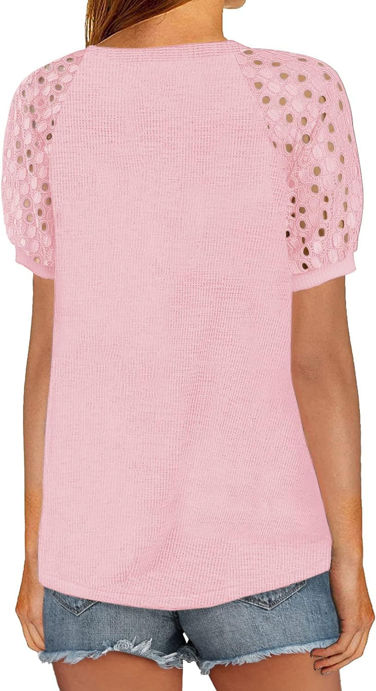 MIHOLL Women's Lace Short Sleeve V Neck Shirts Loose Casual Tops Tee Shirt