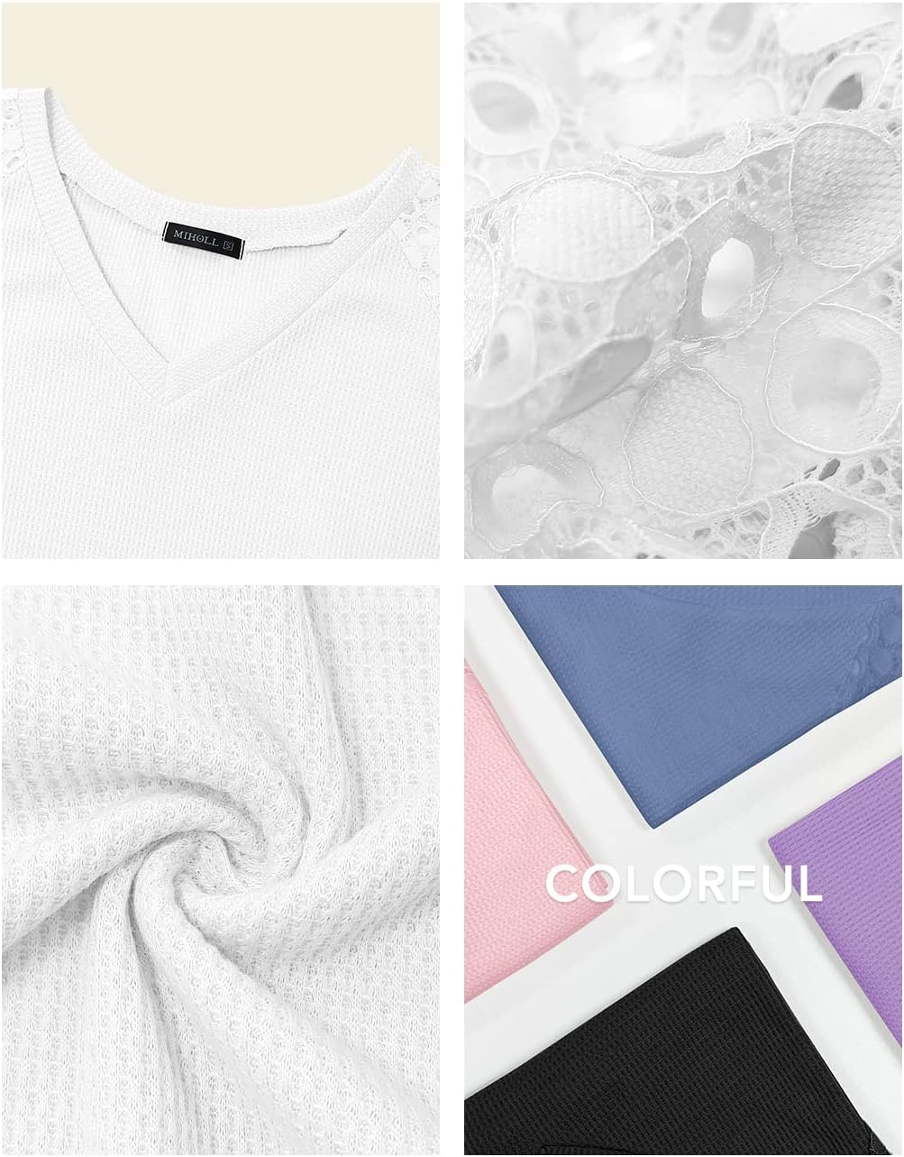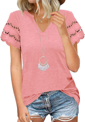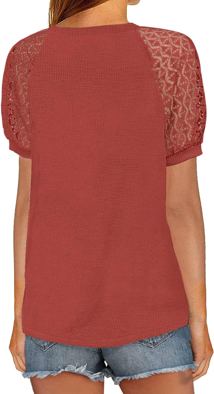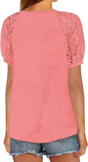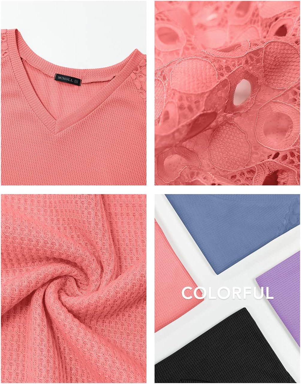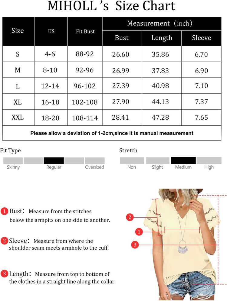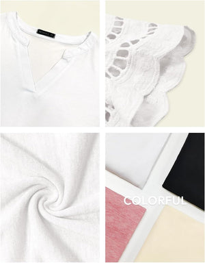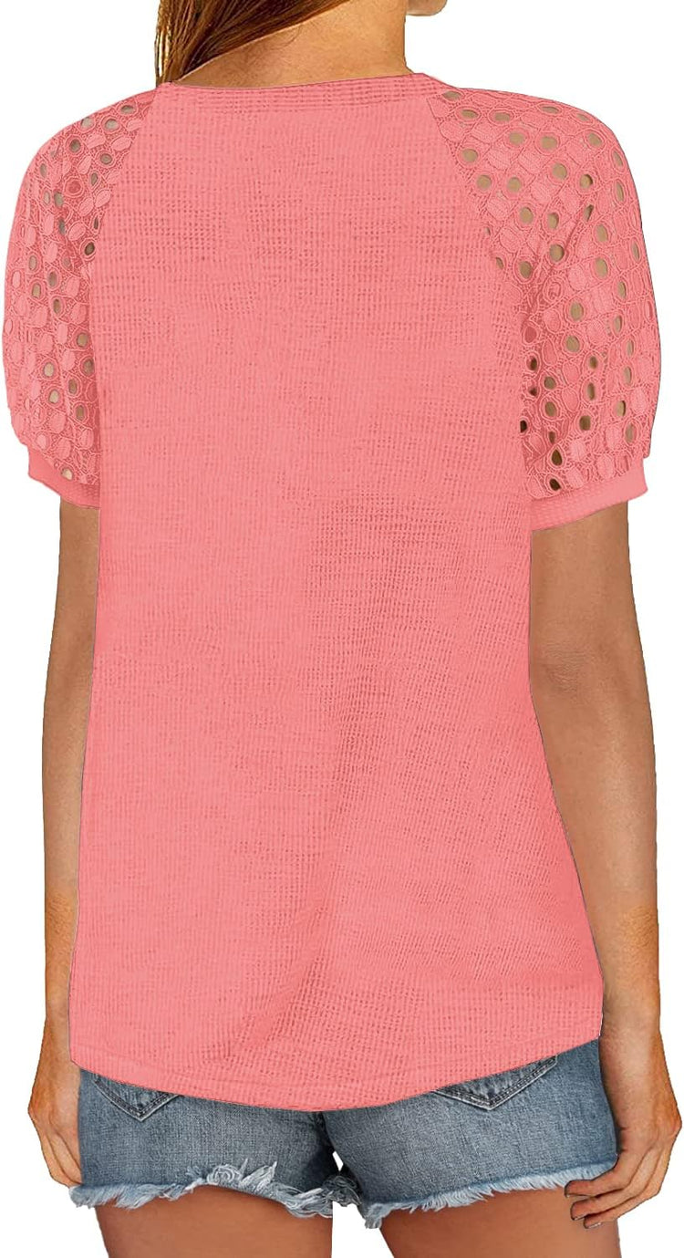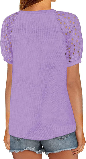 MIHOLL Women's Lace Short Sleeve V Neck Shirts Loose Casual Tops Tee Shirt