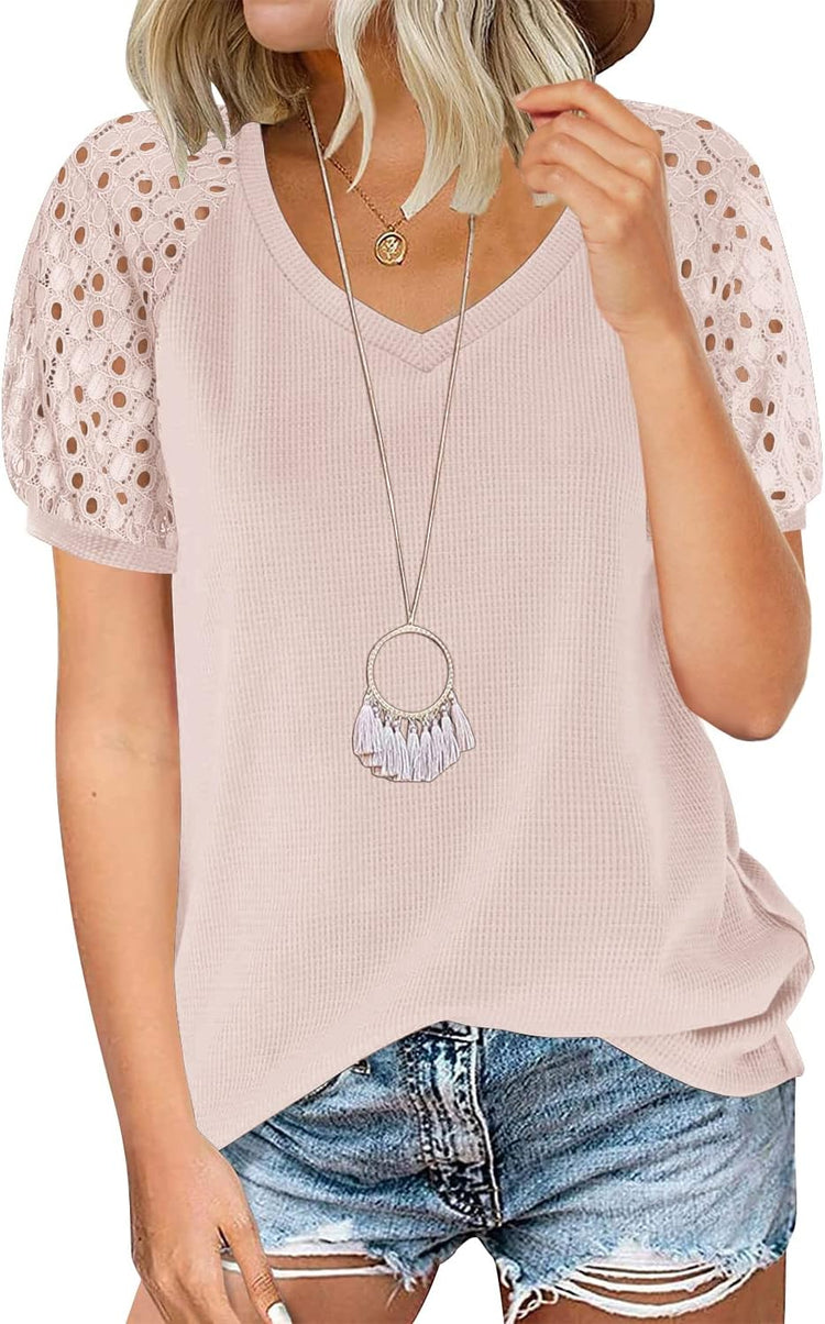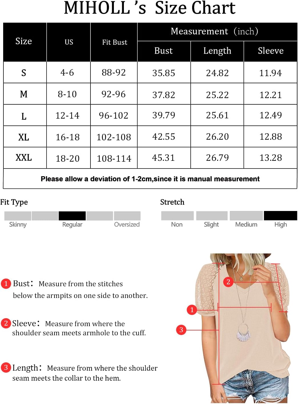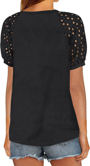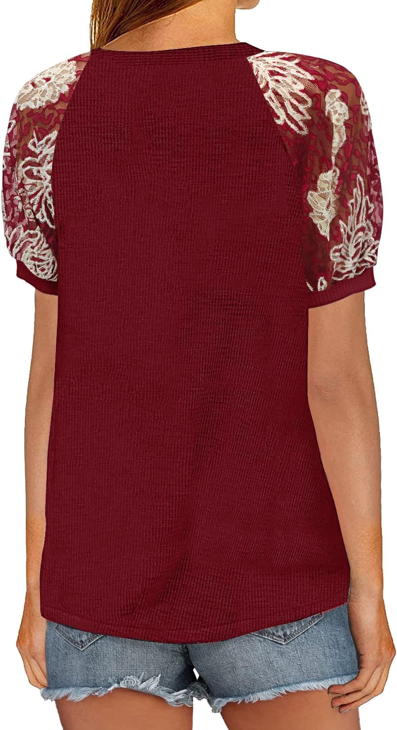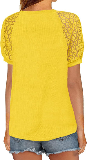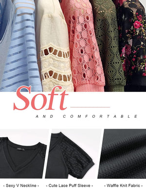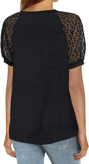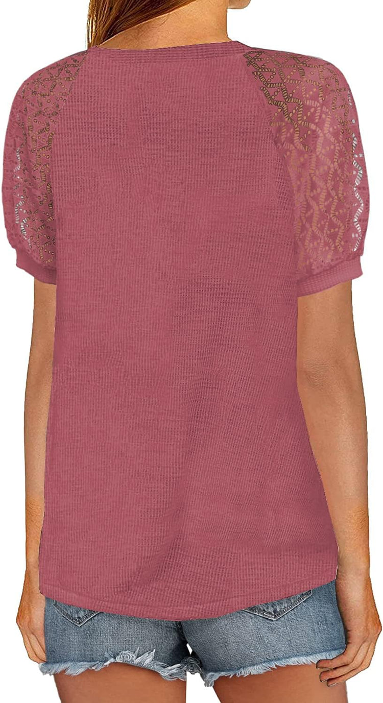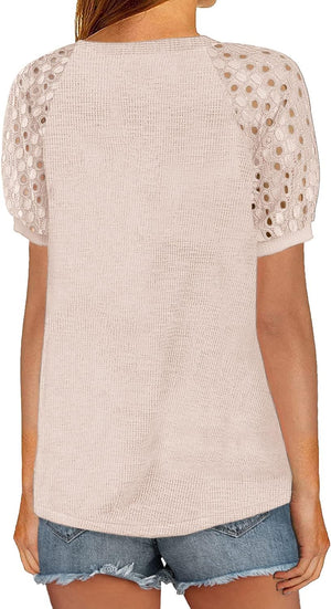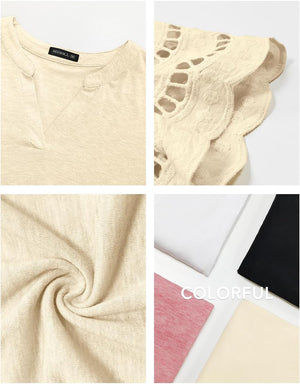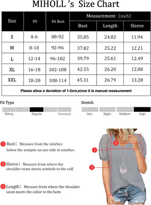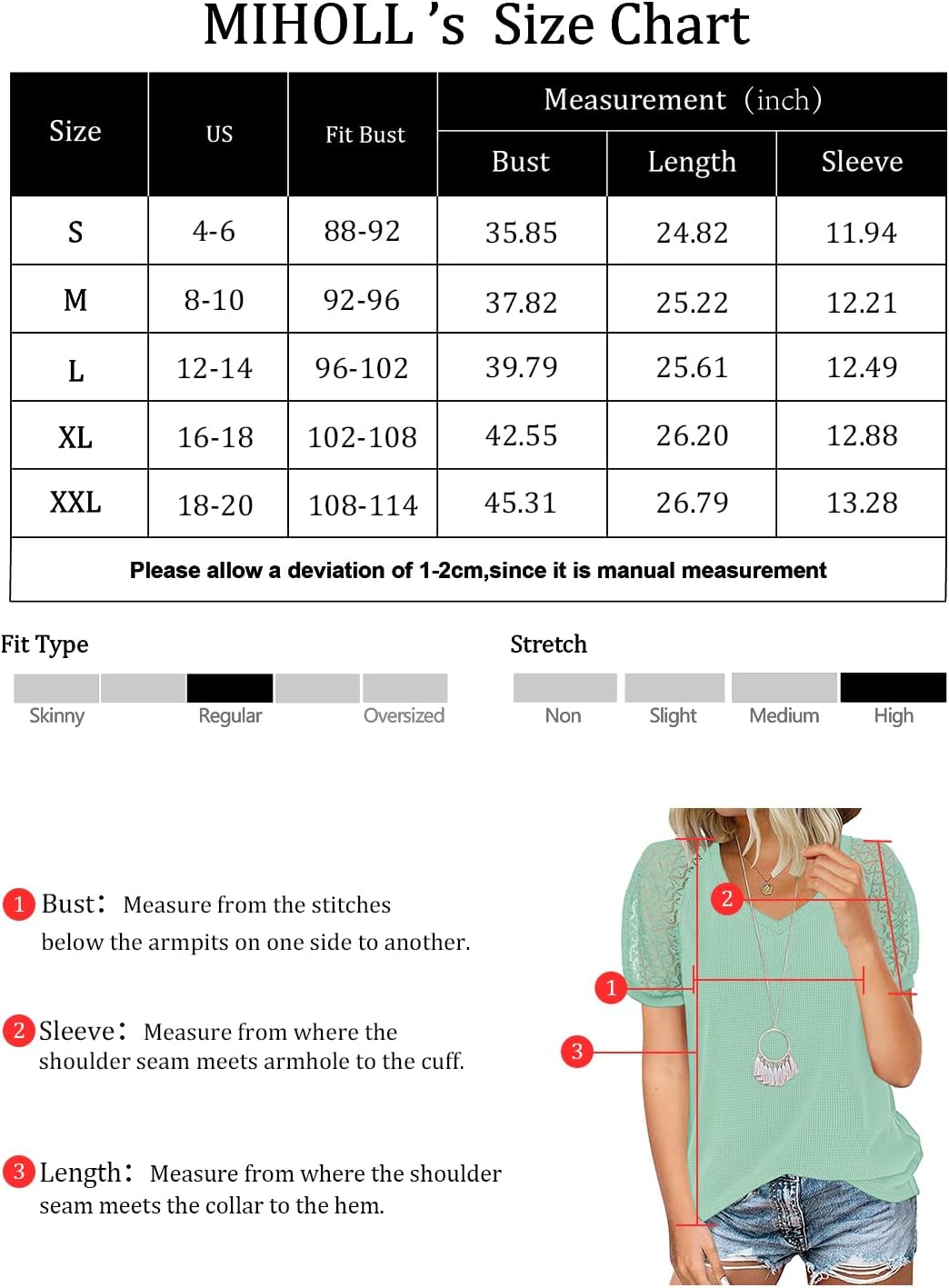 MIHOLL Women's Lace Short Sleeve V Neck Shirts Loose Casual Tops Tee Shirt