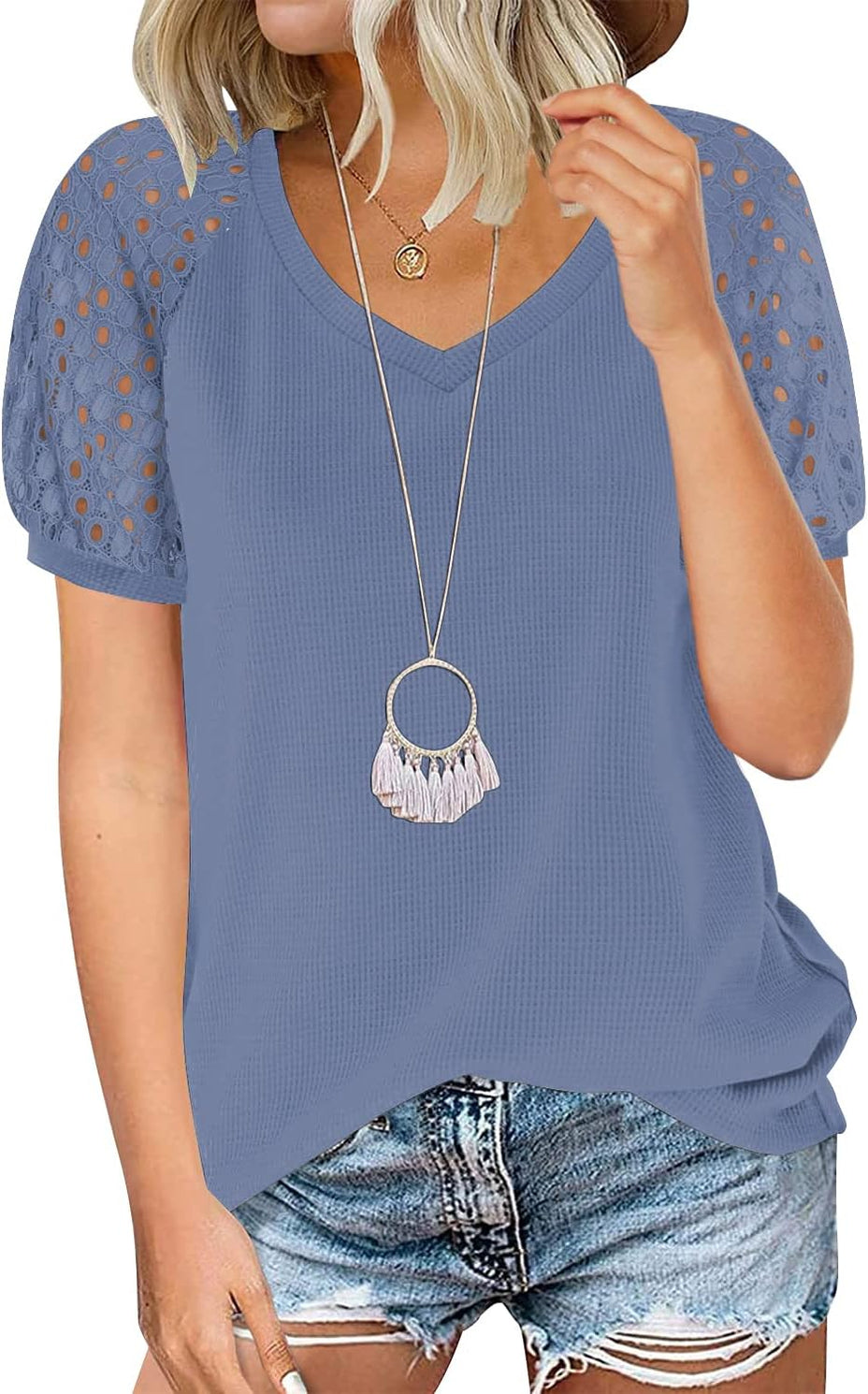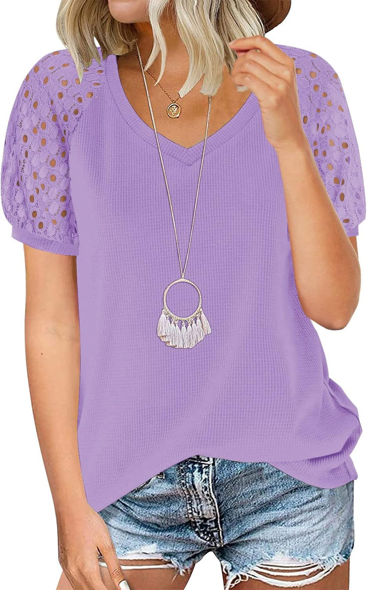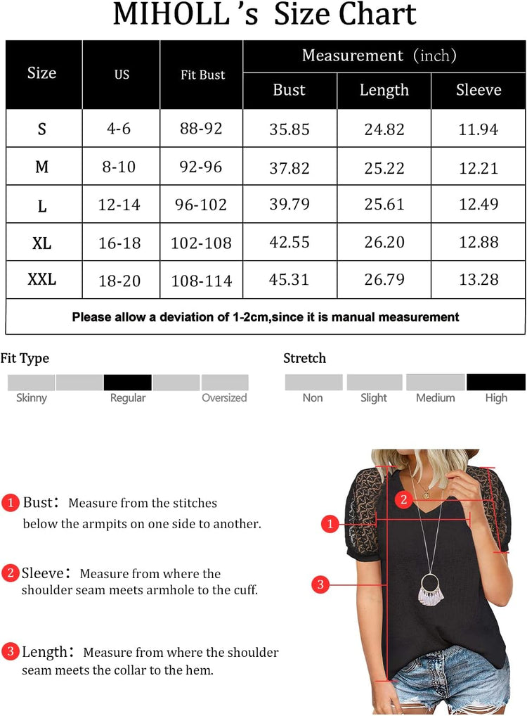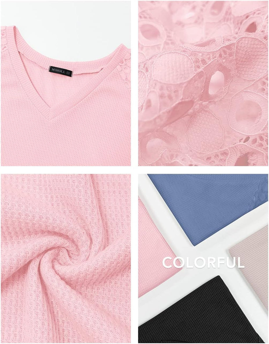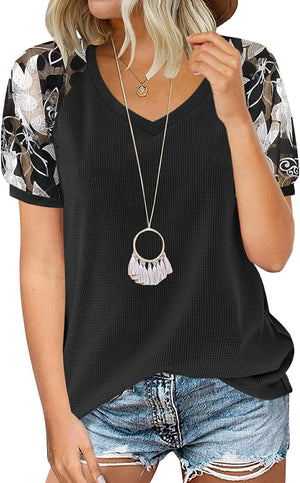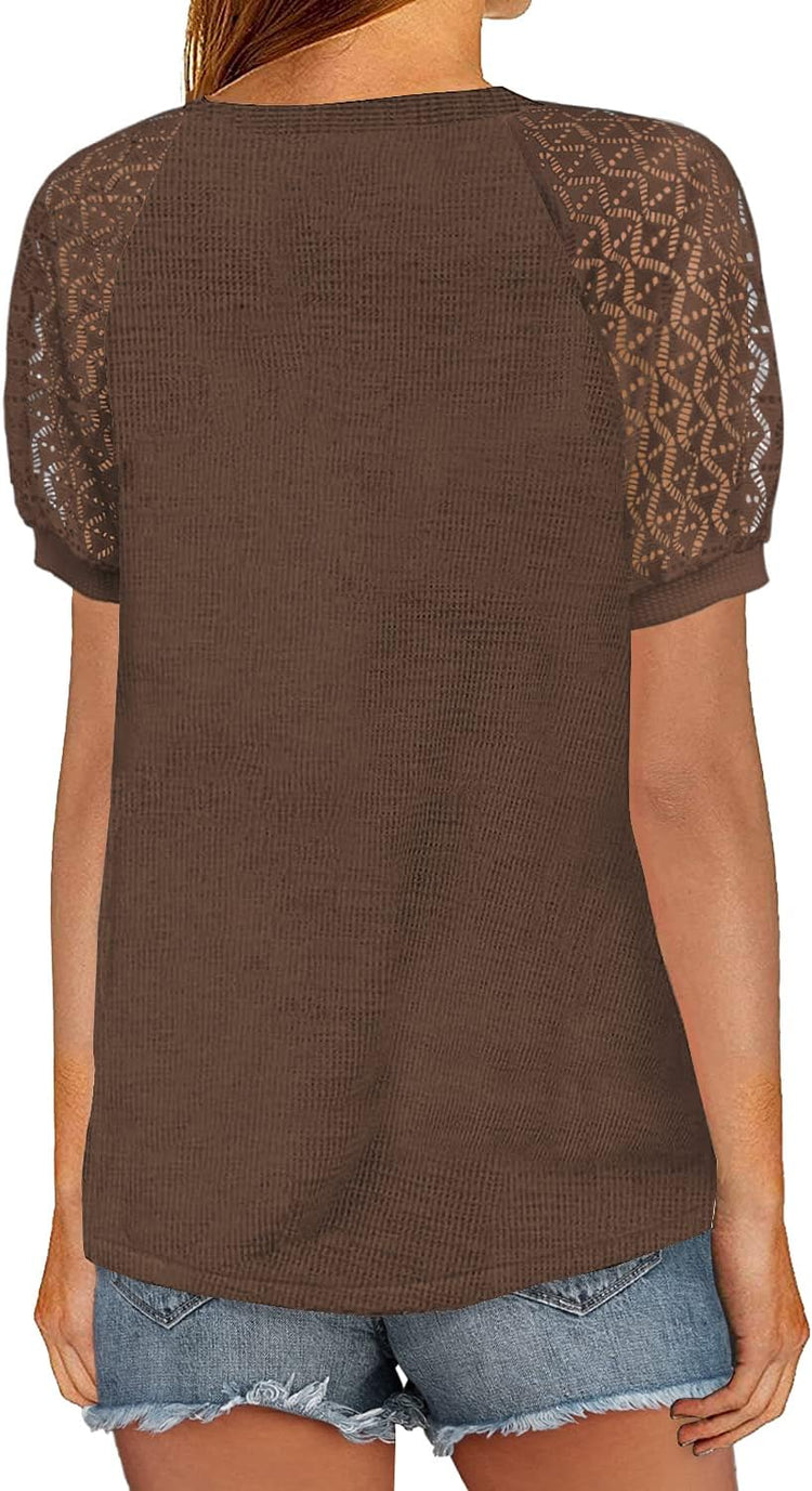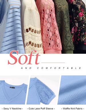 MIHOLL Women's Lace Short Sleeve V Neck Shirts Loose Casual Tops Tee Shirt