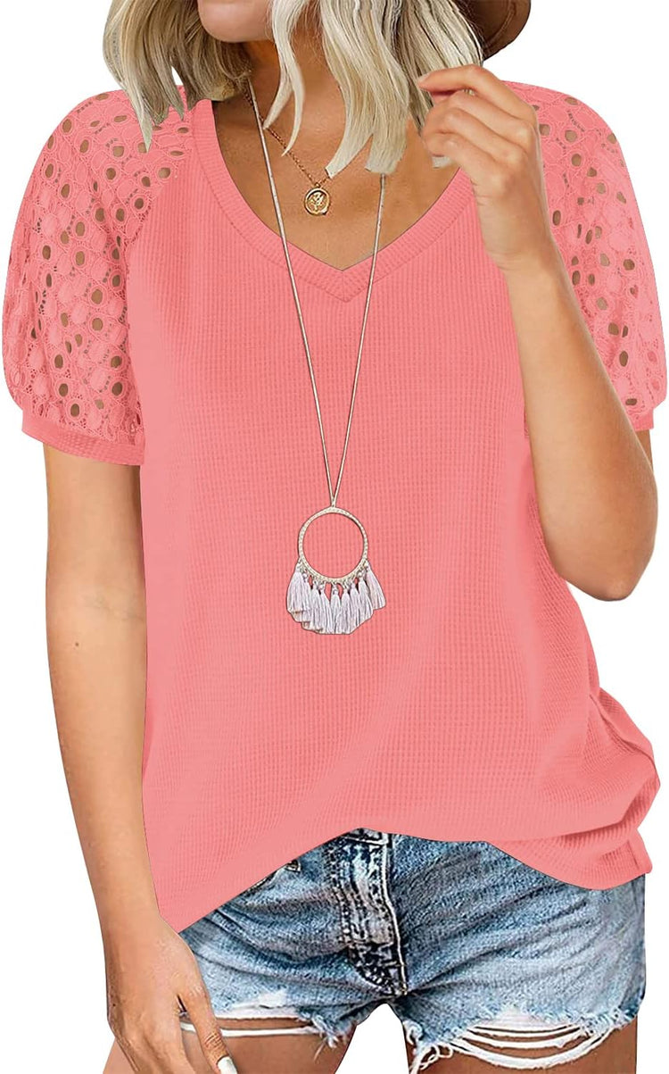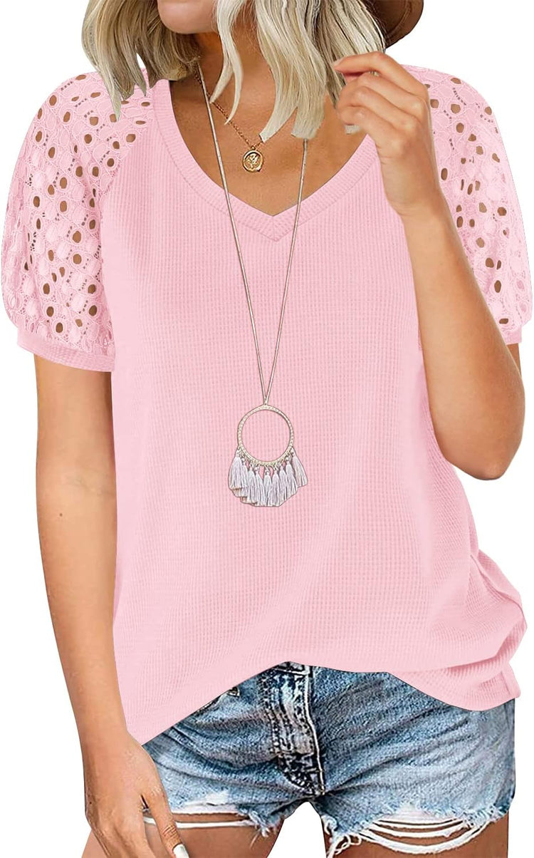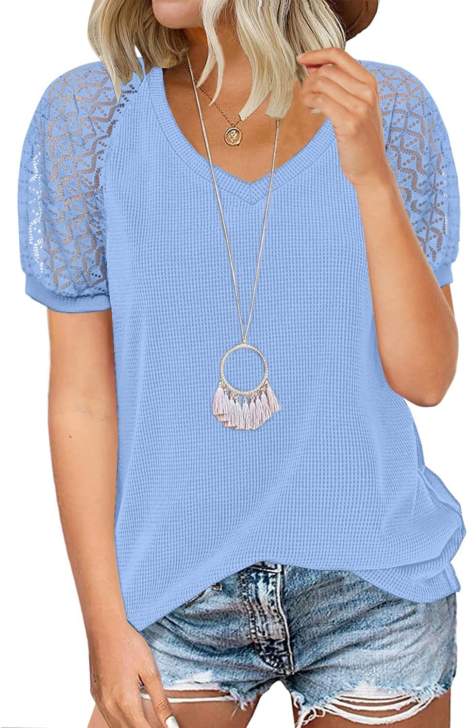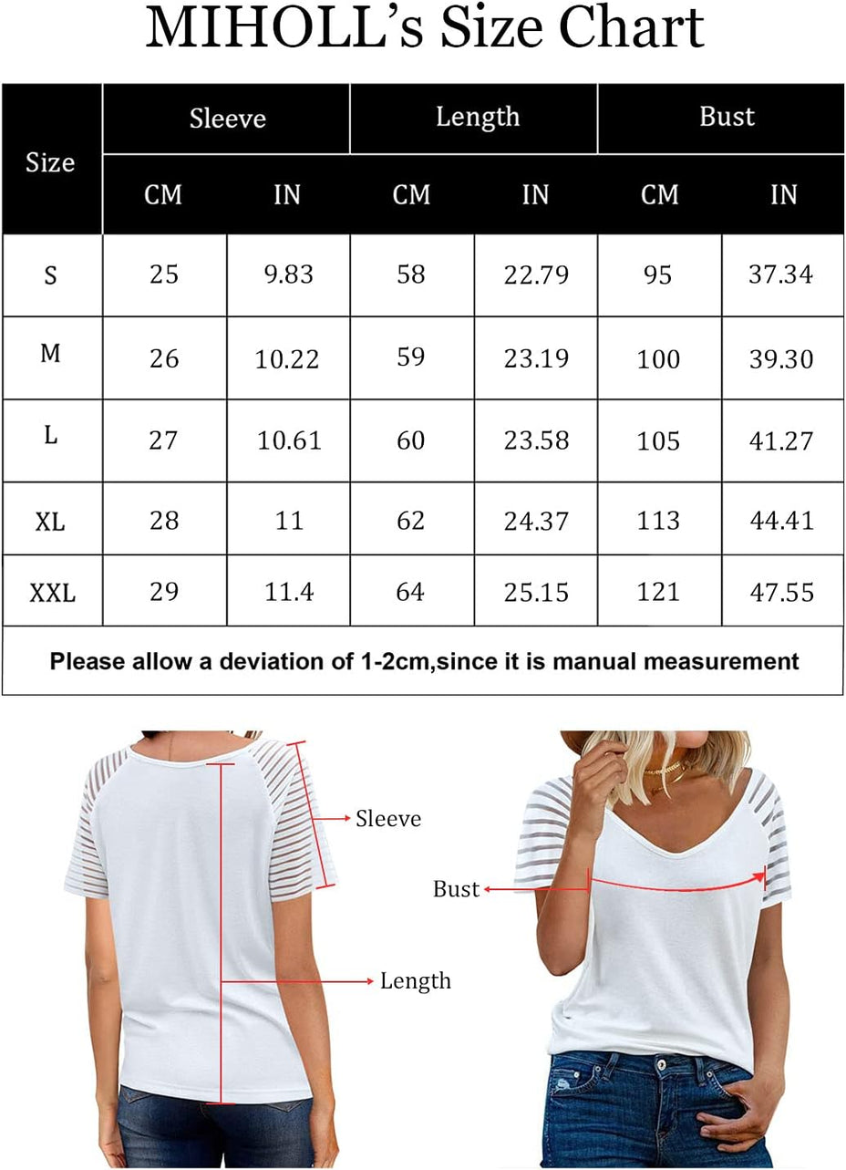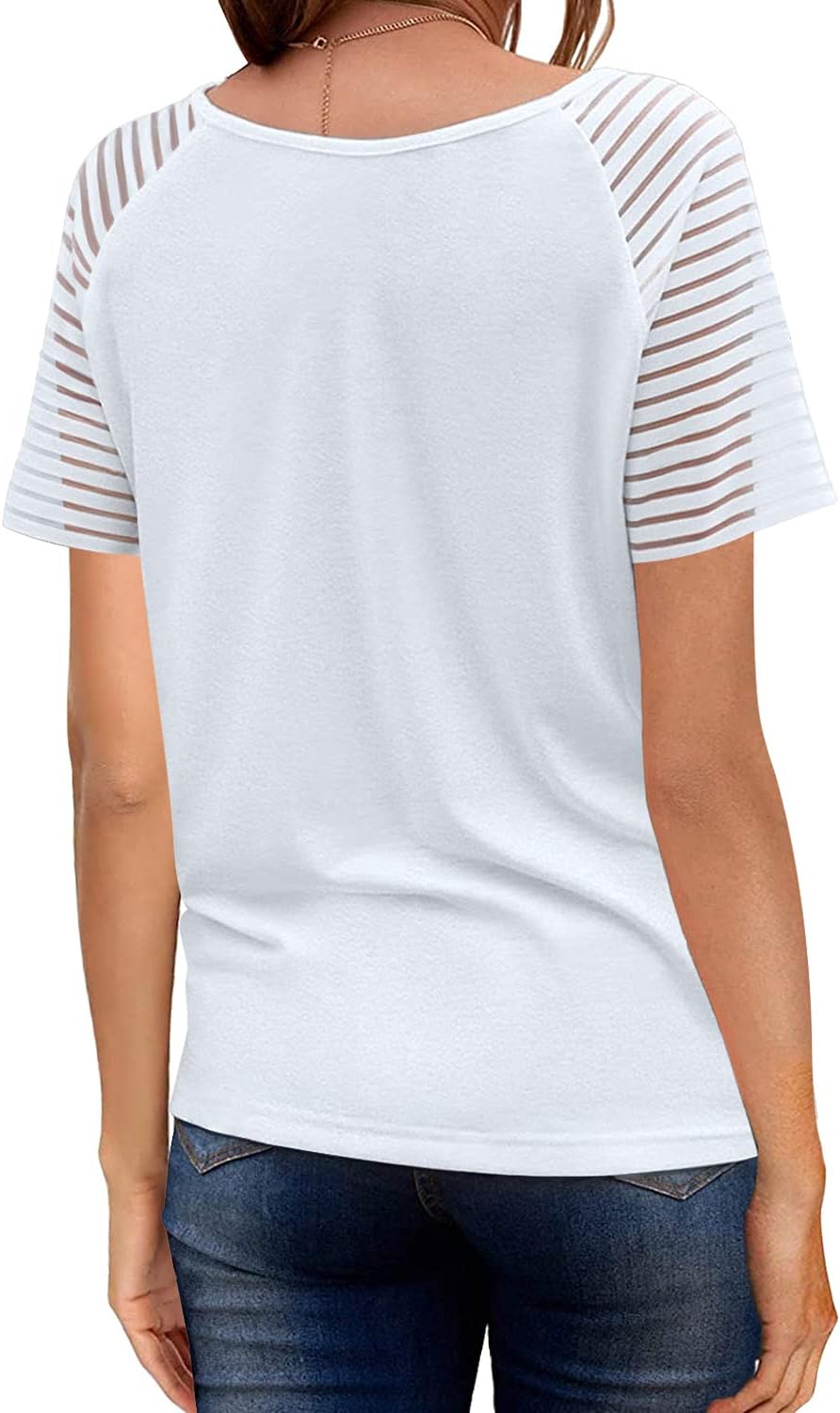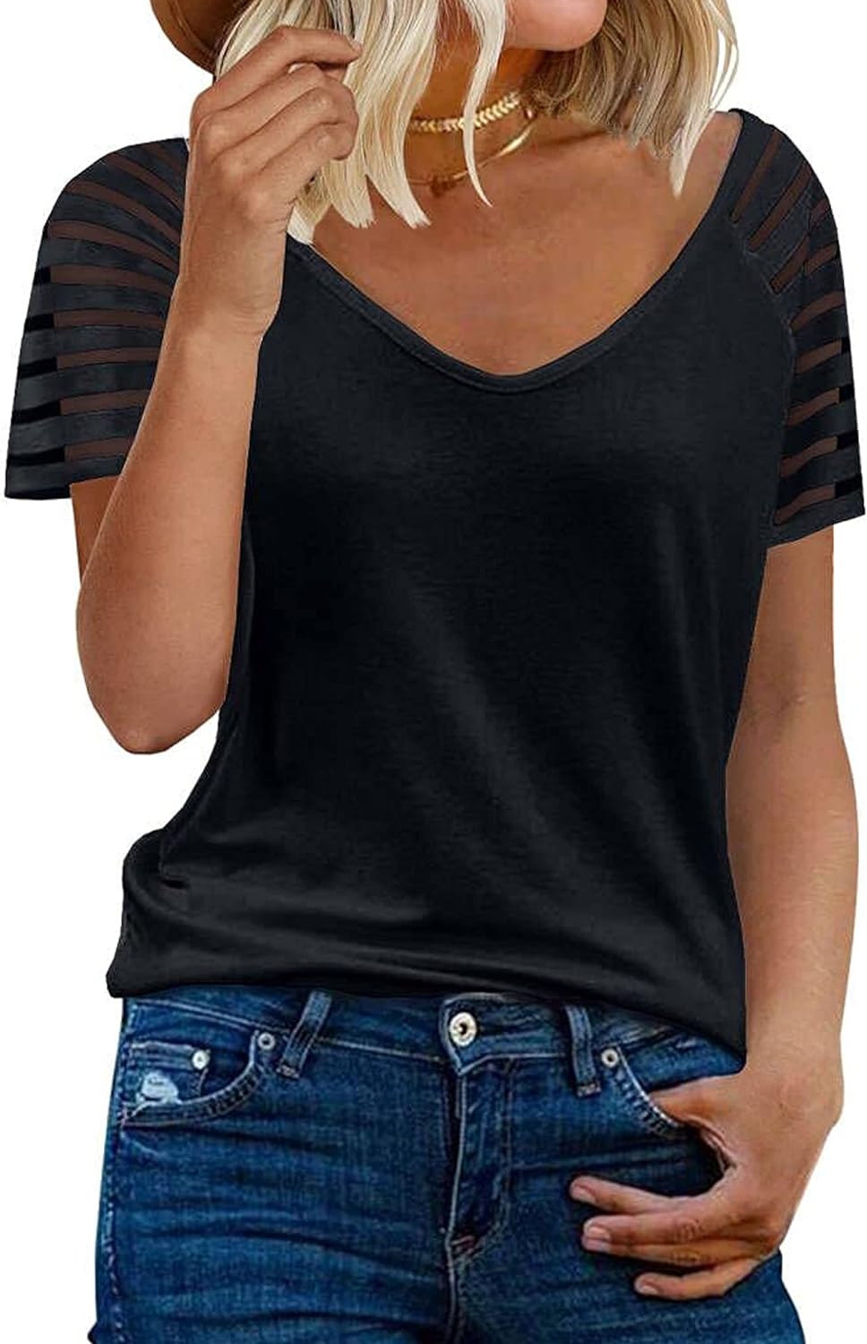 MIHOLL Women's Lace Short Sleeve V Neck Shirts Loose Casual Tops Tee Shirt