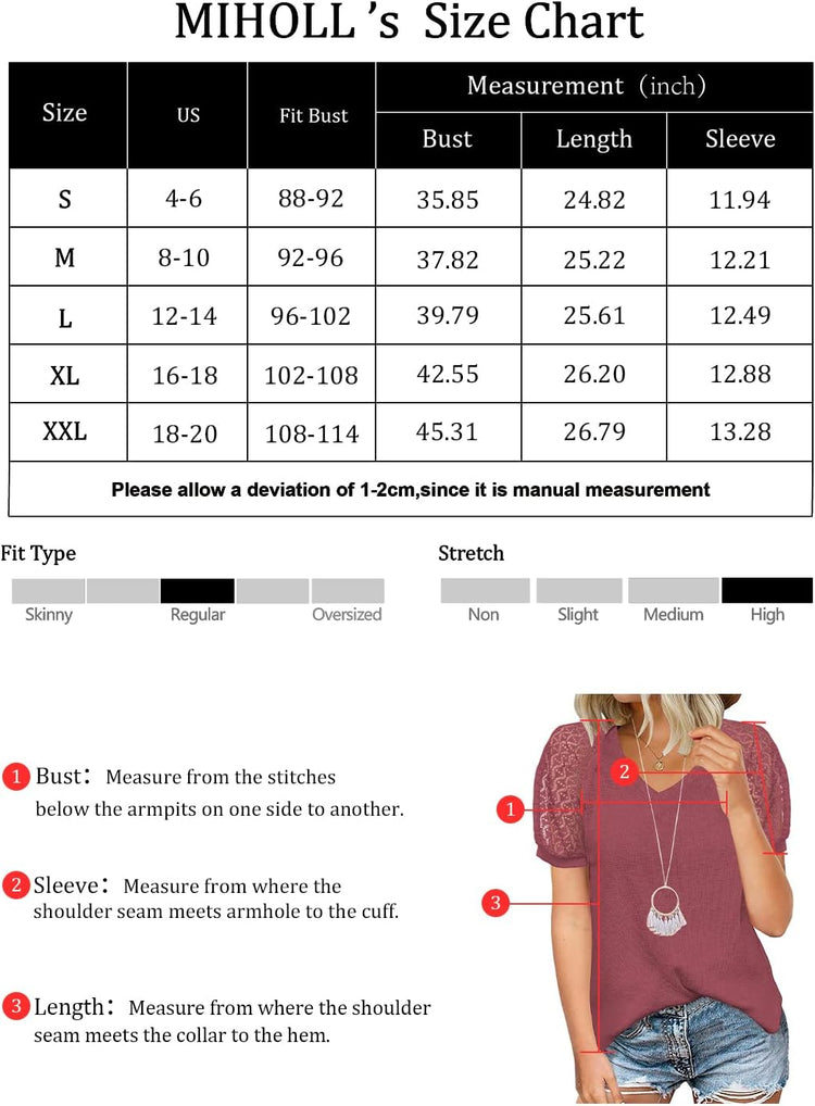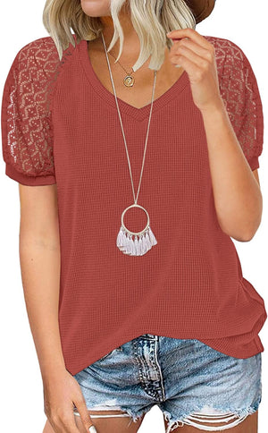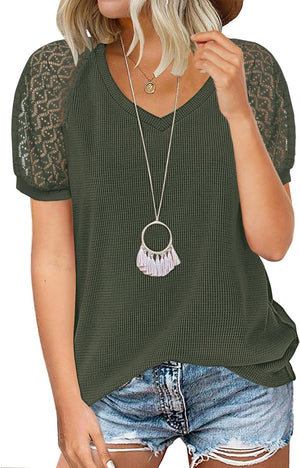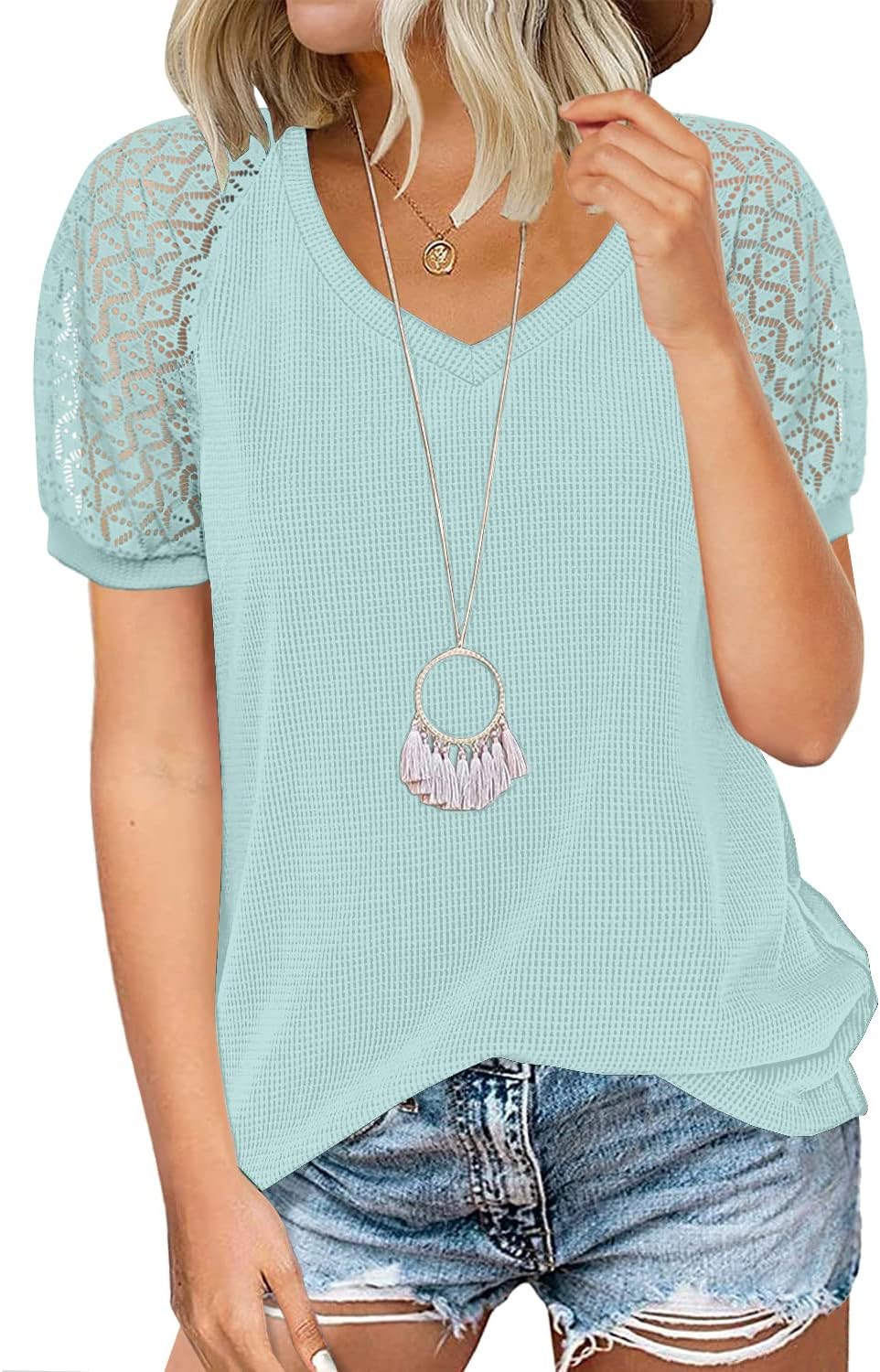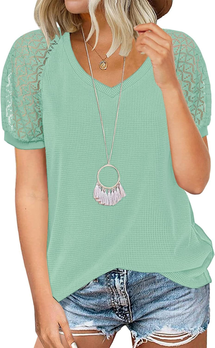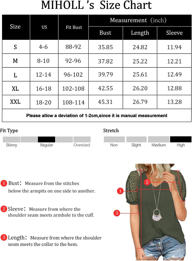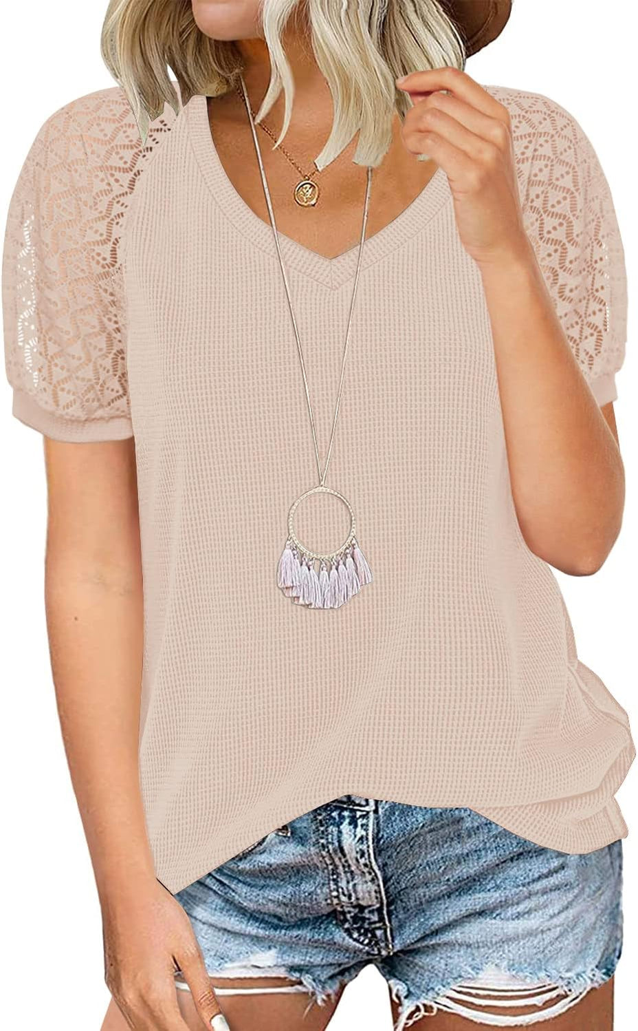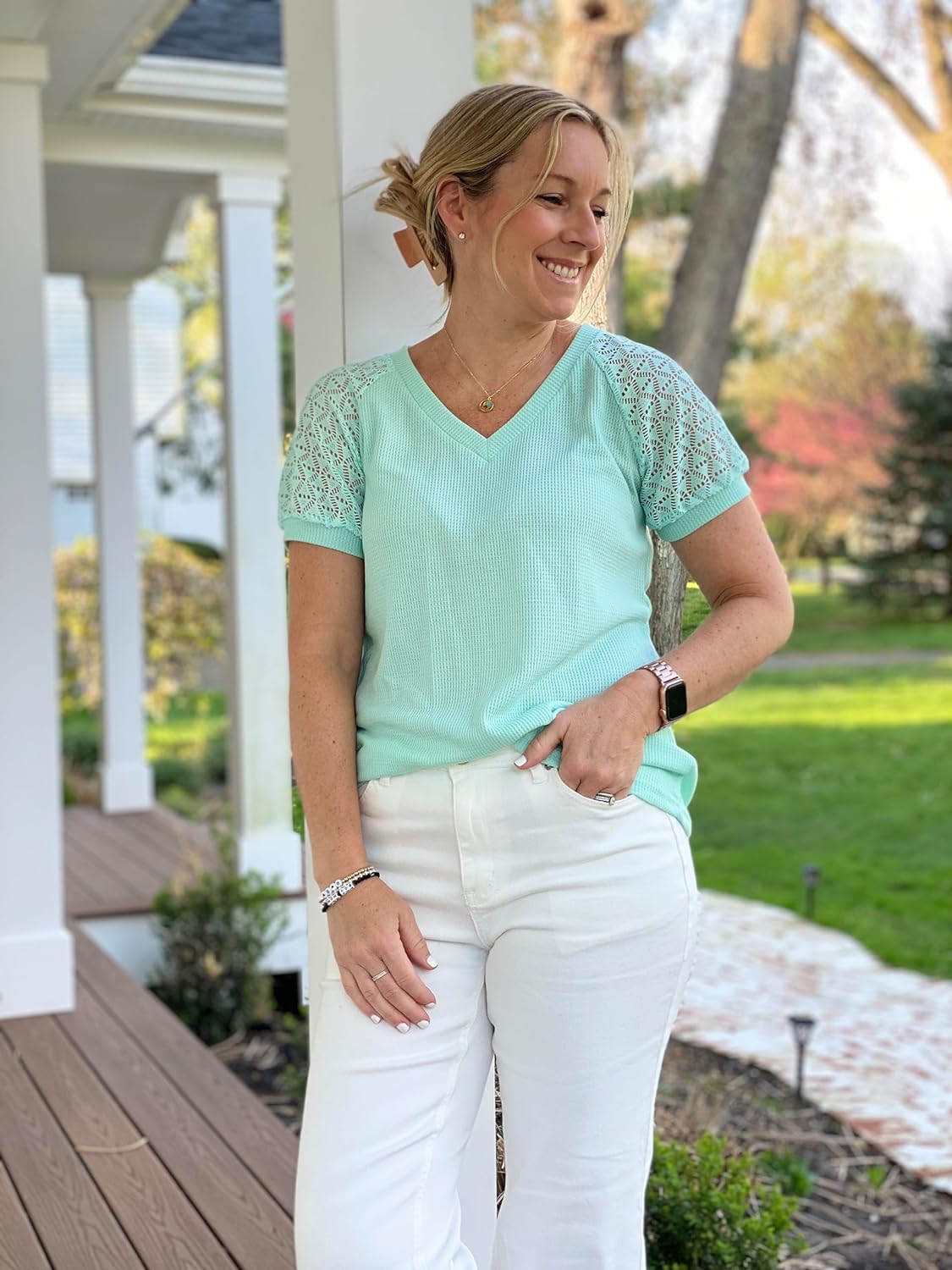 MIHOLL Women's Lace Short Sleeve V Neck Shirts Loose Casual Tops Tee Shirt