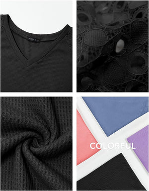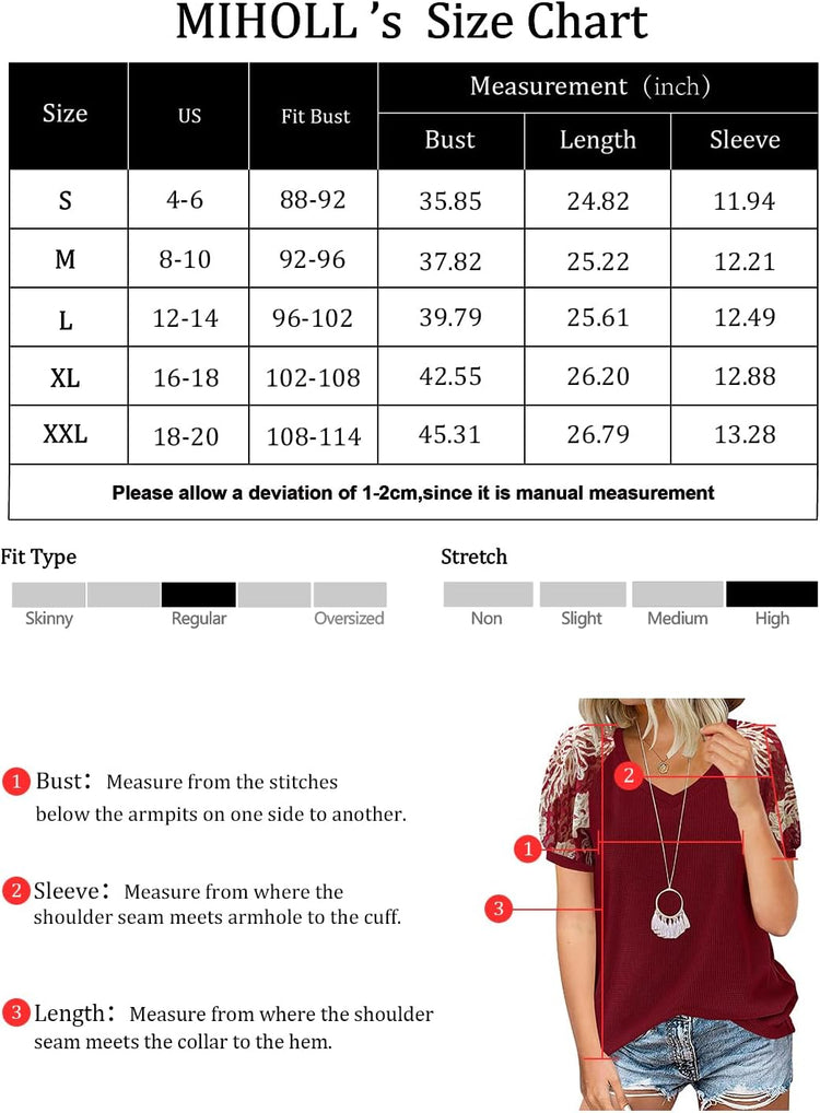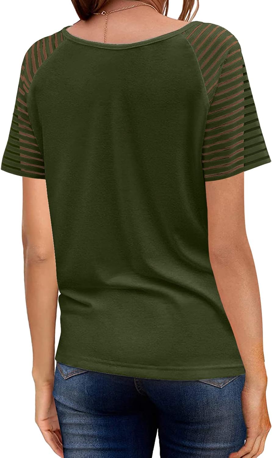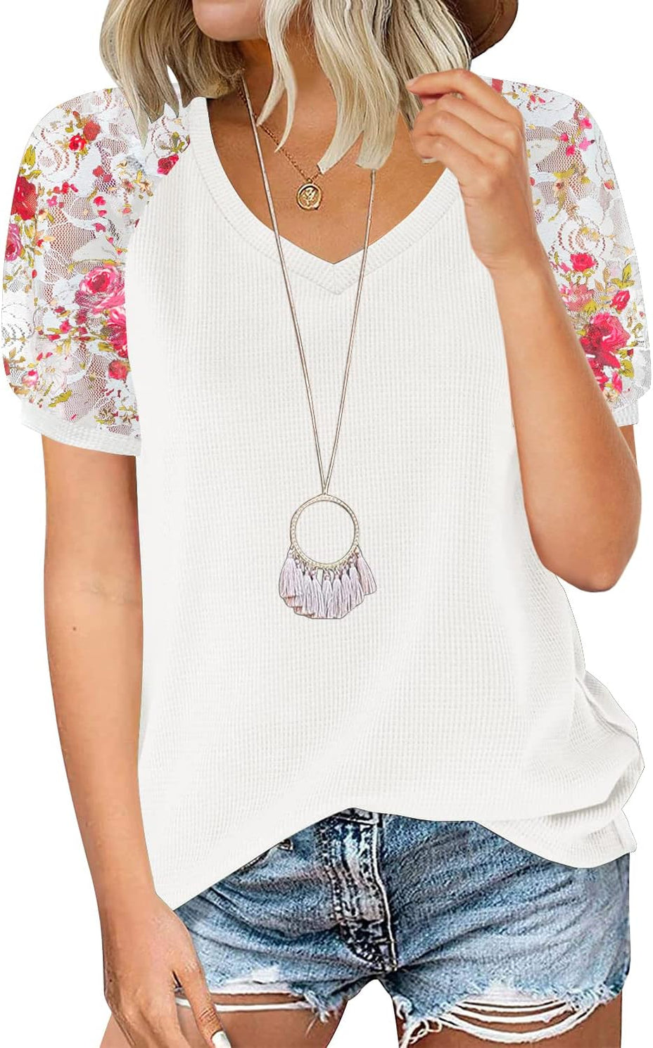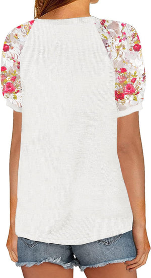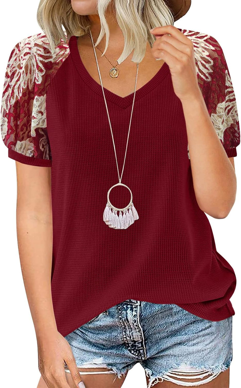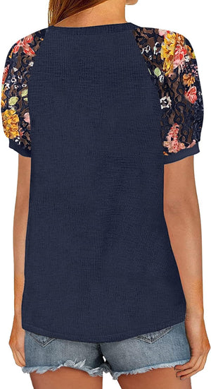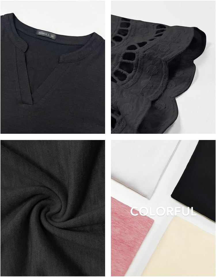 MIHOLL Women's Lace Short Sleeve V Neck Shirts Loose Casual Tops Tee Shirt