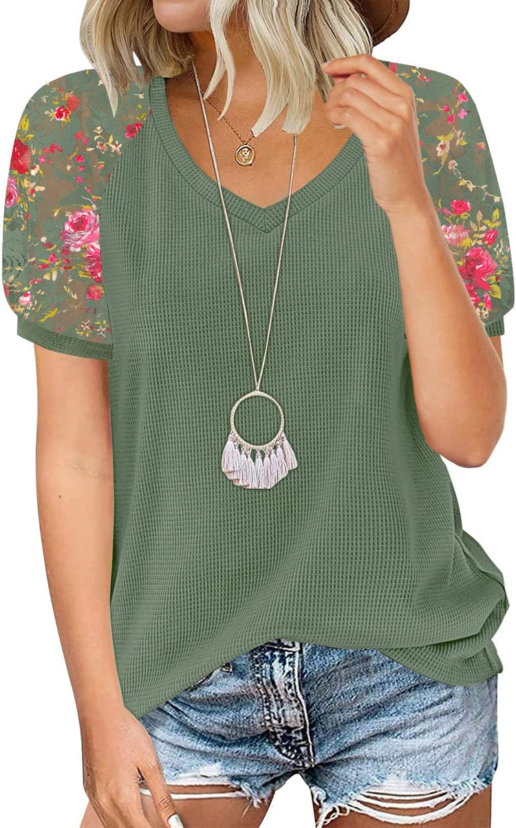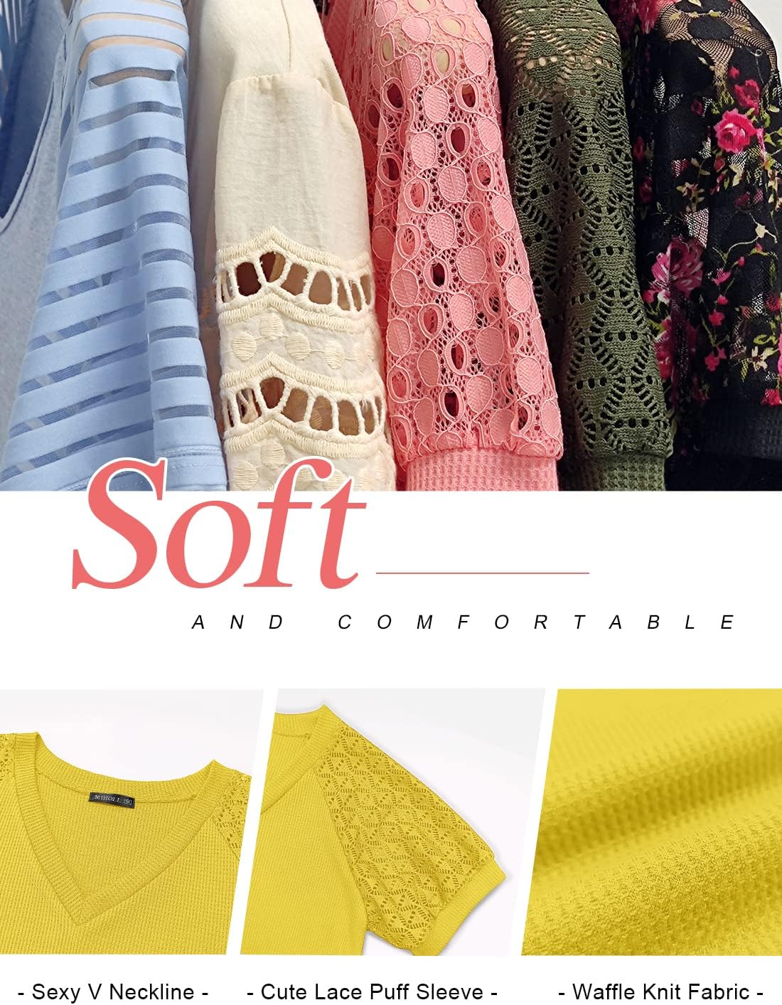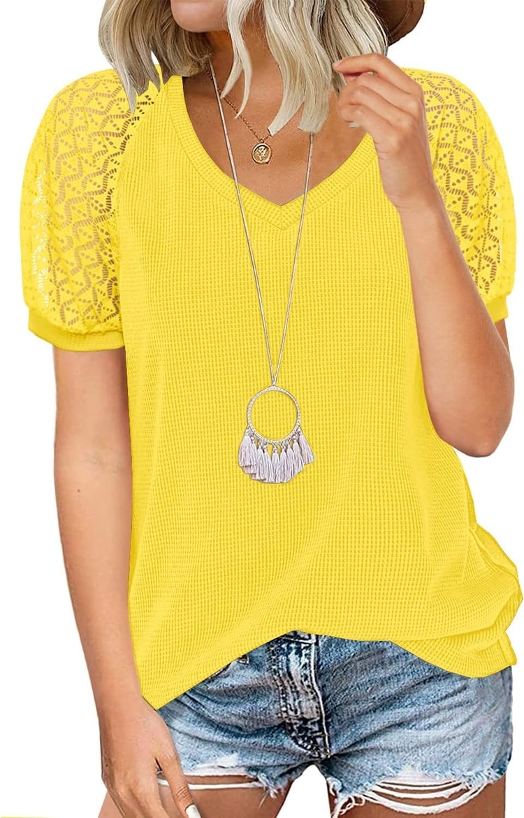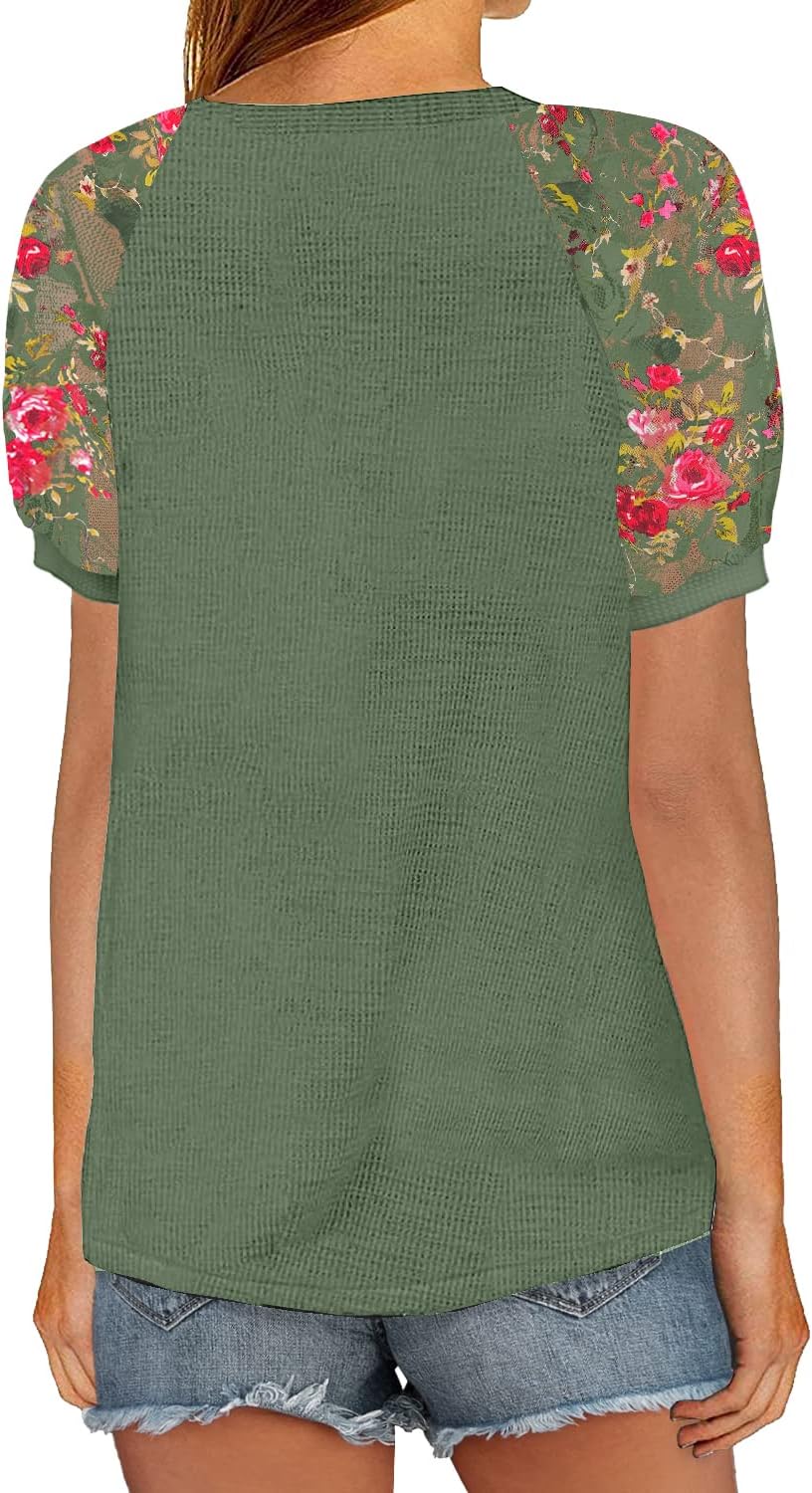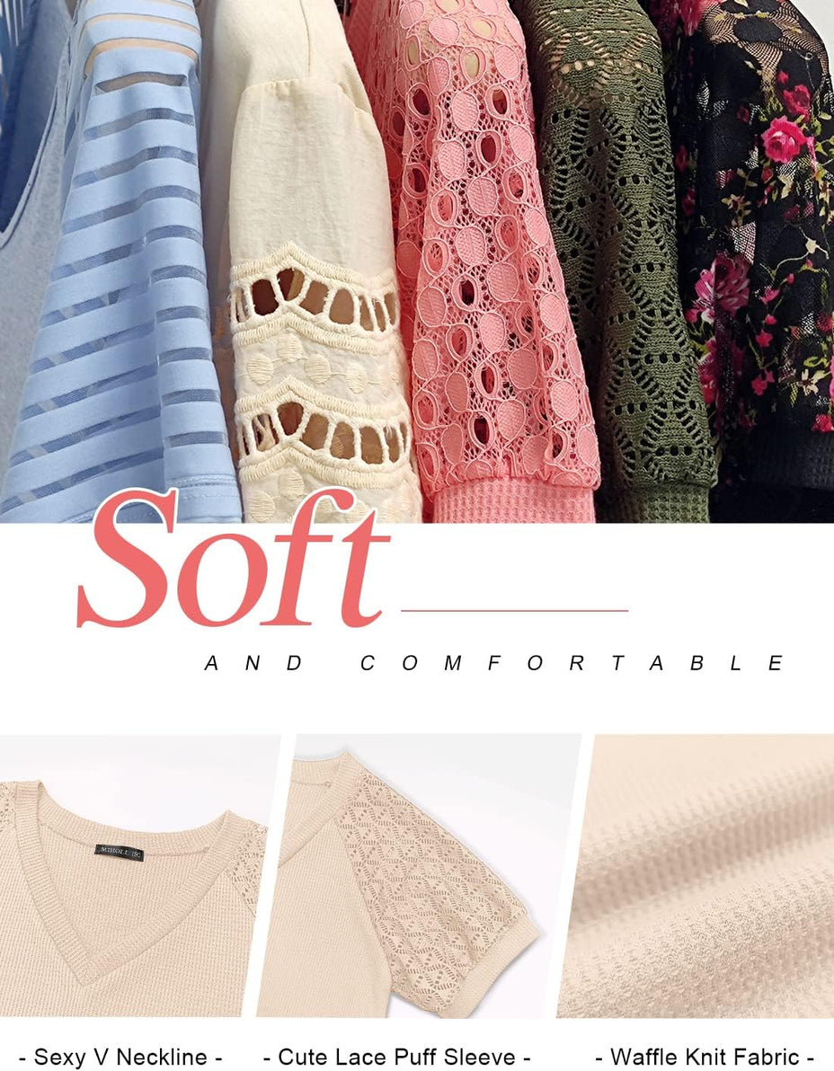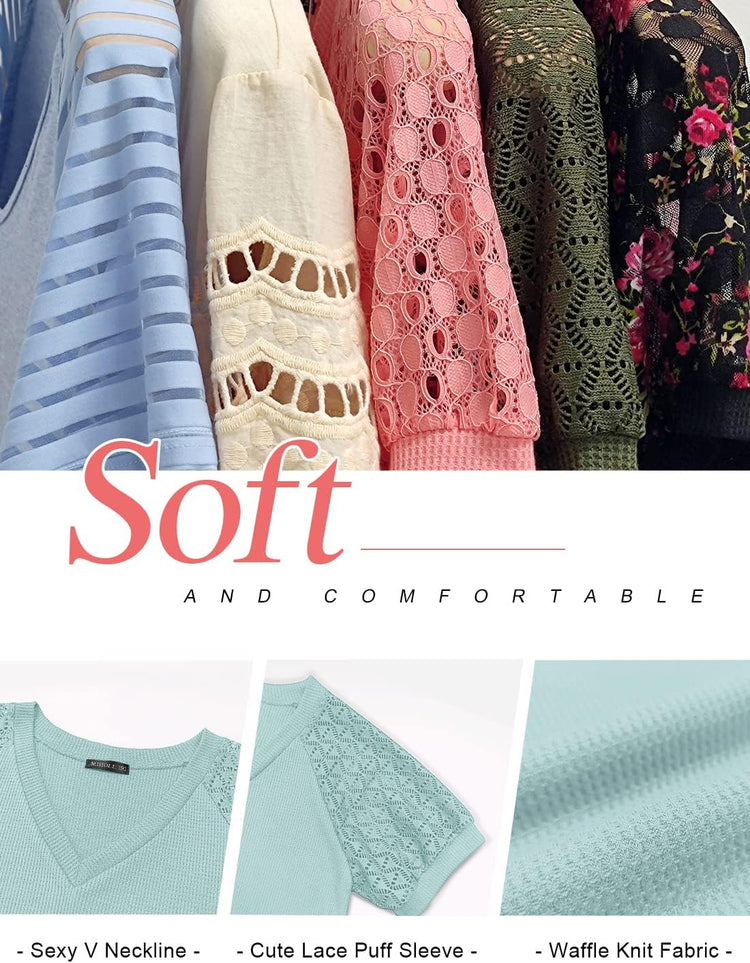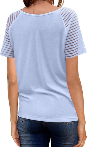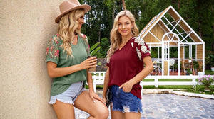 MIHOLL Women's Lace Short Sleeve V Neck Shirts Loose Casual Tops Tee Shirt