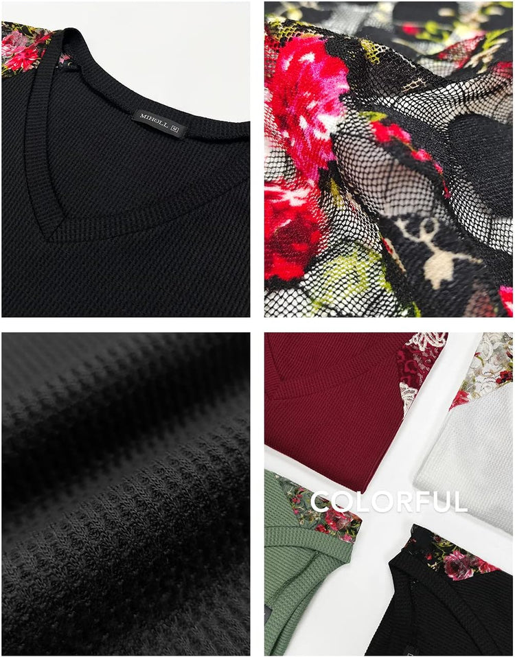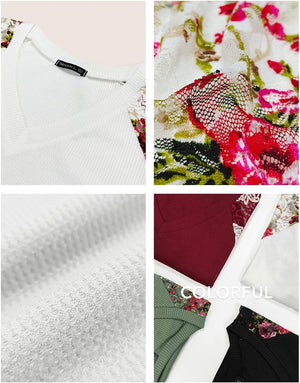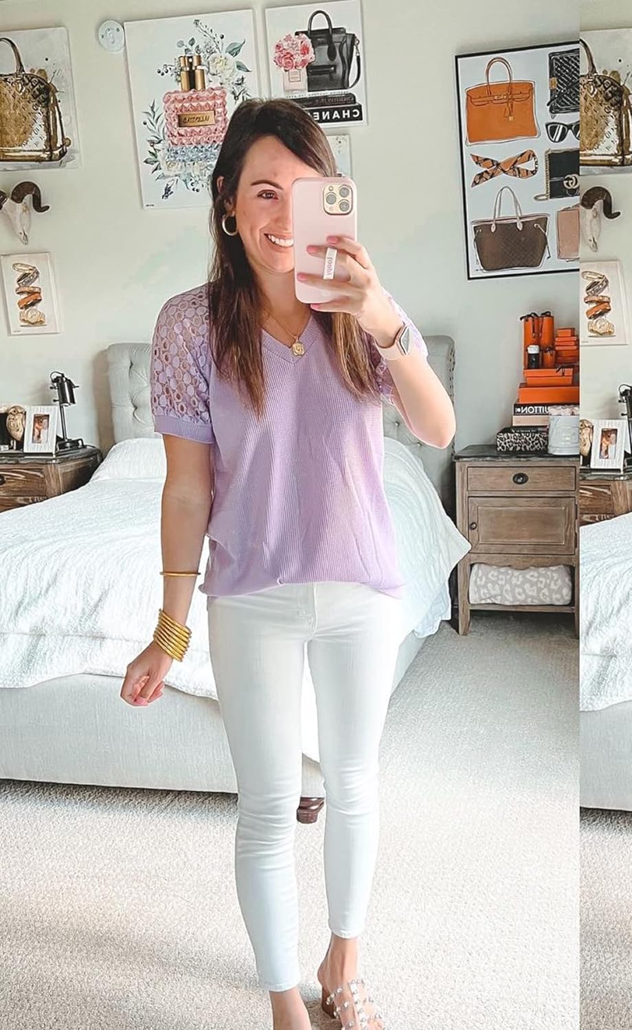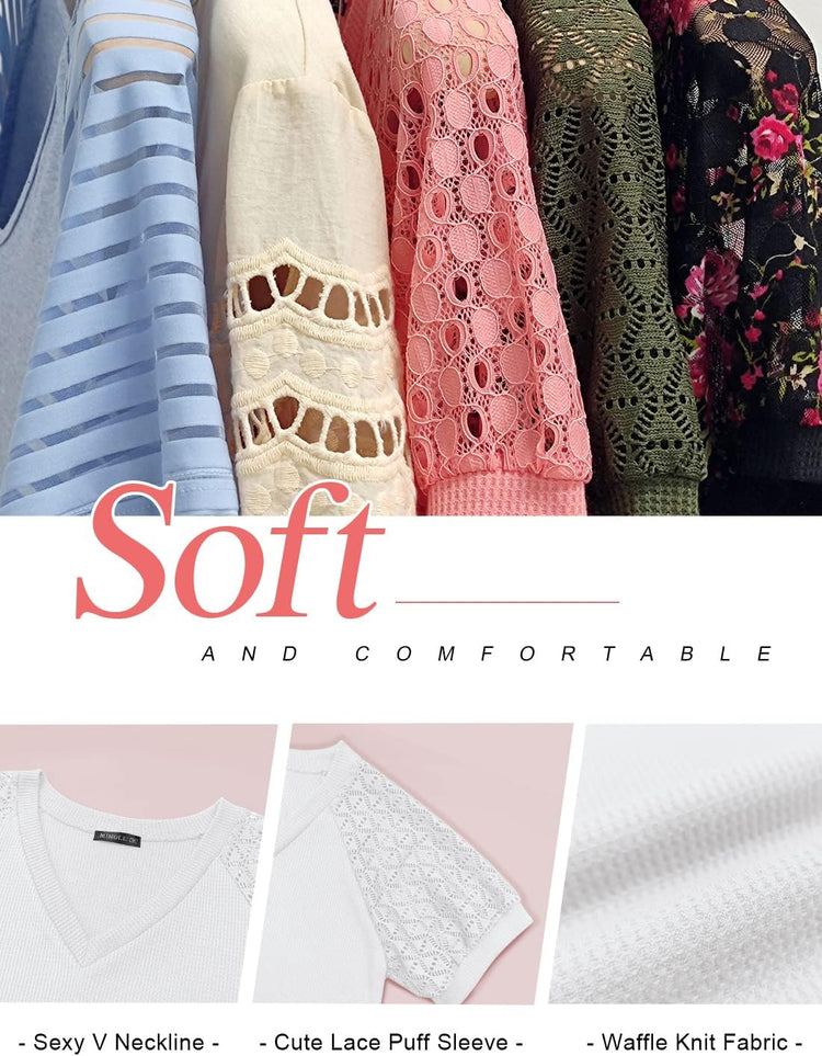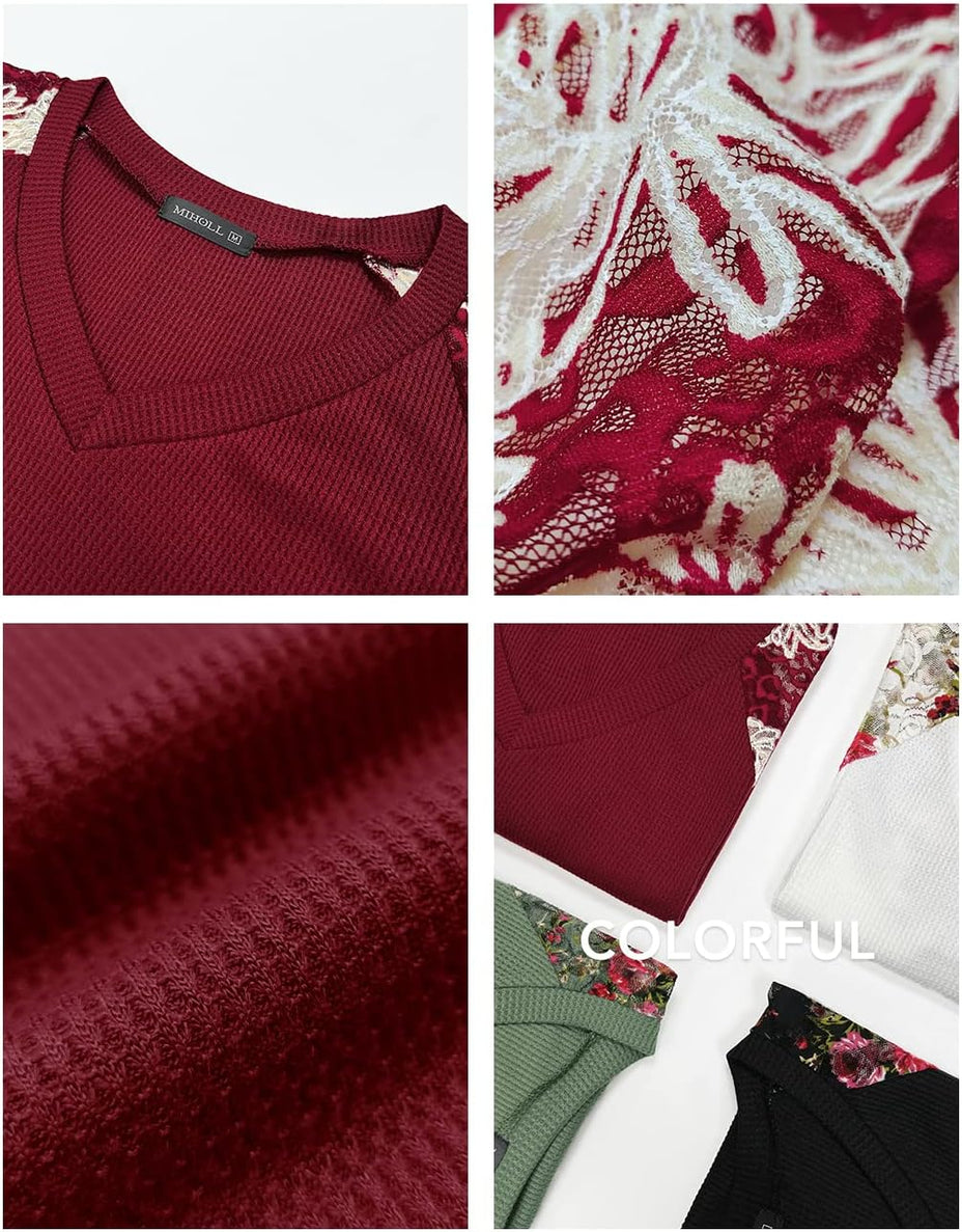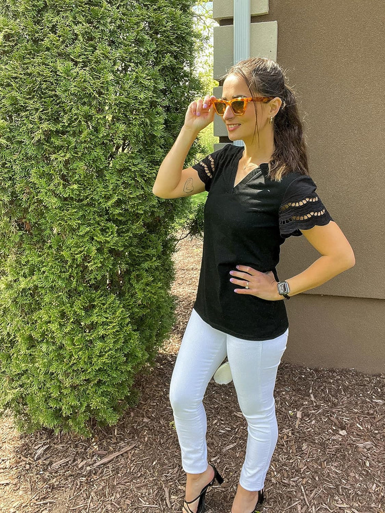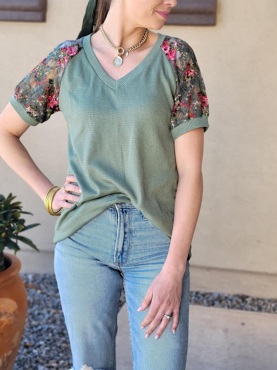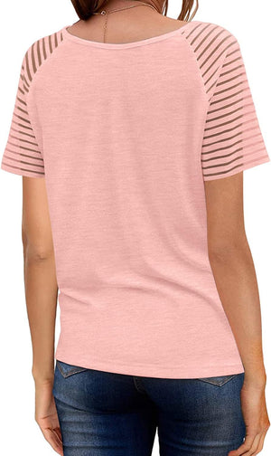 MIHOLL Women's Lace Short Sleeve V Neck Shirts Loose Casual Tops Tee Shirt