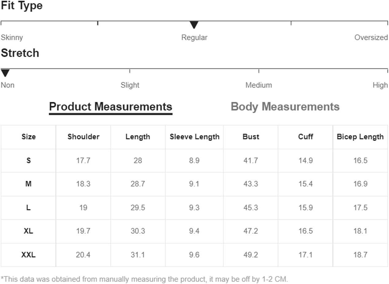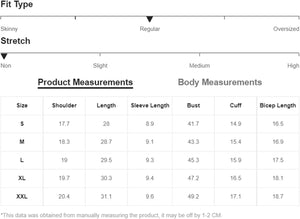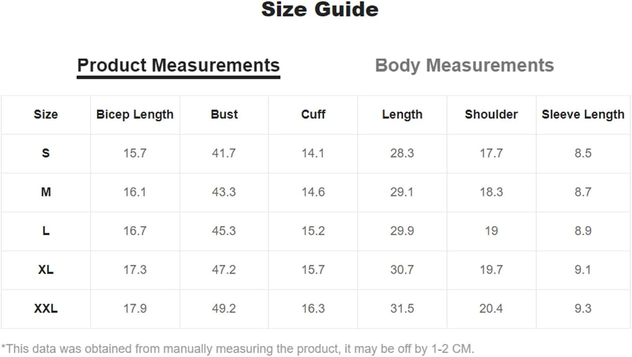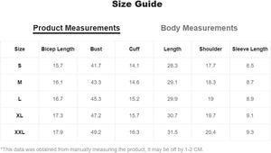 Size Chart: Small: Shoulder:18.2", Bust:41.3", Length:28", Sleeve Length:7.6", Bicep Length:15.9", Cuff:14.7"/ Medium: Shoulder:18.8", Bust:42.9", Length:28.7", Sleeve Length:7.8", Bicep Length:16.4", Cuff:15.2"/ Large: Shoulder:19.5", Bust:44.9", Length:29.5", Sleeve Length:8.1", Bicep Length:16.9", Cuff:15.7"/ X-Large: Shoulder:20.2", Bust:46.9", Length:30.3", Sleeve Length:8.3", Bicep Length:17.5", Cuff:16.3"/ XX-Large: Shoulder:20.9", Bust:48.8", Length:31.1", Sleeve Length:8.5", Bicep Length:18", Cuff:16.9"