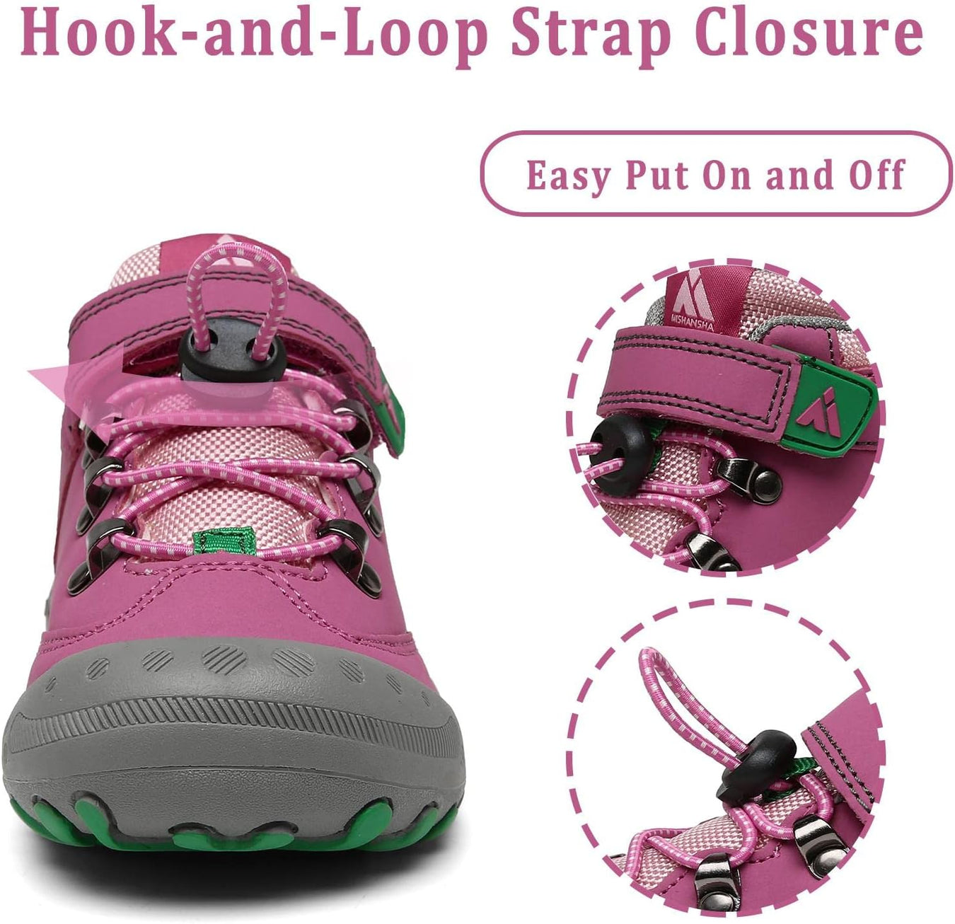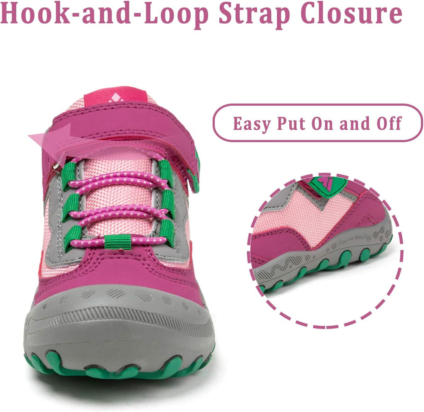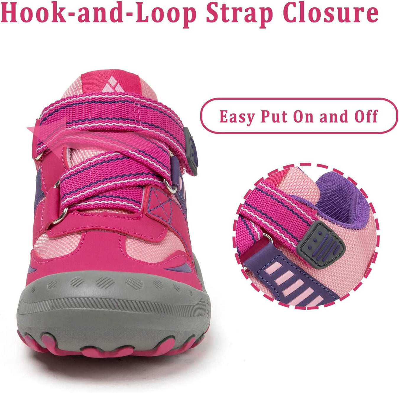 * The hikes shoes Adjustable hook and loop design, no tie very easy to slip on and take off.