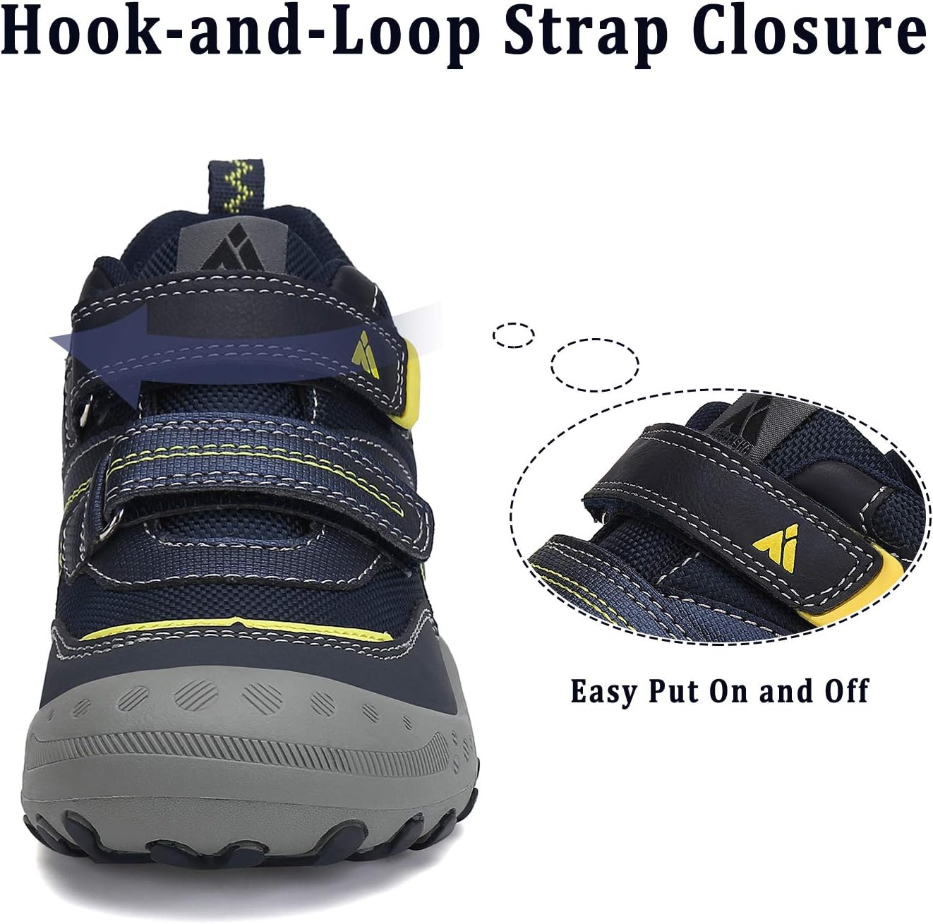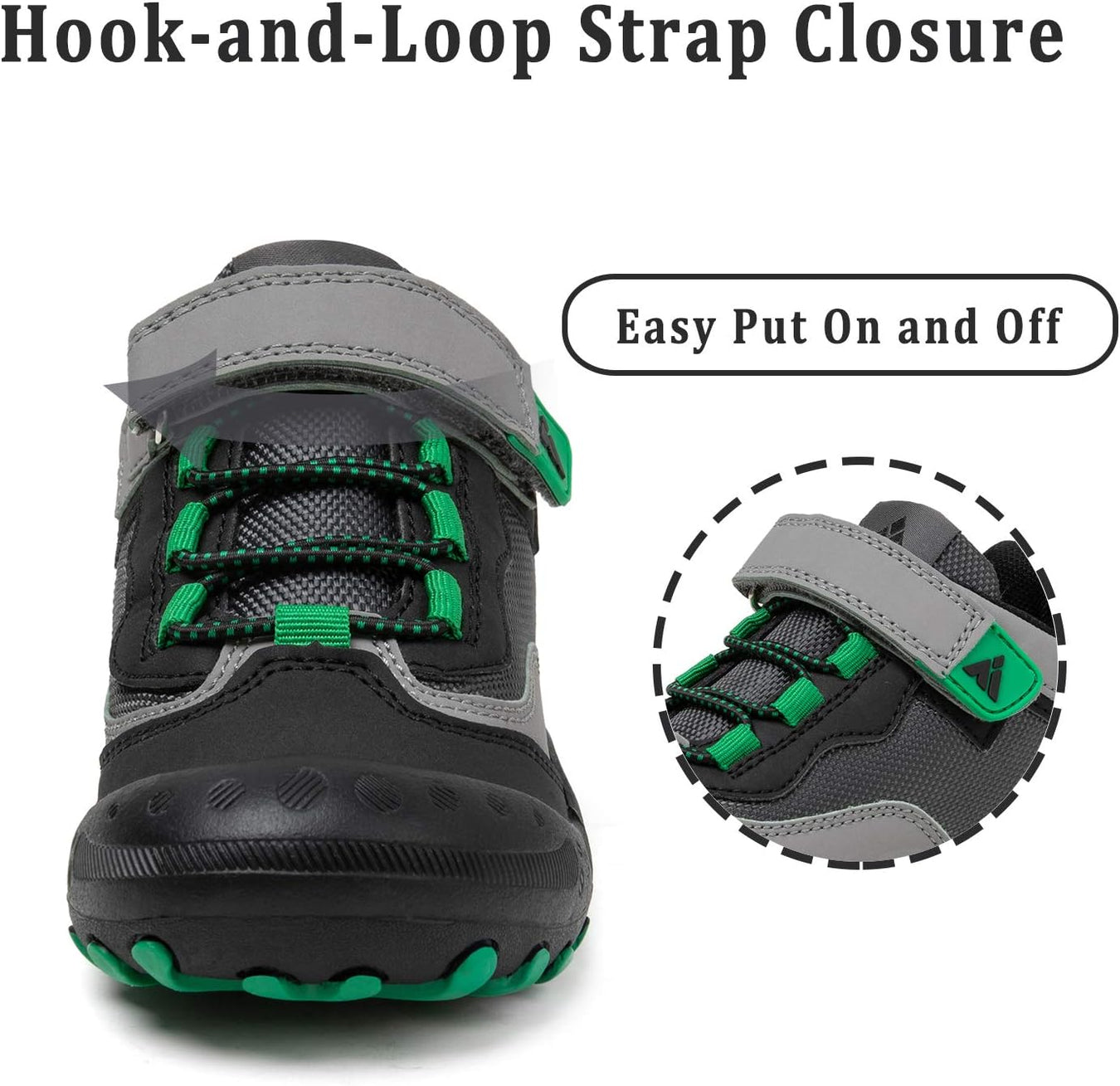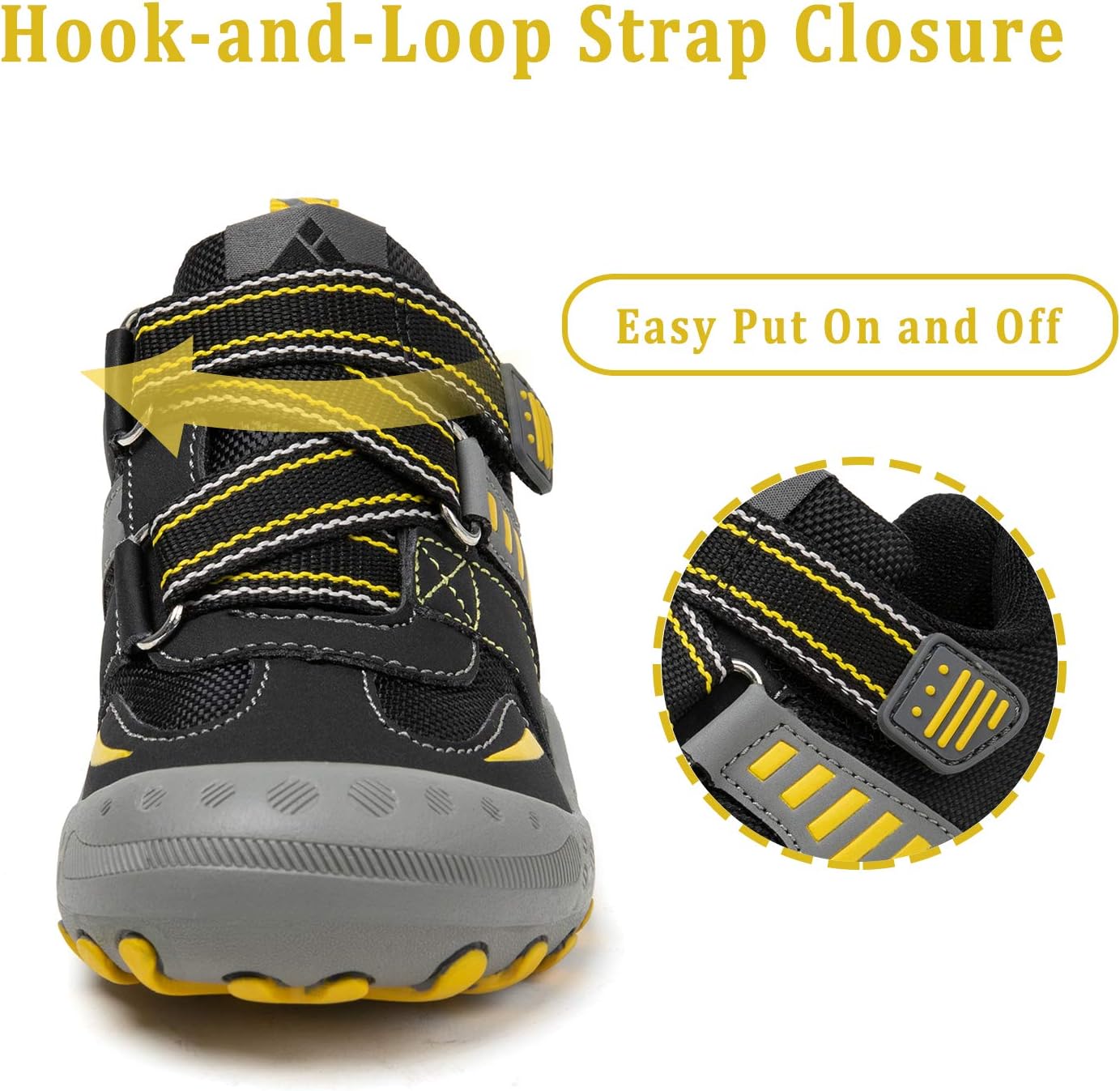 * The hikes shoes Adjustable hook and loop design, no tie very easy to slip on and take off.