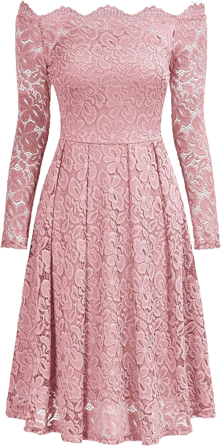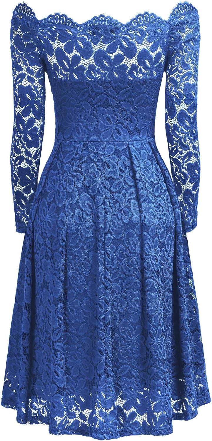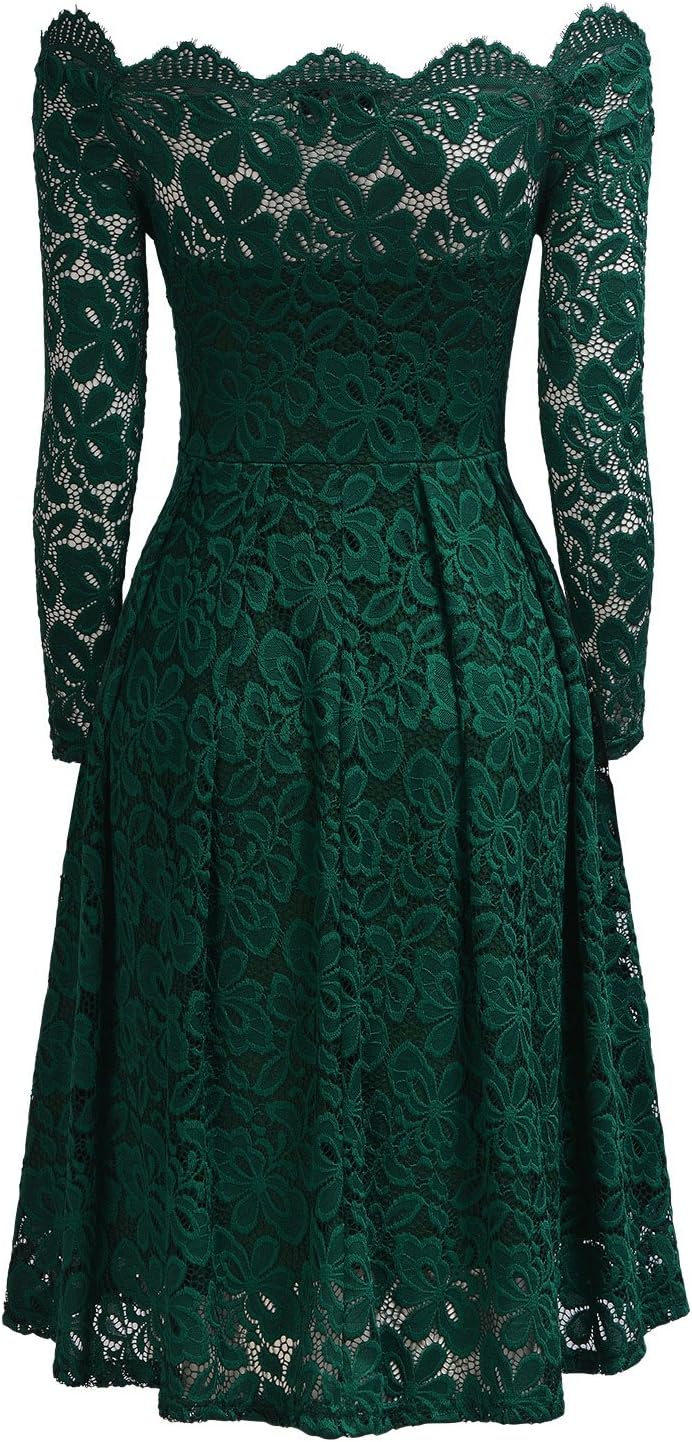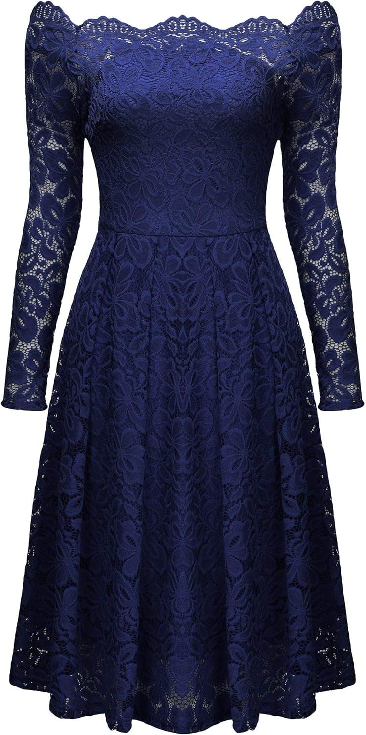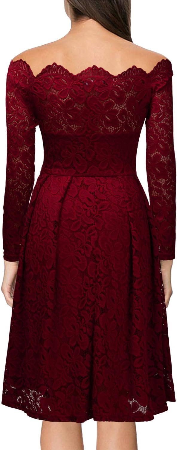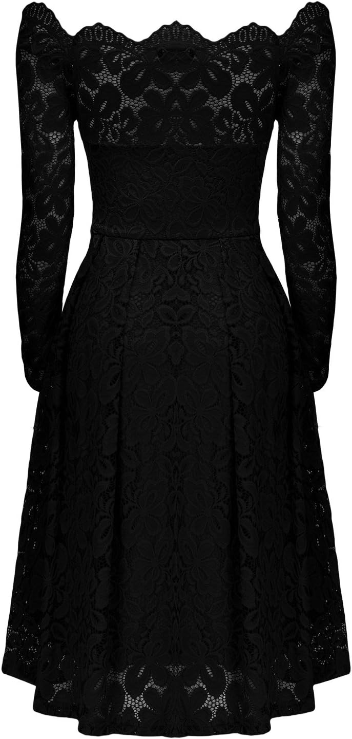 MISSMAY Women's Vintage Floral Lace Long Sleeve Boat Neck Cocktail Party Swing Dress