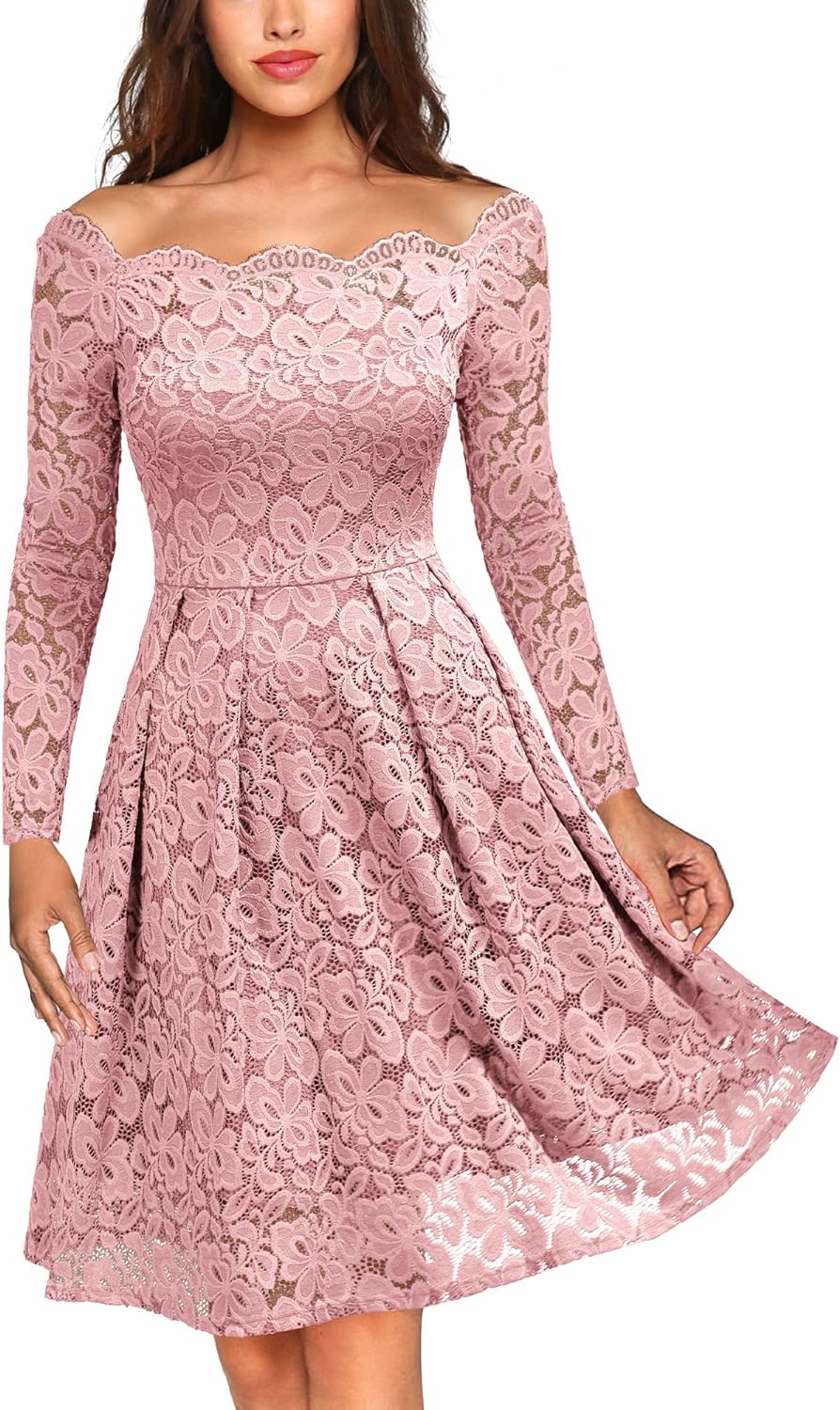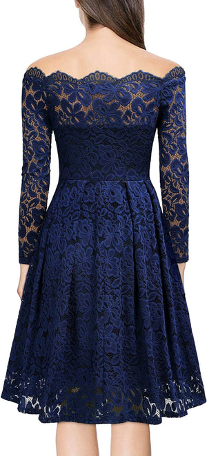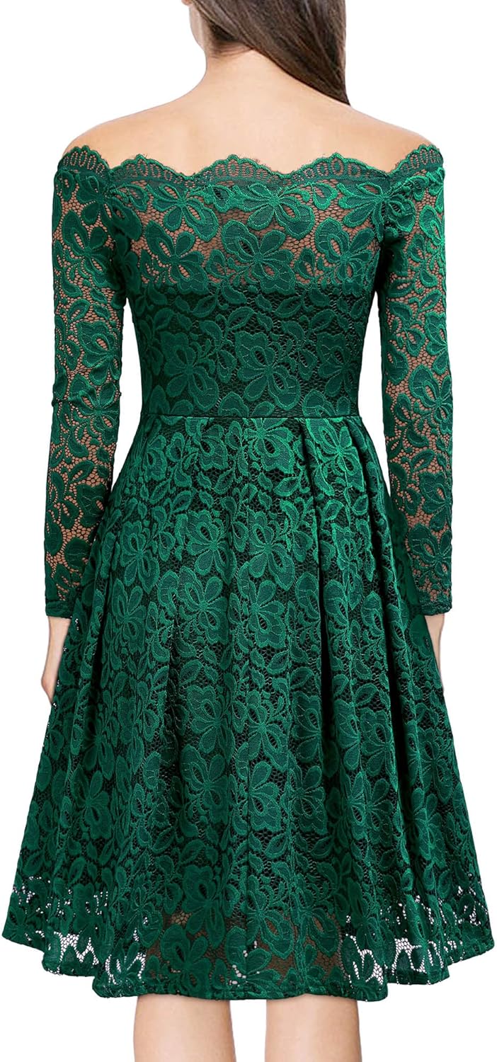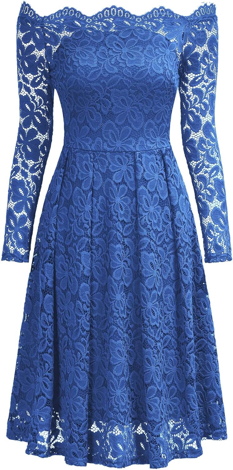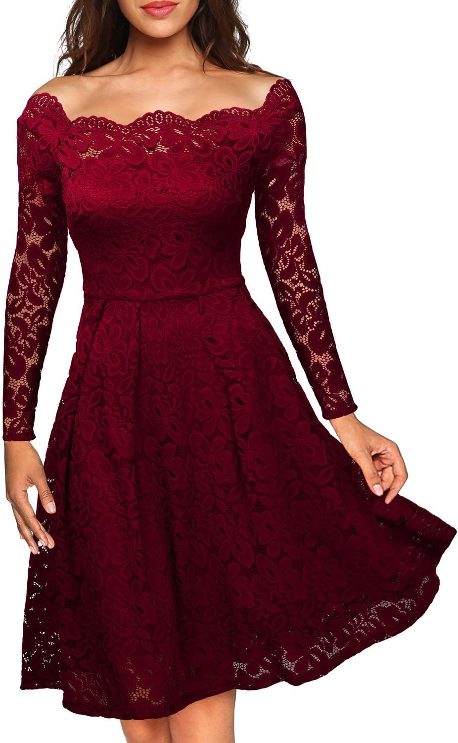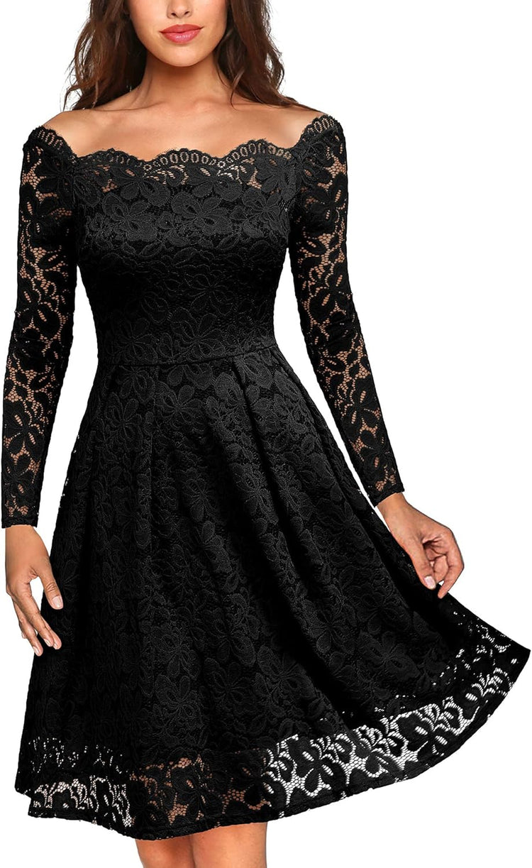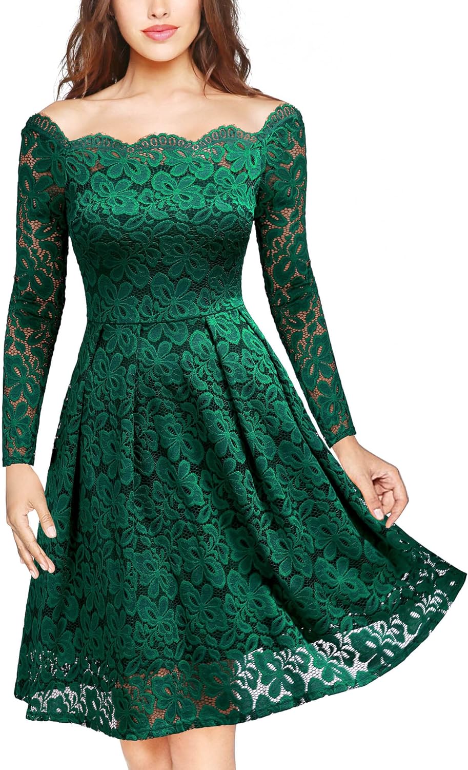 MISSMAY Women's Vintage Floral Lace Long Sleeve Boat Neck Cocktail Party Swing Dress