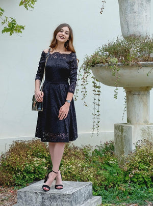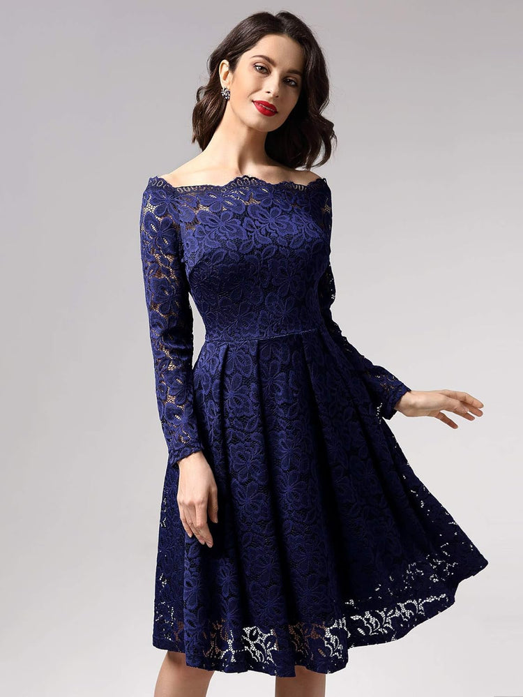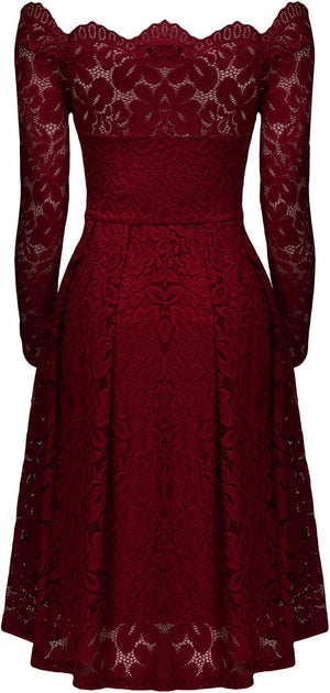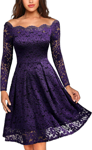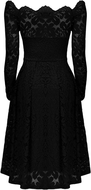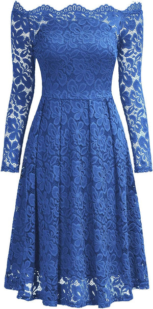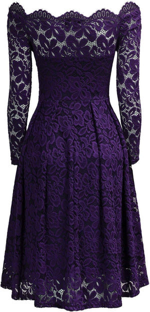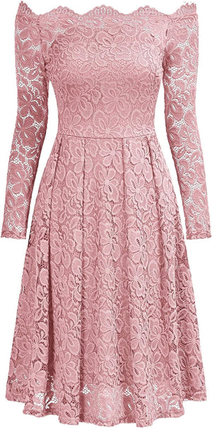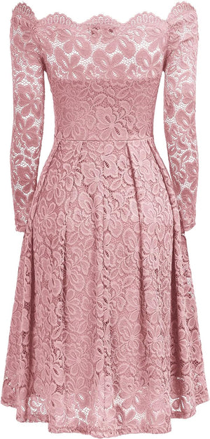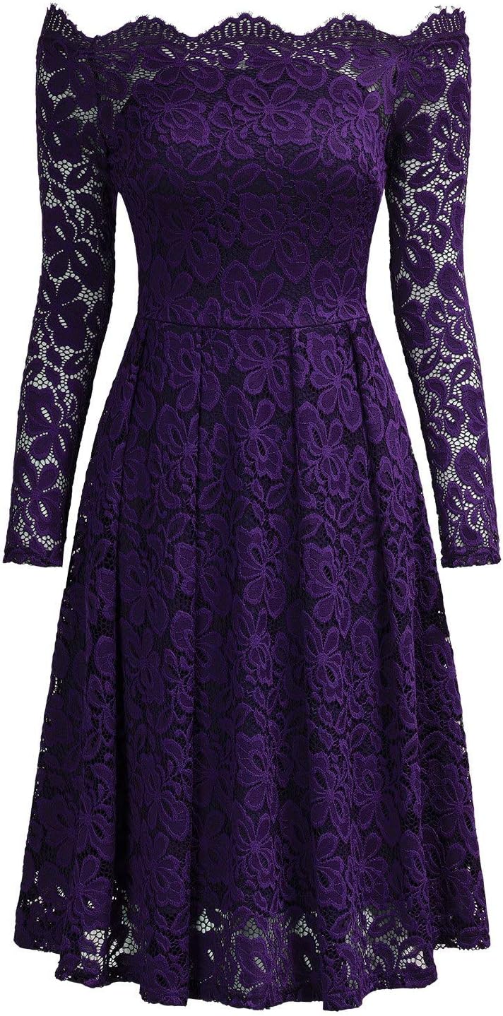 Women's Vintage Floral Lace Long Sleeve Boat Neck Cocktail Party Swing Dress