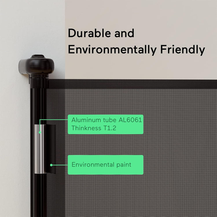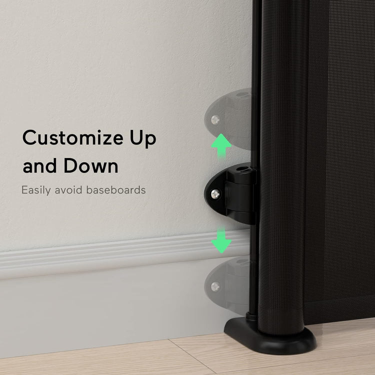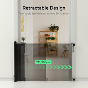 - Upgraded Retractable Baby Gate: This extra wide outdoor retractable gate extends to 55" wide and 33" high. When not in use, the mesh can be retracted to save space and facilitate storage. Unlike iron gate rails, this new retractable gate has no bottom rails - so there's no tripping hazard.
