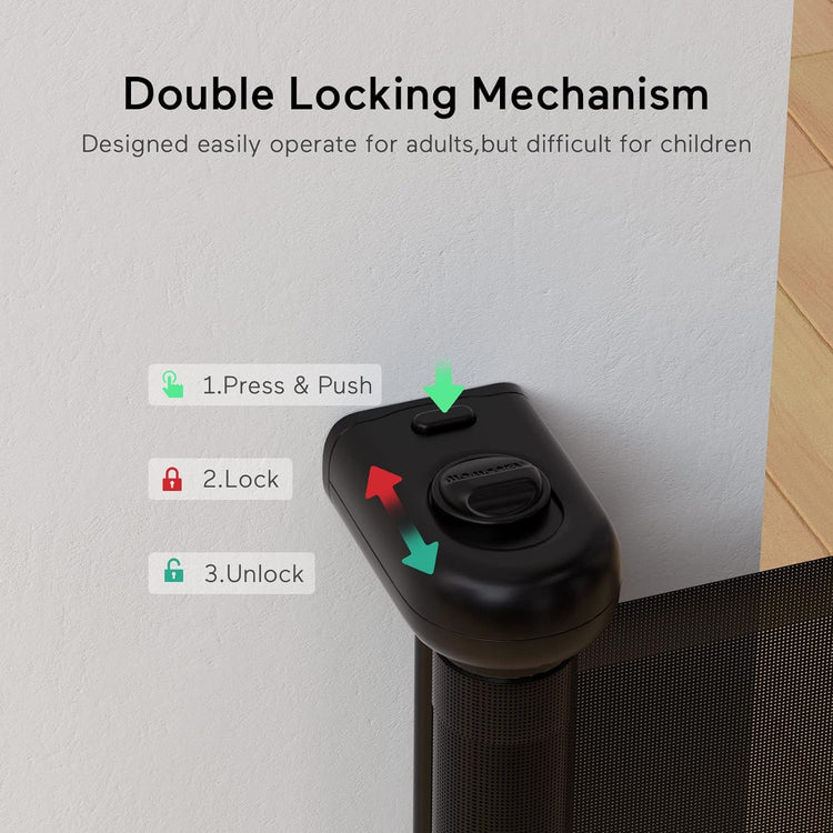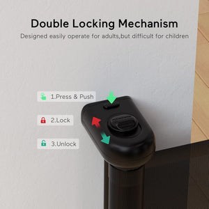 - Double Lock: There is a locking device on the top of the mesh gate, which can be pressed to lock and unlock. The perfect solution for doorways and stairs, lock the way for babies and pets, provide security for the whole house, stair gates are used for children and pets blocking their way out or in and out.