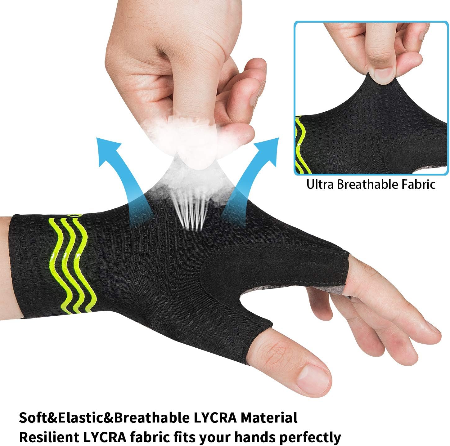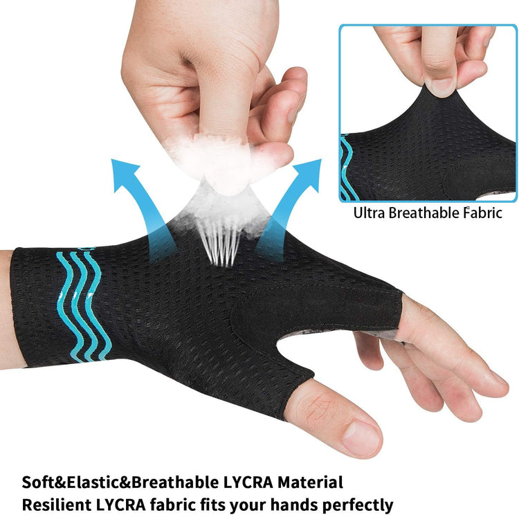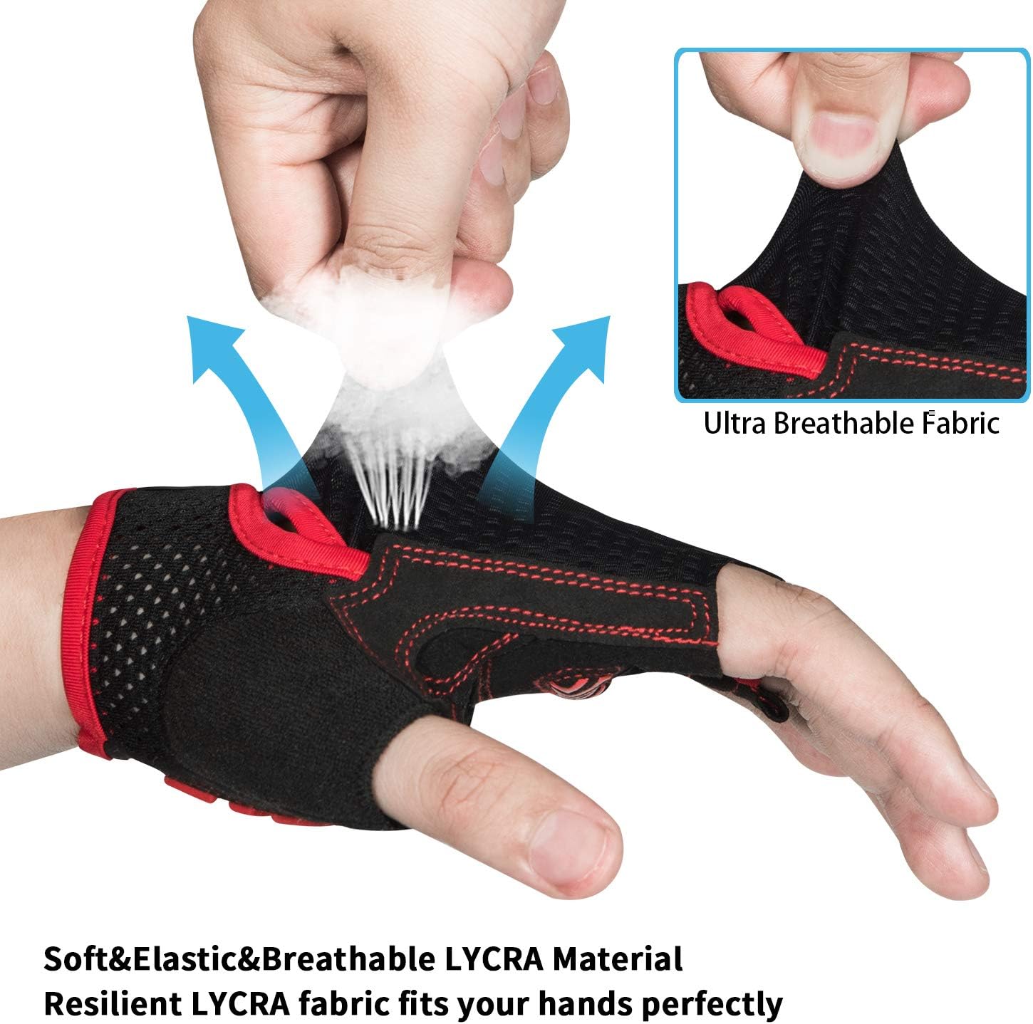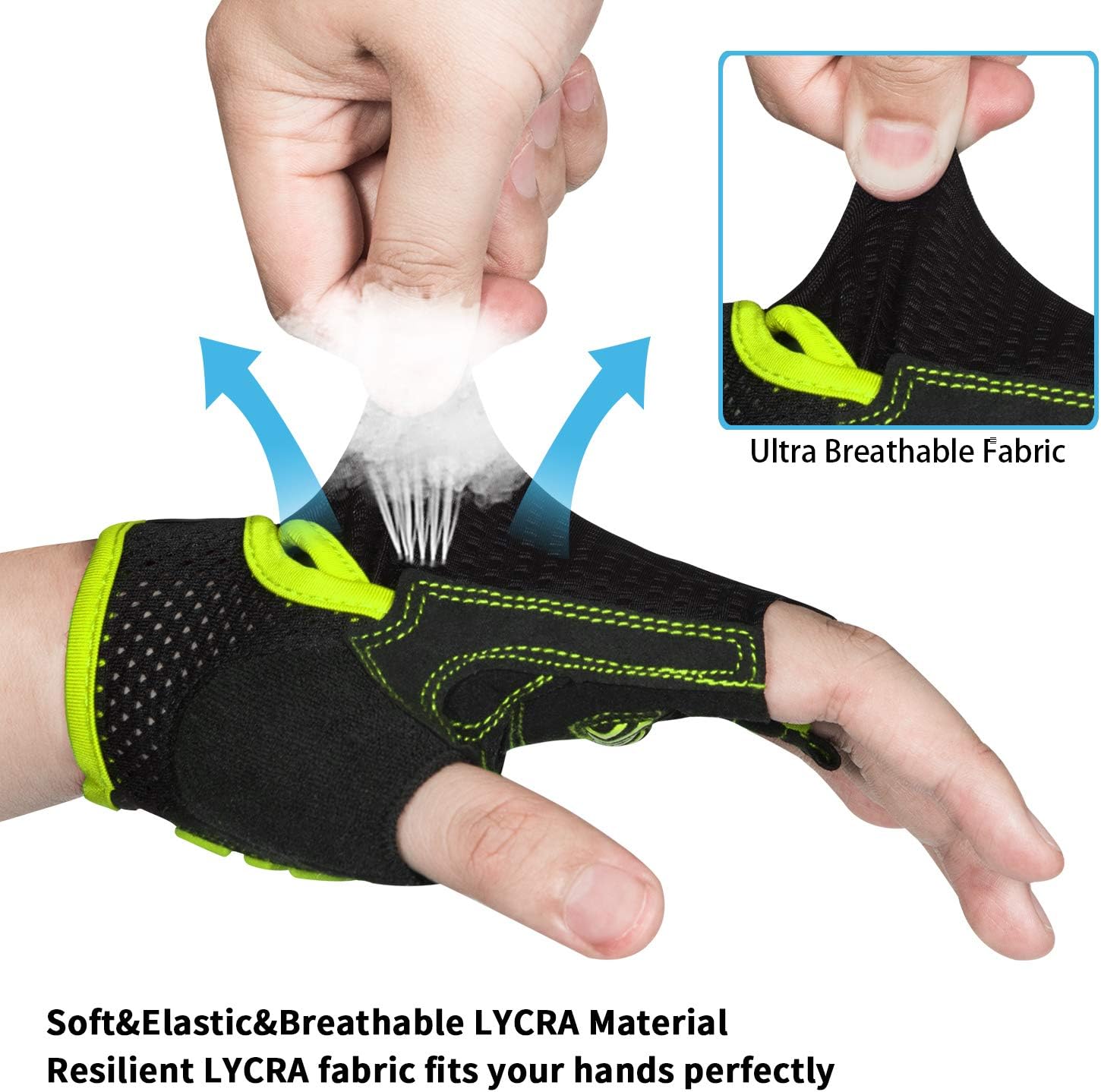 - 【100% BREATHABLE MATERIAL】 Bike gloves use of 100% breathable microfiber material can quickly absorb sweat during the ride, cycling gloves design of ventilation holes in palm parts helps the hands breathe better.