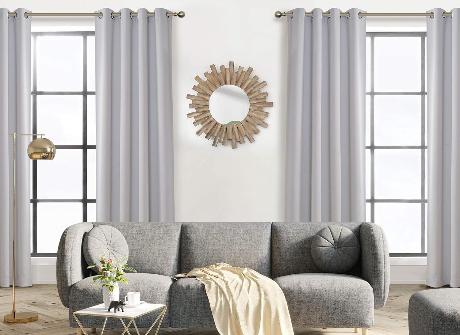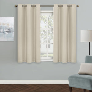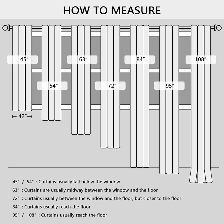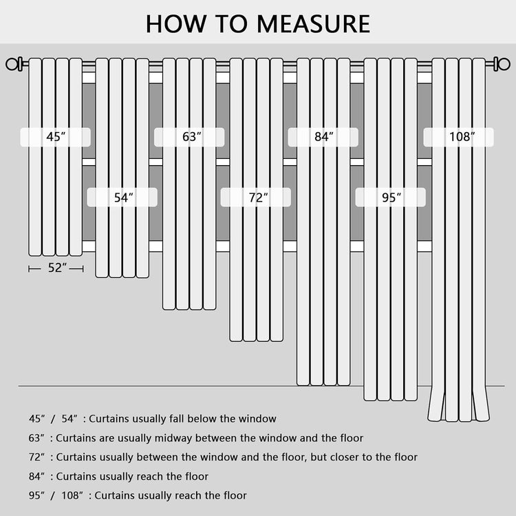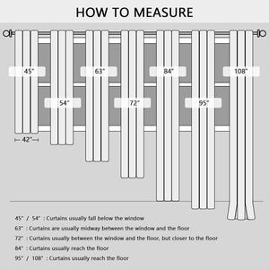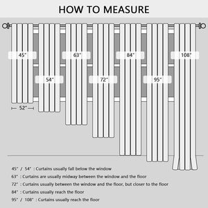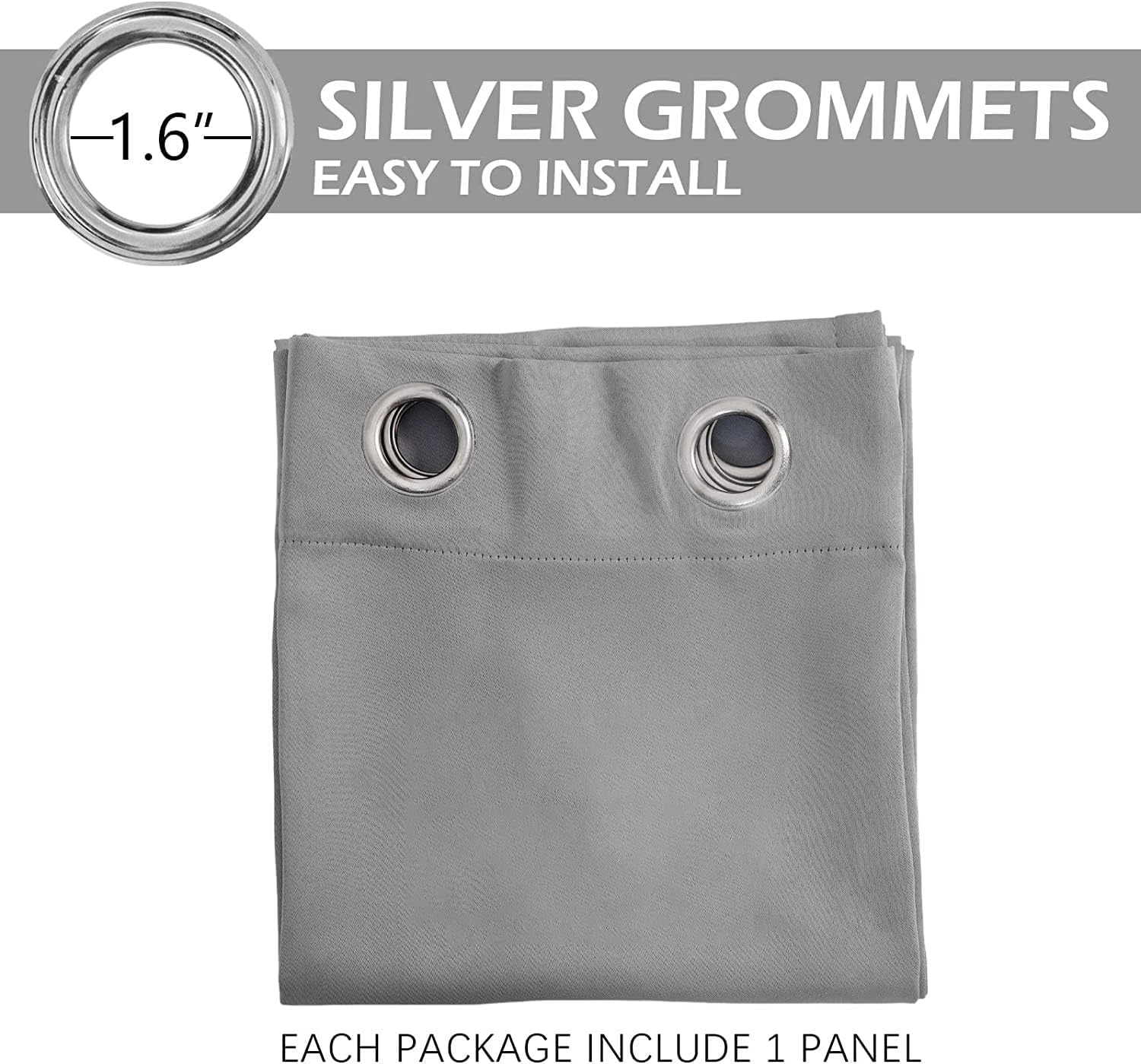 - Package Detail: Our grommet curtains are sold individually, each package include 1 curtain panel. Each panel measures 52 inch wide by 63 inch long and has 8 premium anti-rust grommets on the top. For better fullness, the combined width of panels should be 1.5 to 2 times the width of the curtain rod.