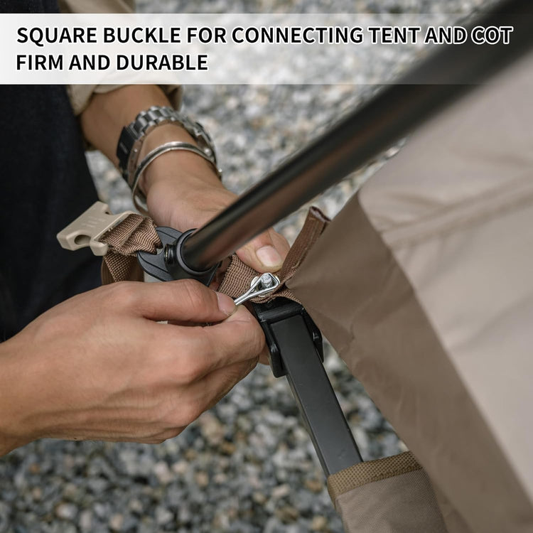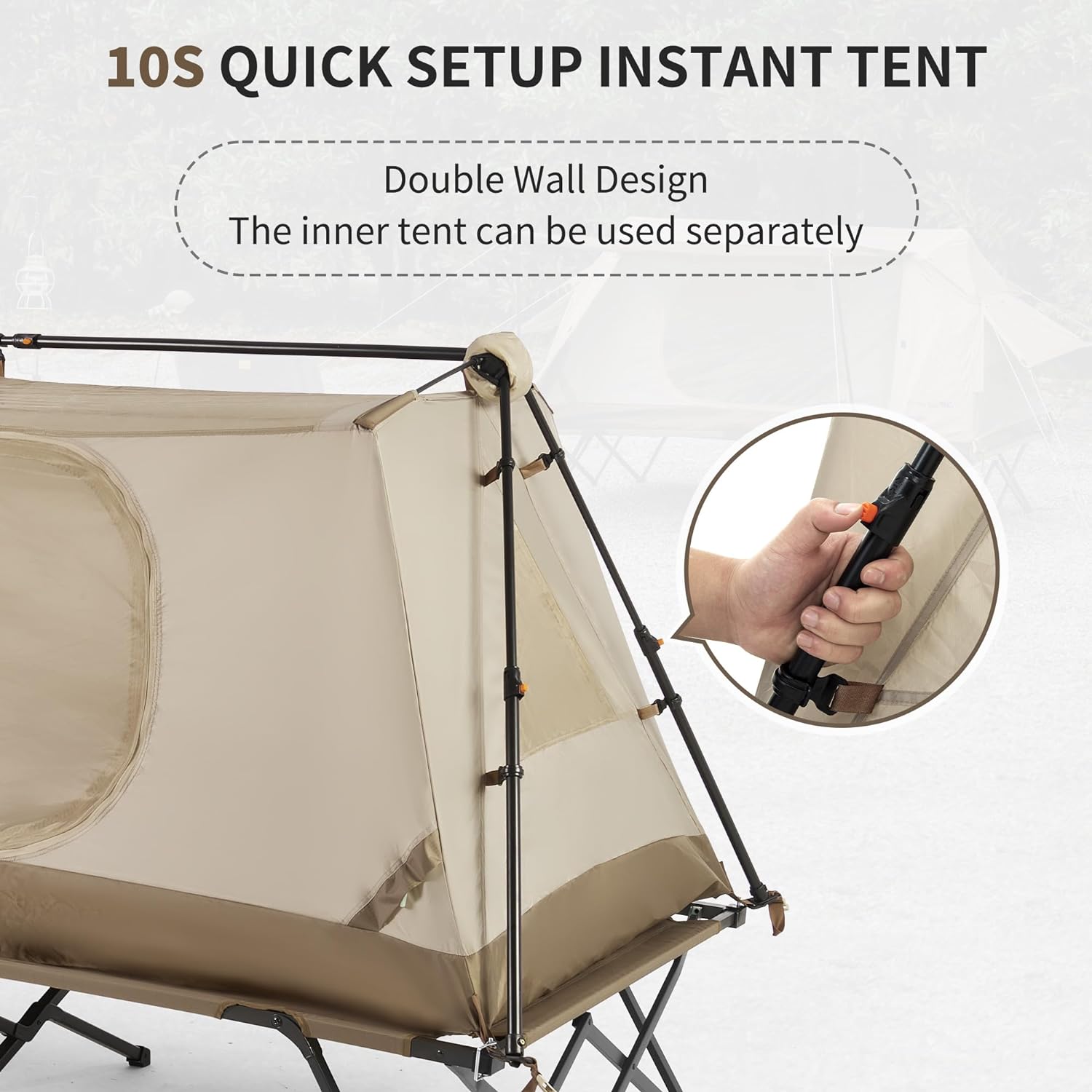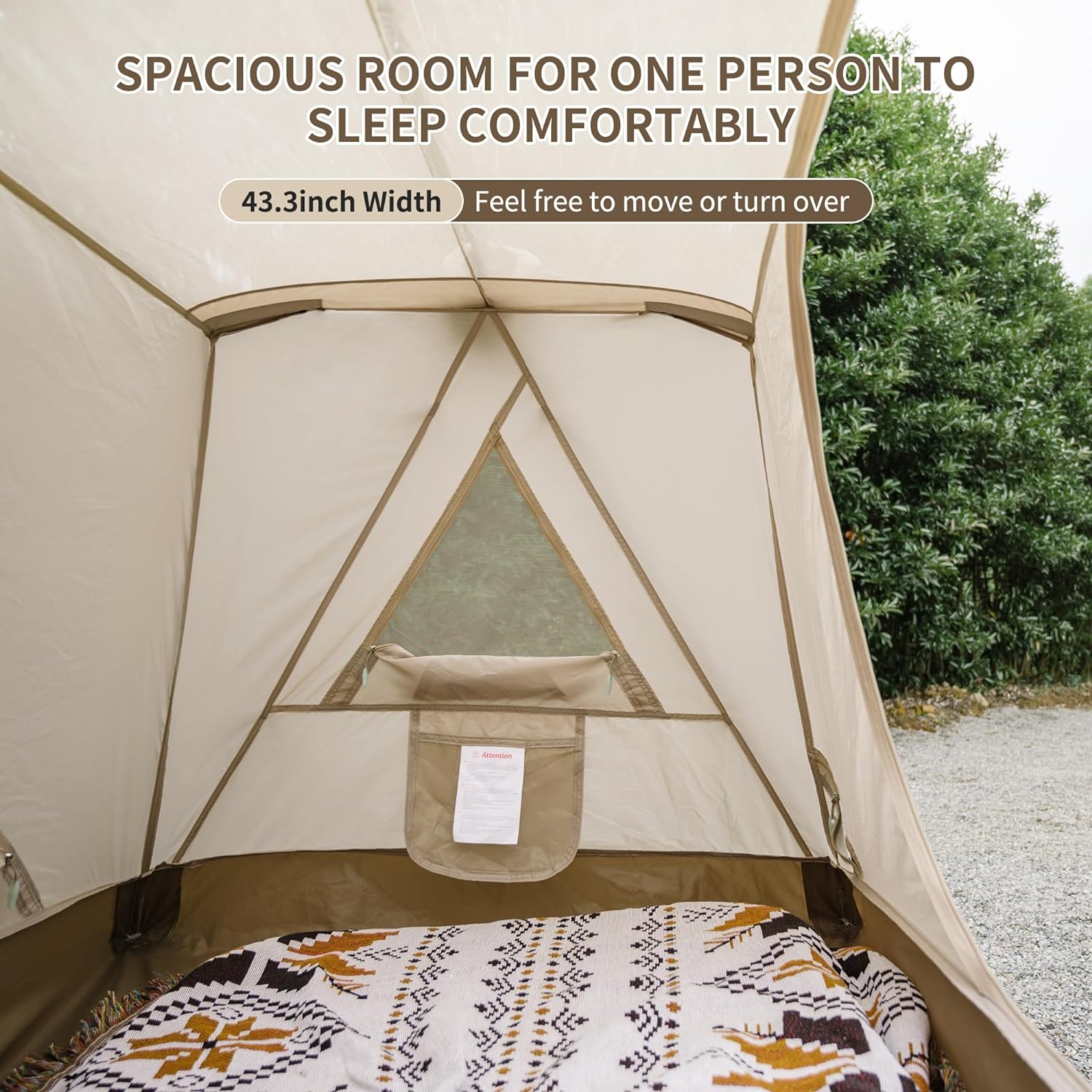 - 4 Season Double Layer Tent: The cot tent is double wall tent, the inner tent and tent fly can be used separately. The inner tent made of great mesh fabric with five-sided ventilation design, the tent fly is designed with snow skirt, windproof and snow proof in bad weathers, perfect for winter snow camping.