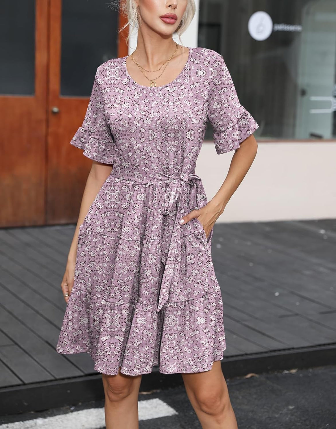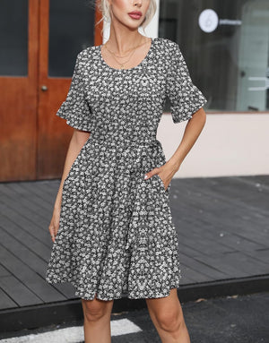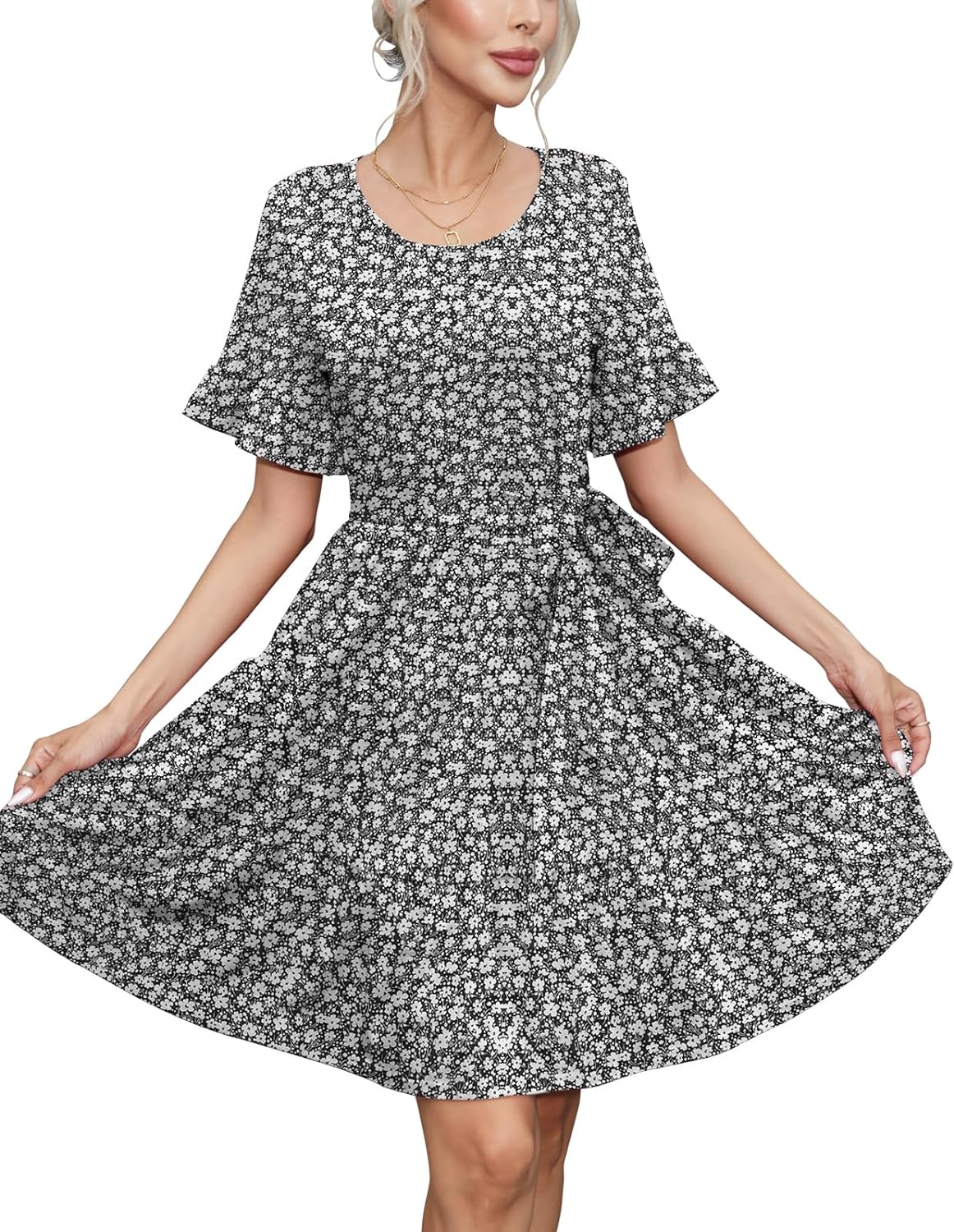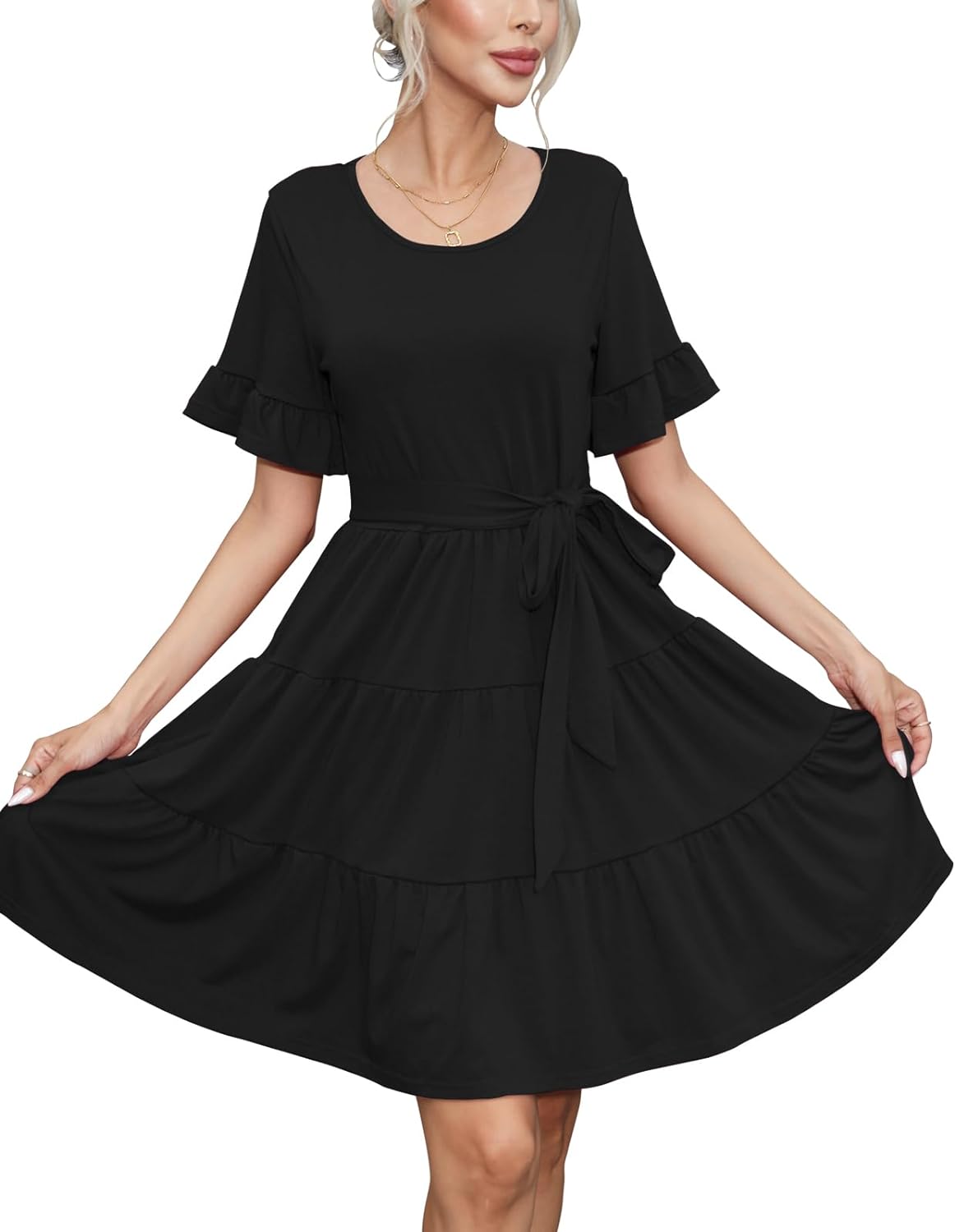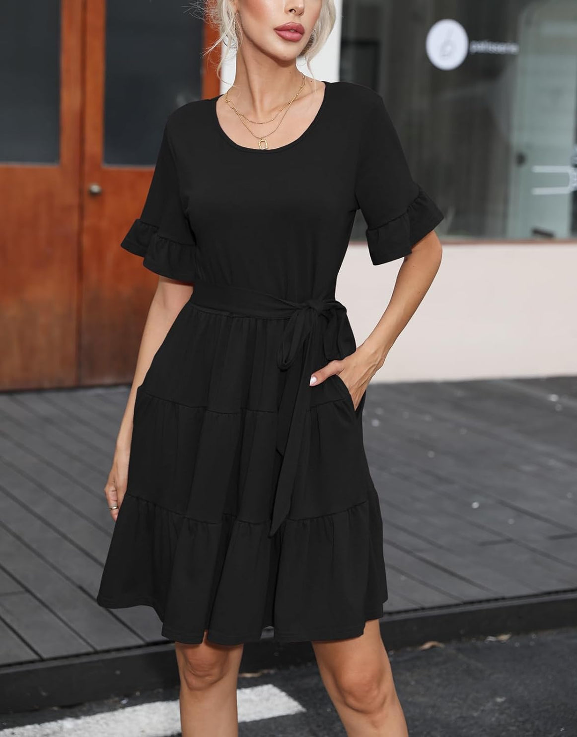 nclook Women's Summer Casual Dress Elastic Skin-Friendly Breathable Fabric Crew-Neck Adjustable Waist Belt with Pockets Black
