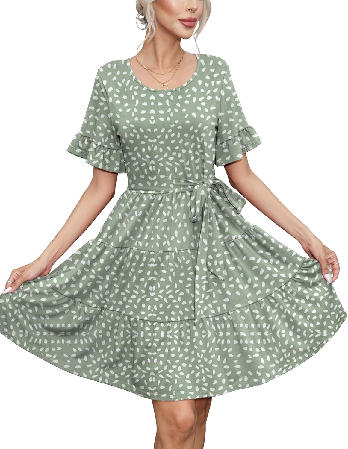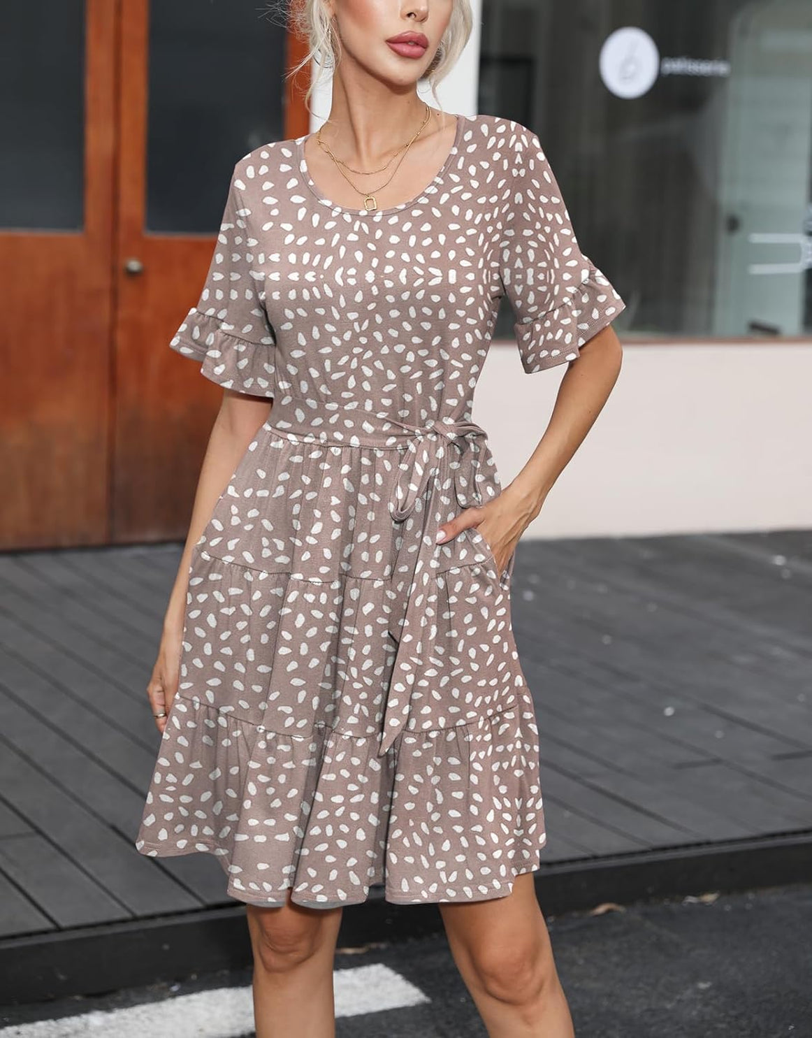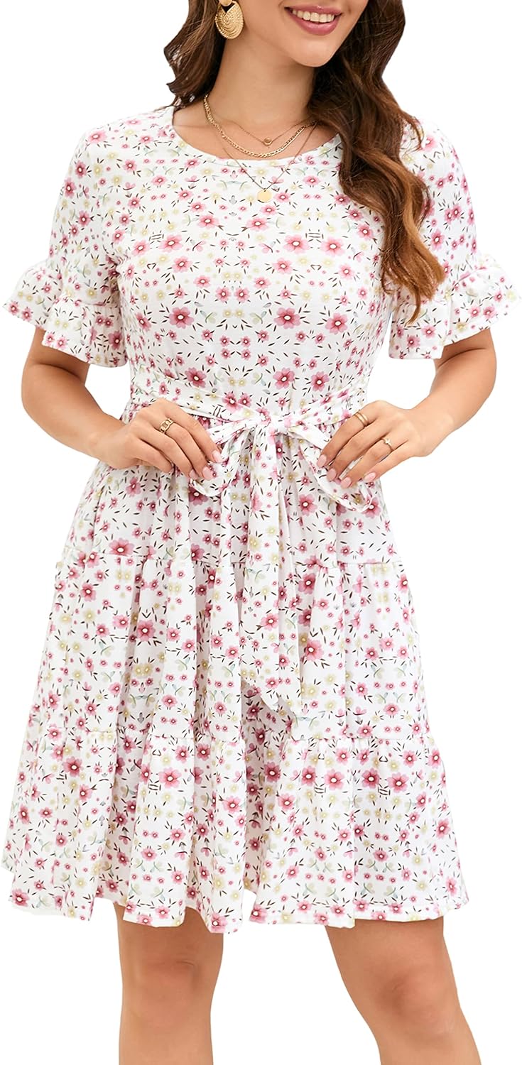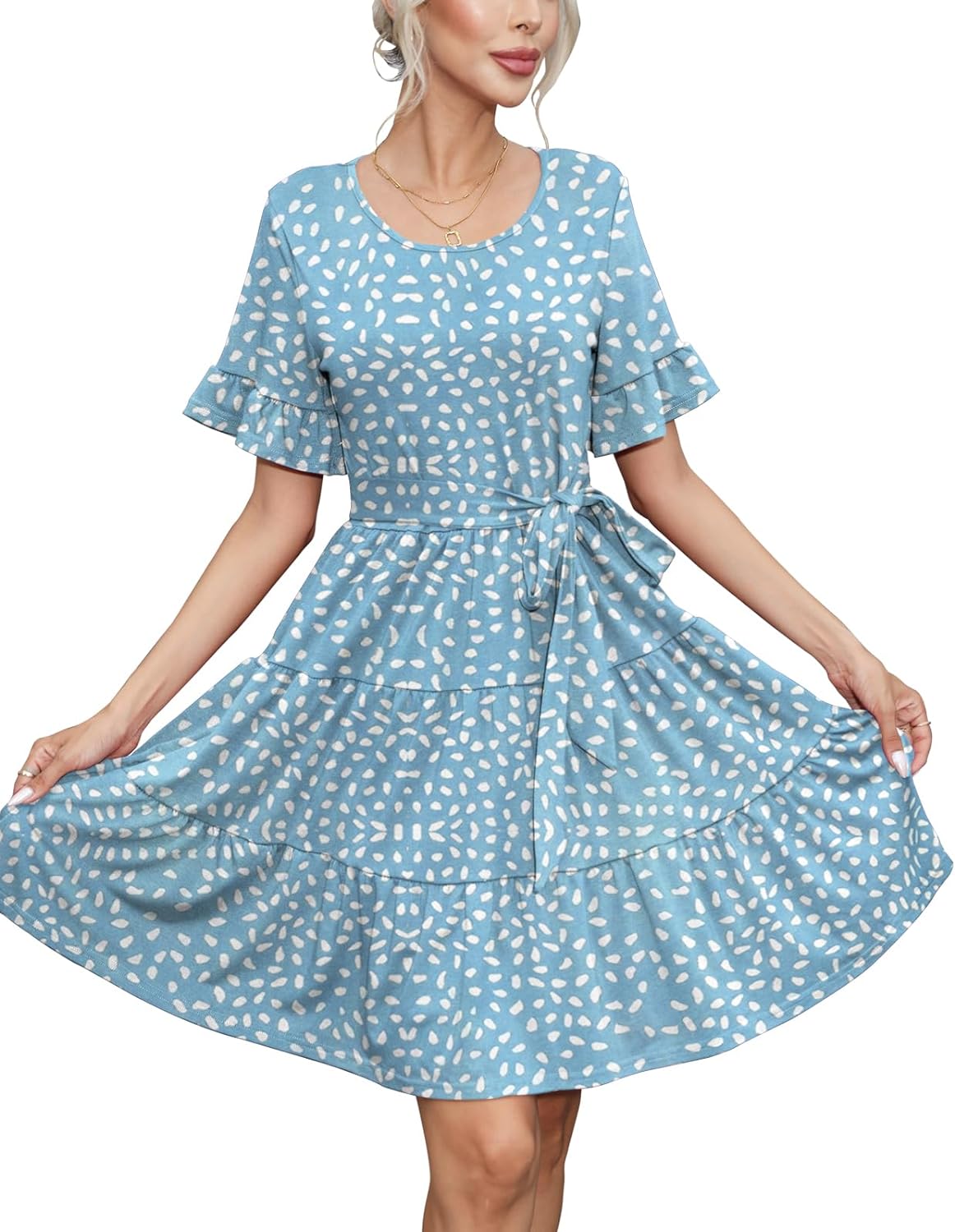 nclook Women's Summer Casual Dress Elastic Skin-Friendly Breathable Fabric Crew-Neck Adjustable Waist Belt with Pockets Black