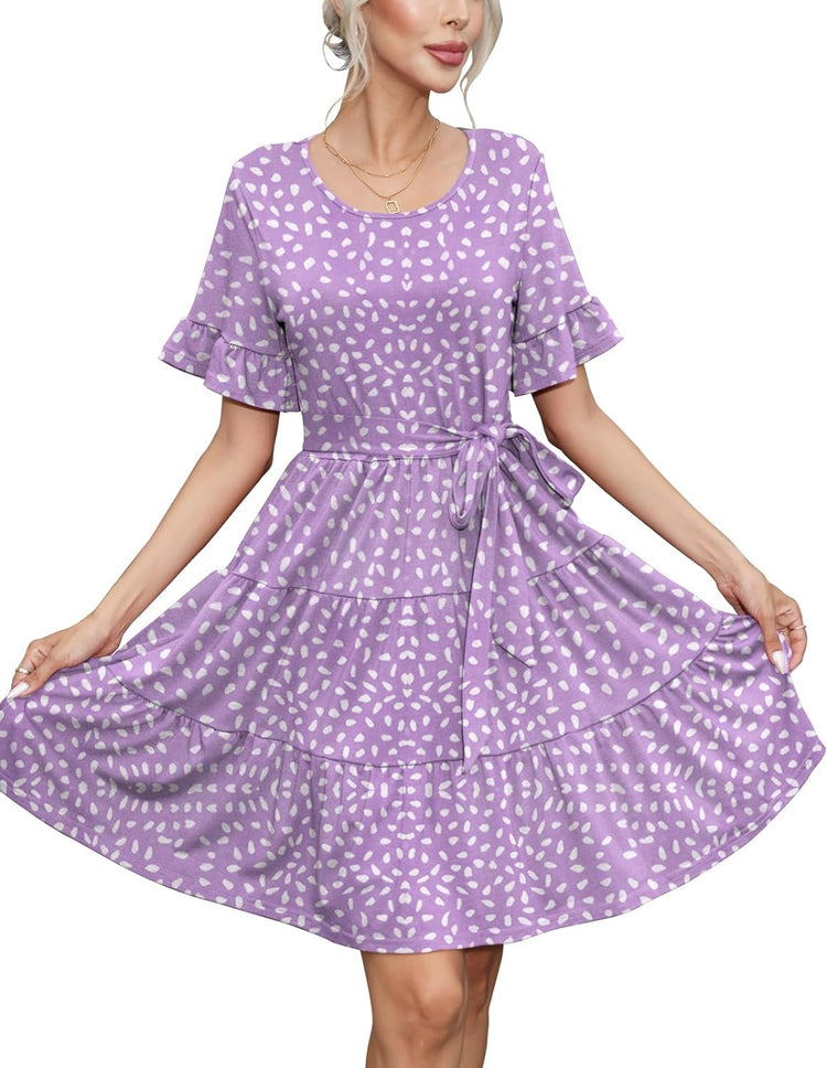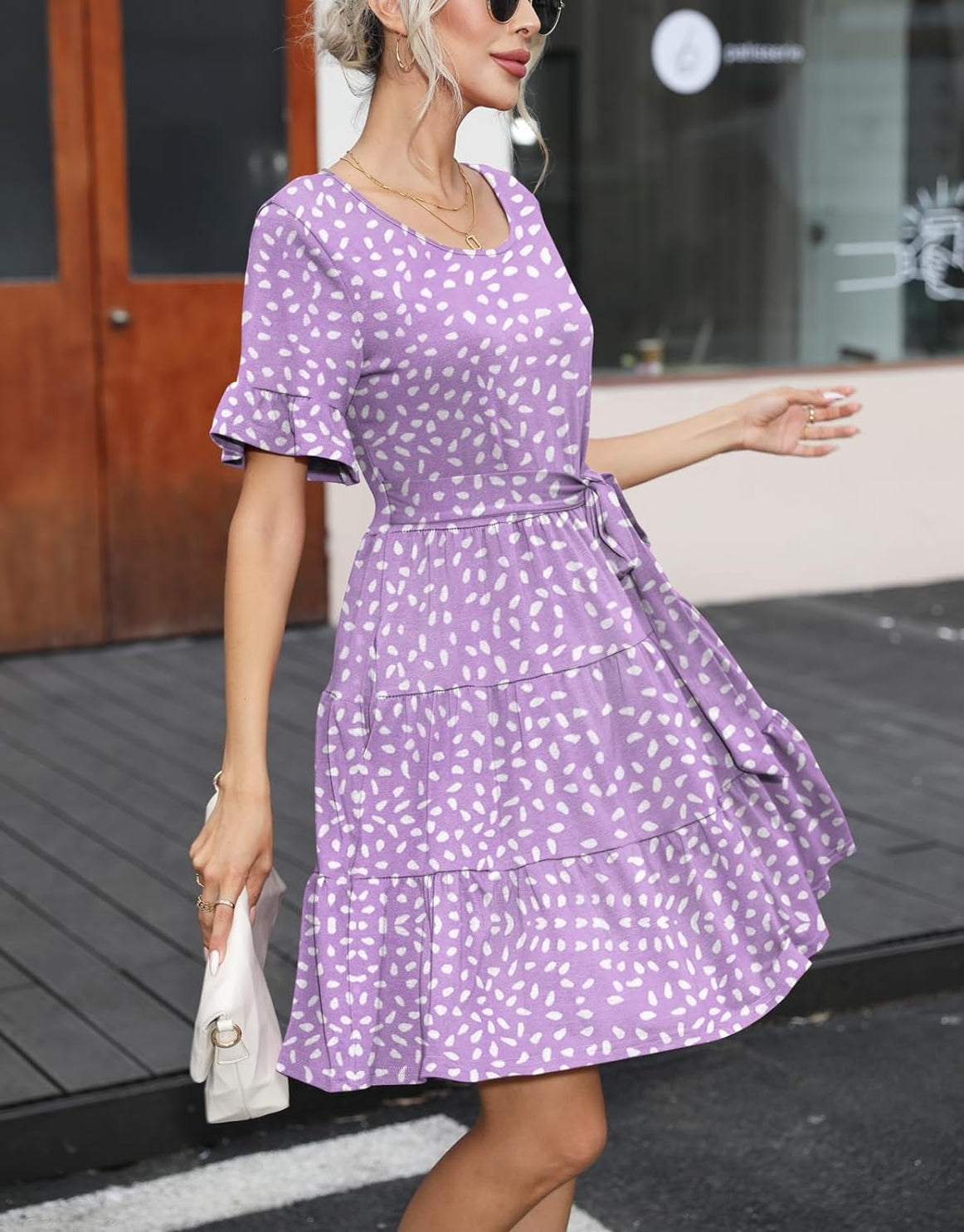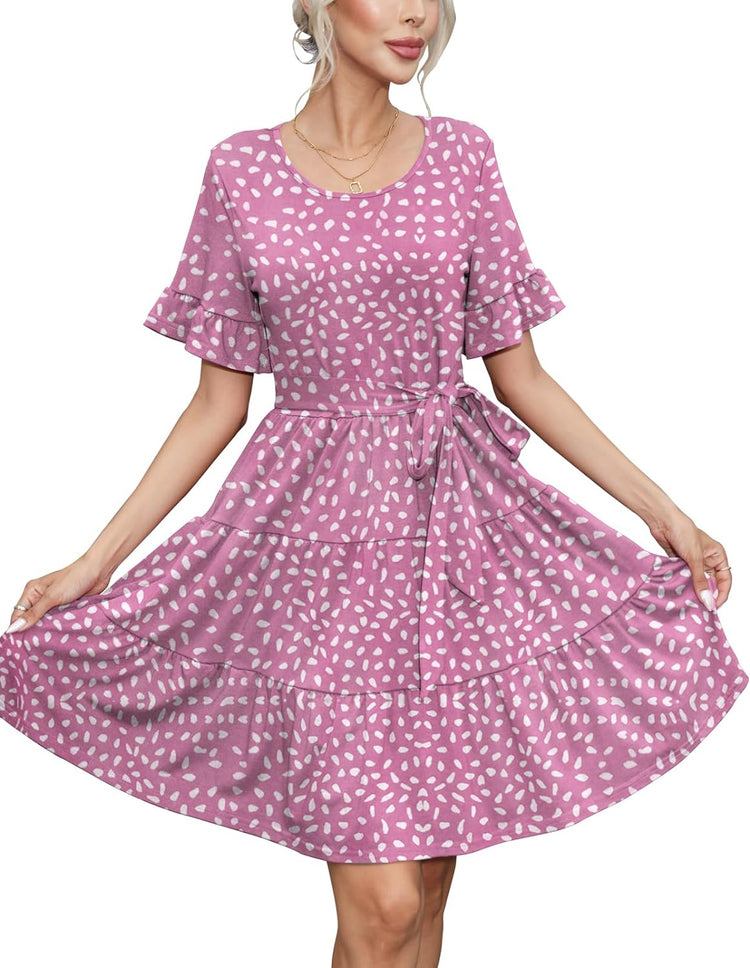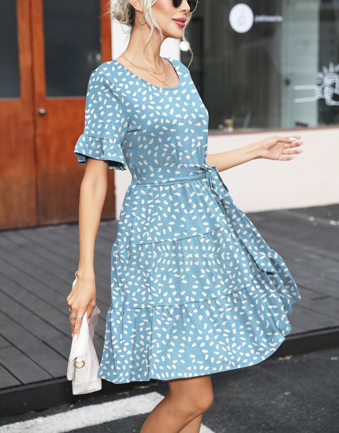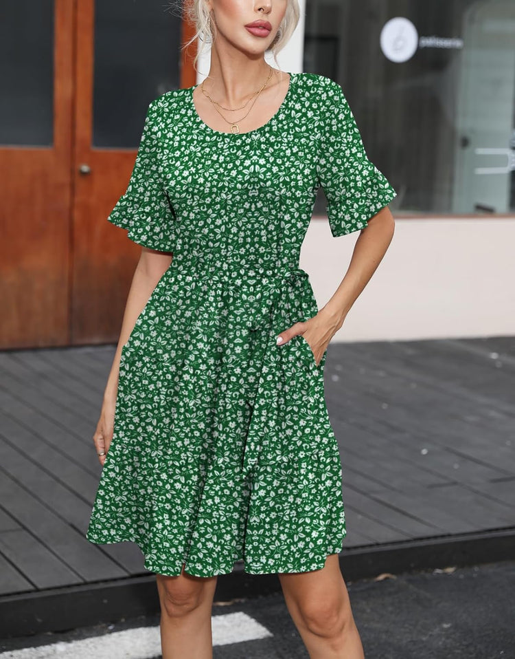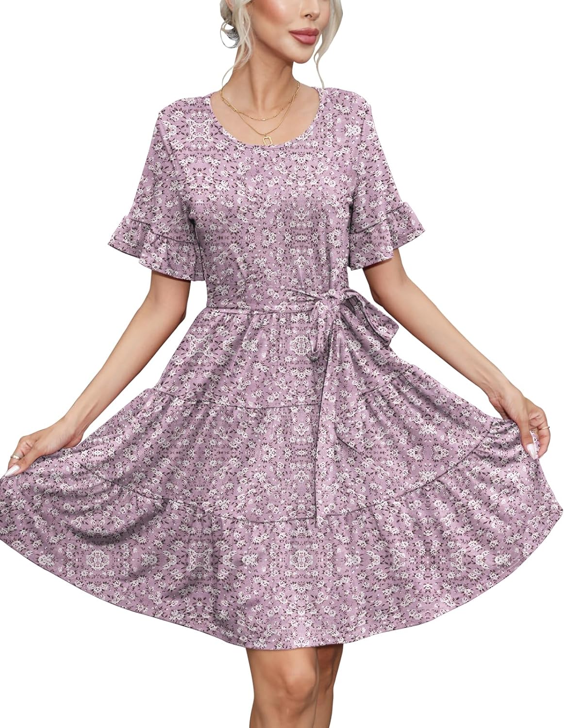 nclook Women's Summer Casual Dress Elastic Skin-Friendly Breathable Fabric Crew-Neck Adjustable Waist Belt with Pockets Black