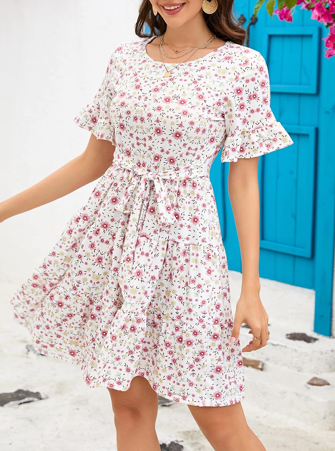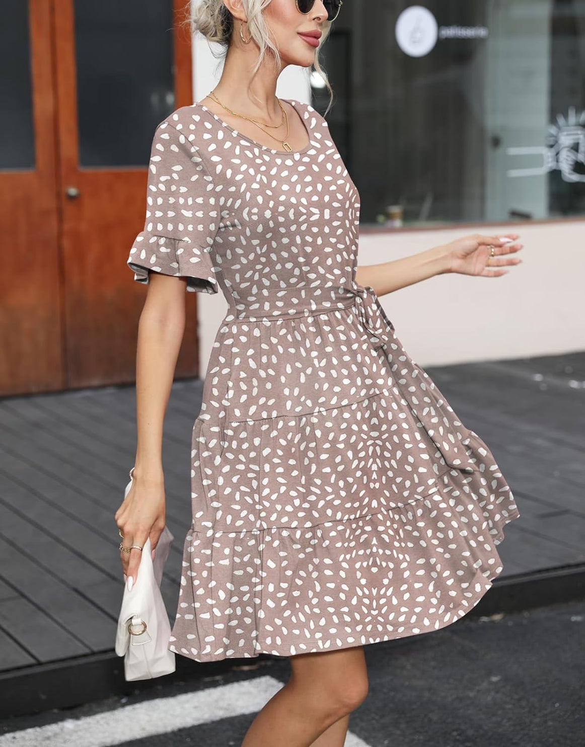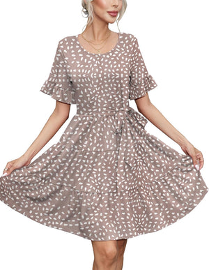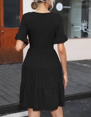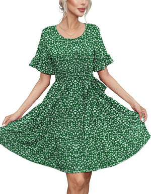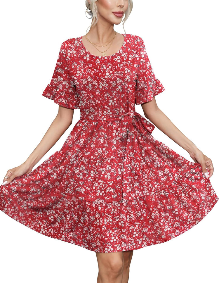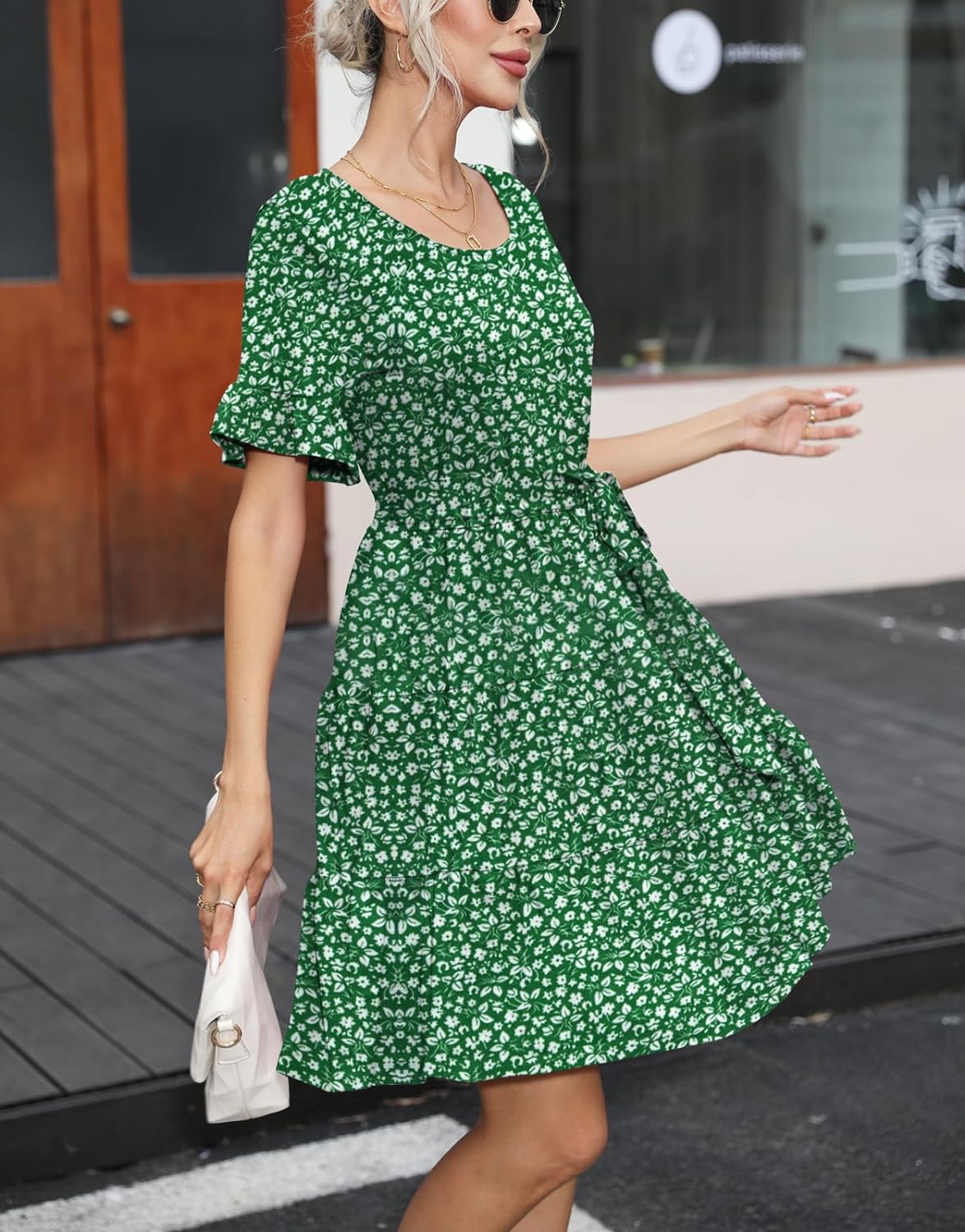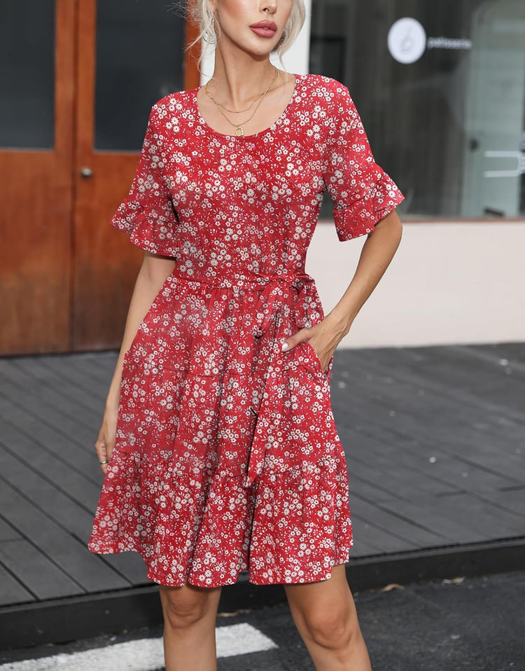 nclook Women's Summer Casual Dress Elastic Skin-Friendly Breathable Fabric Crew-Neck Adjustable Waist Belt with Pockets Black