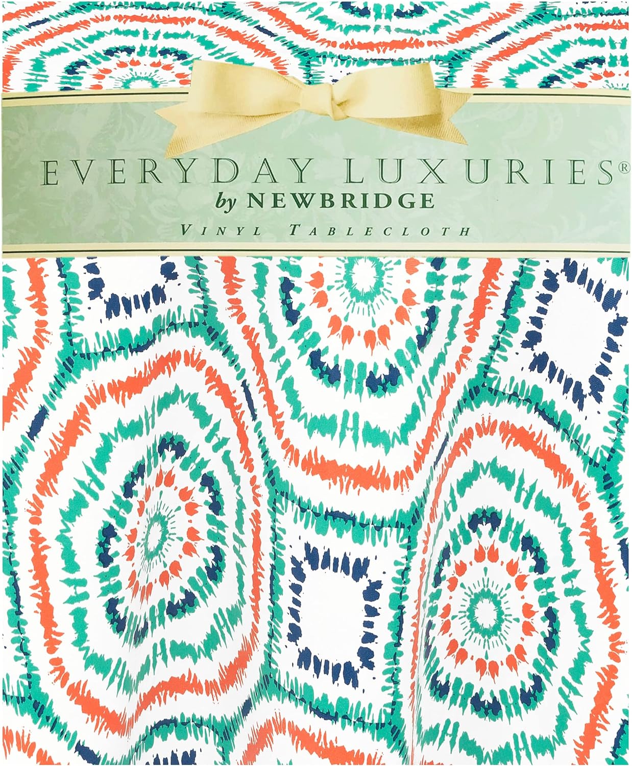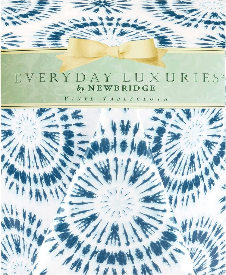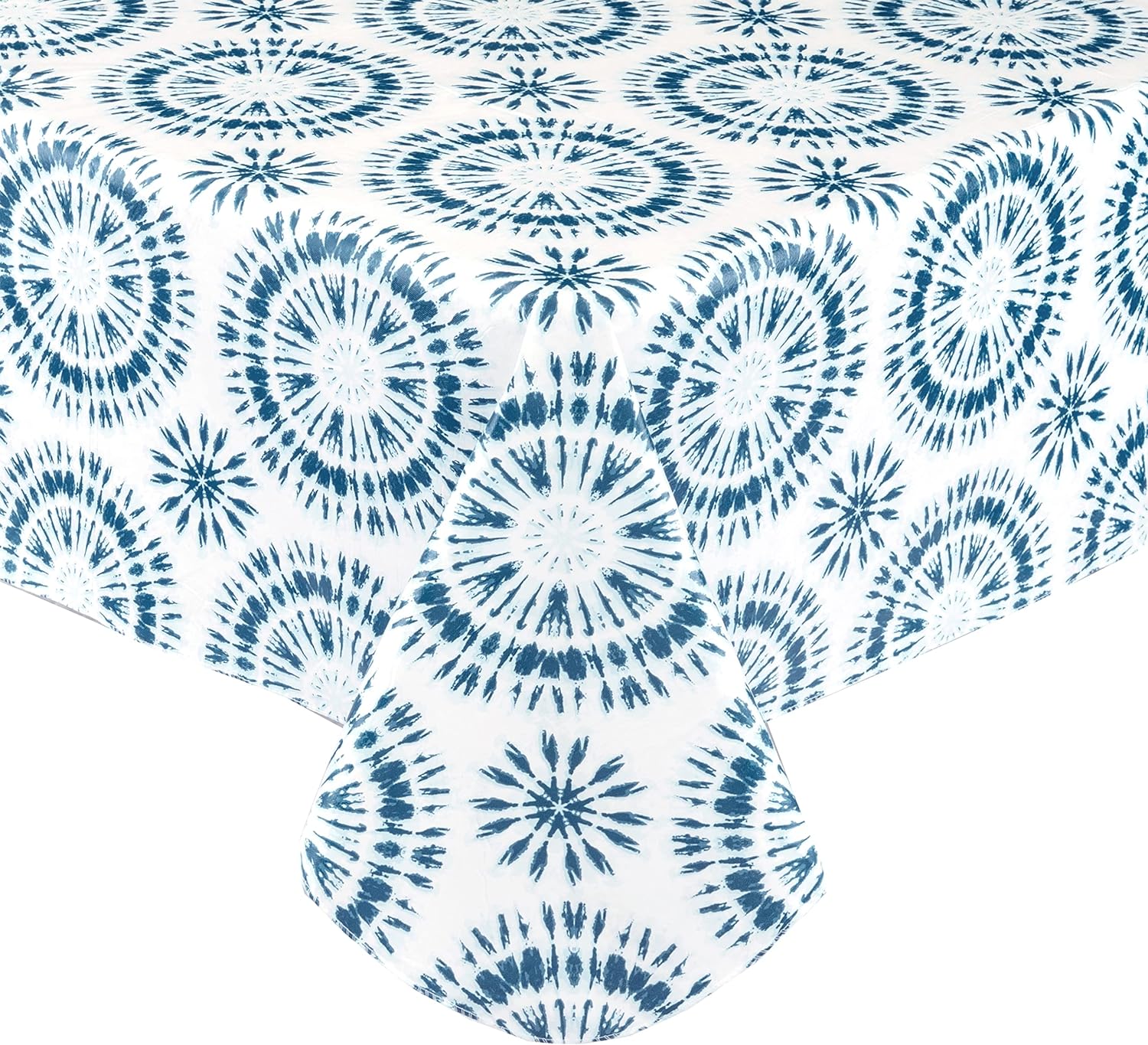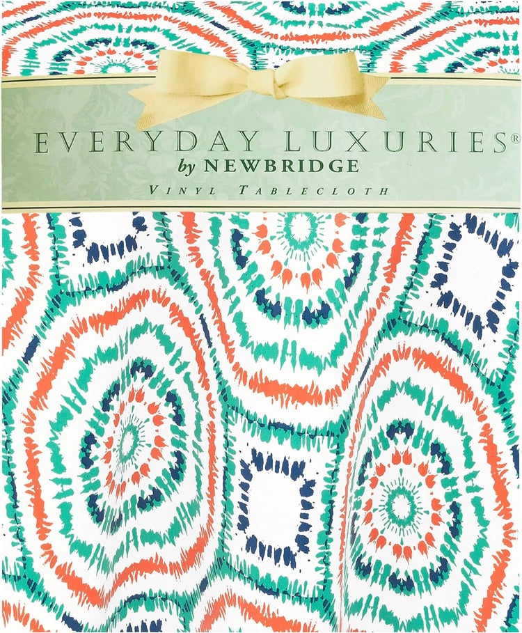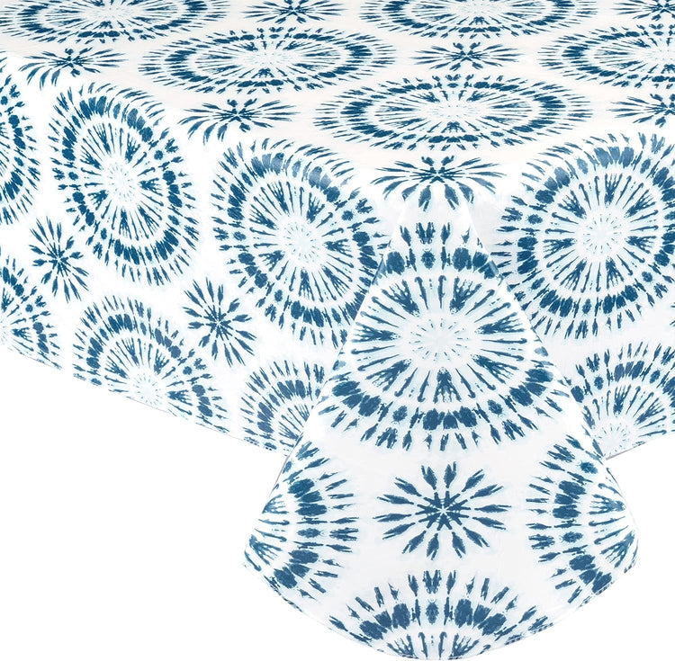 - STYLING: The Newbridge Tie Dye Geo Whimsy Spring and Summer Flannel Backed Vinyl Tablecloth features a colorful geometric shabby chic tie dye print in shades of blue, coral and navy on a white background
