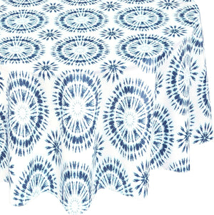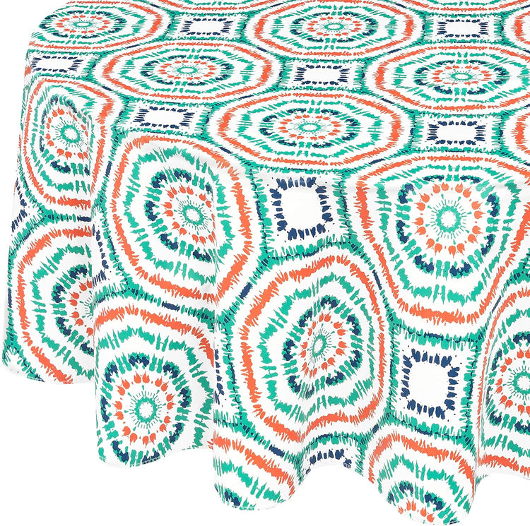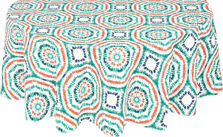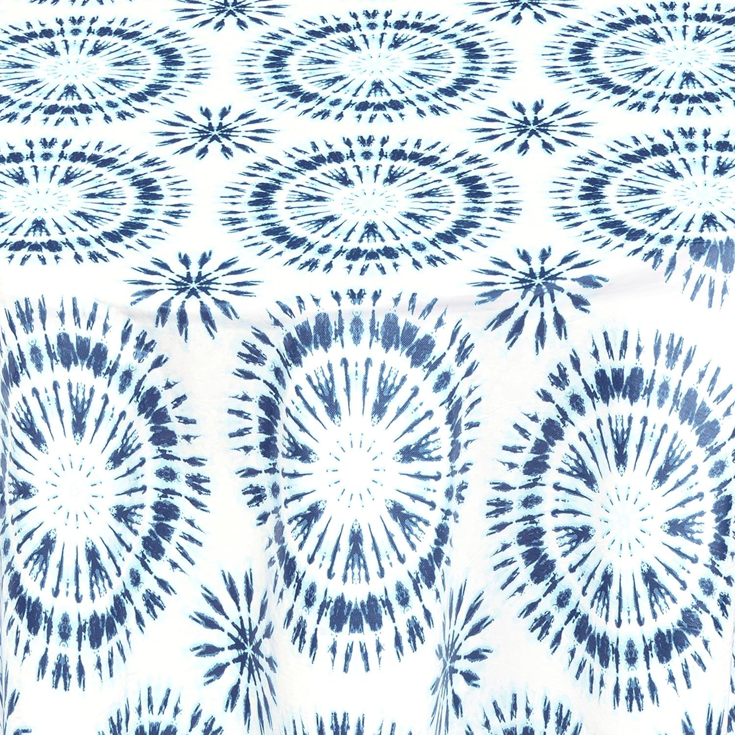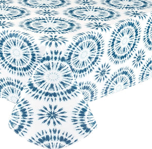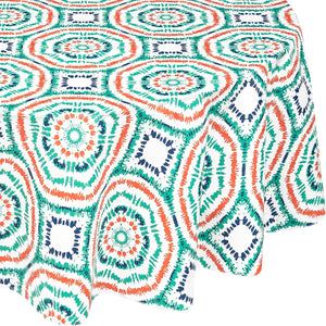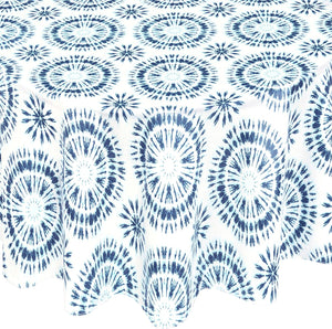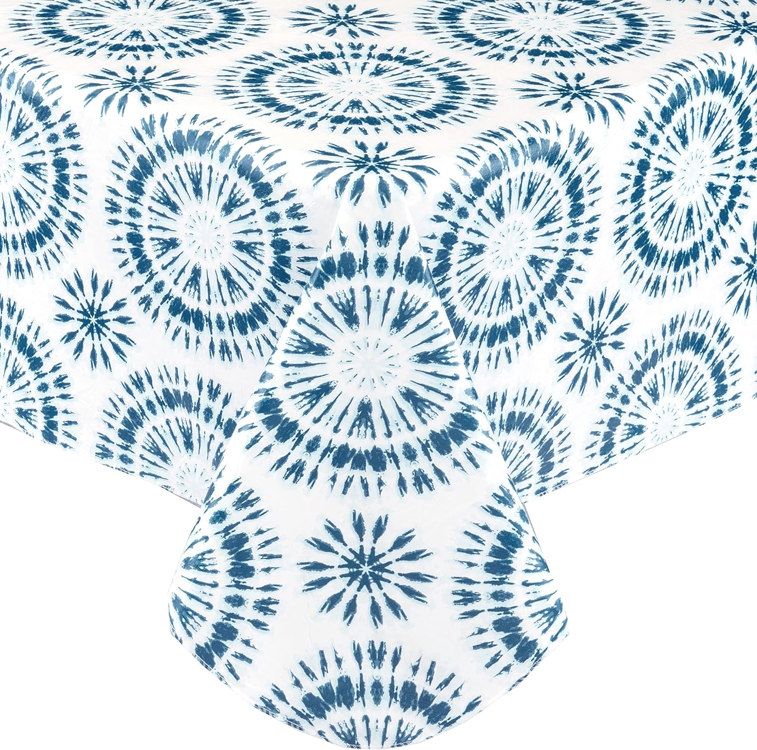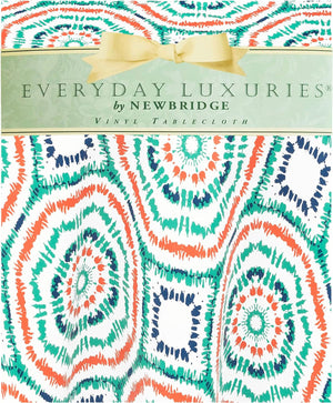 - STYLING: The Newbridge Tie Dye Geo Whimsy Spring and Summer Flannel Backed Vinyl Tablecloth features a colorful geometric shabby chic tie dye print in shades of blue, coral and navy on a white background