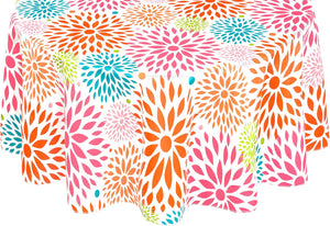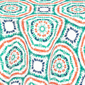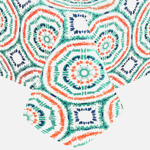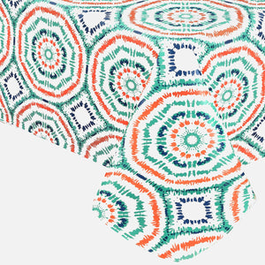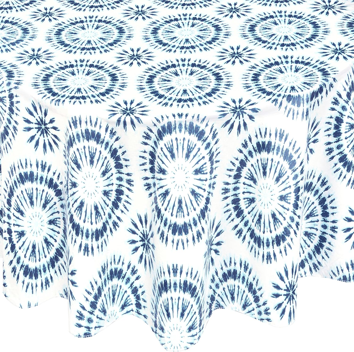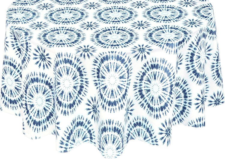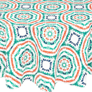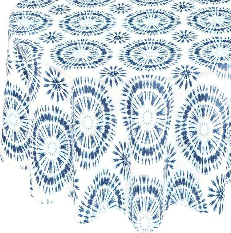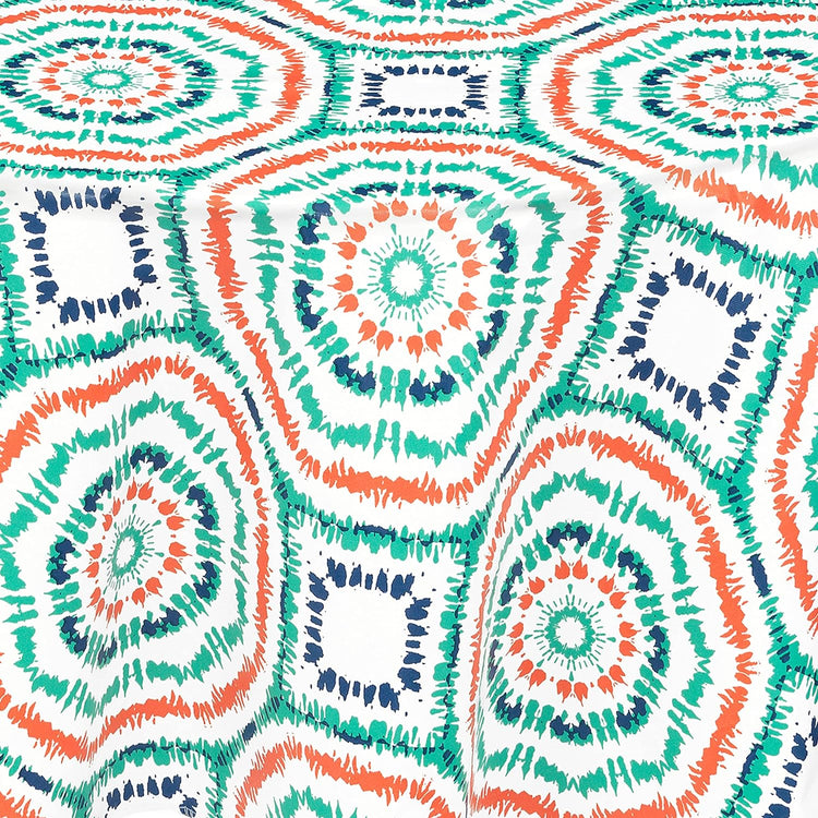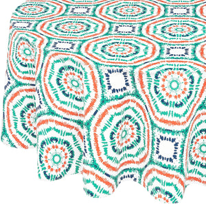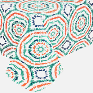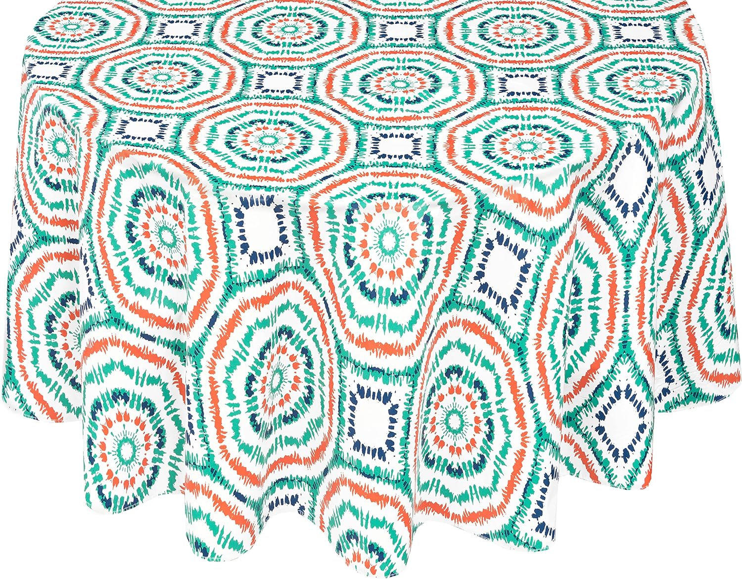 - STYLING: The Newbridge Tie Dye Geo Whimsy Spring and Summer Flannel Backed Vinyl Tablecloth features a colorful geometric shabby chic tie dye print in shades of blue, coral and navy on a white background