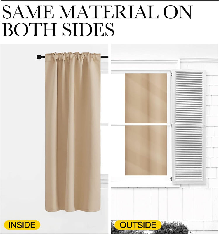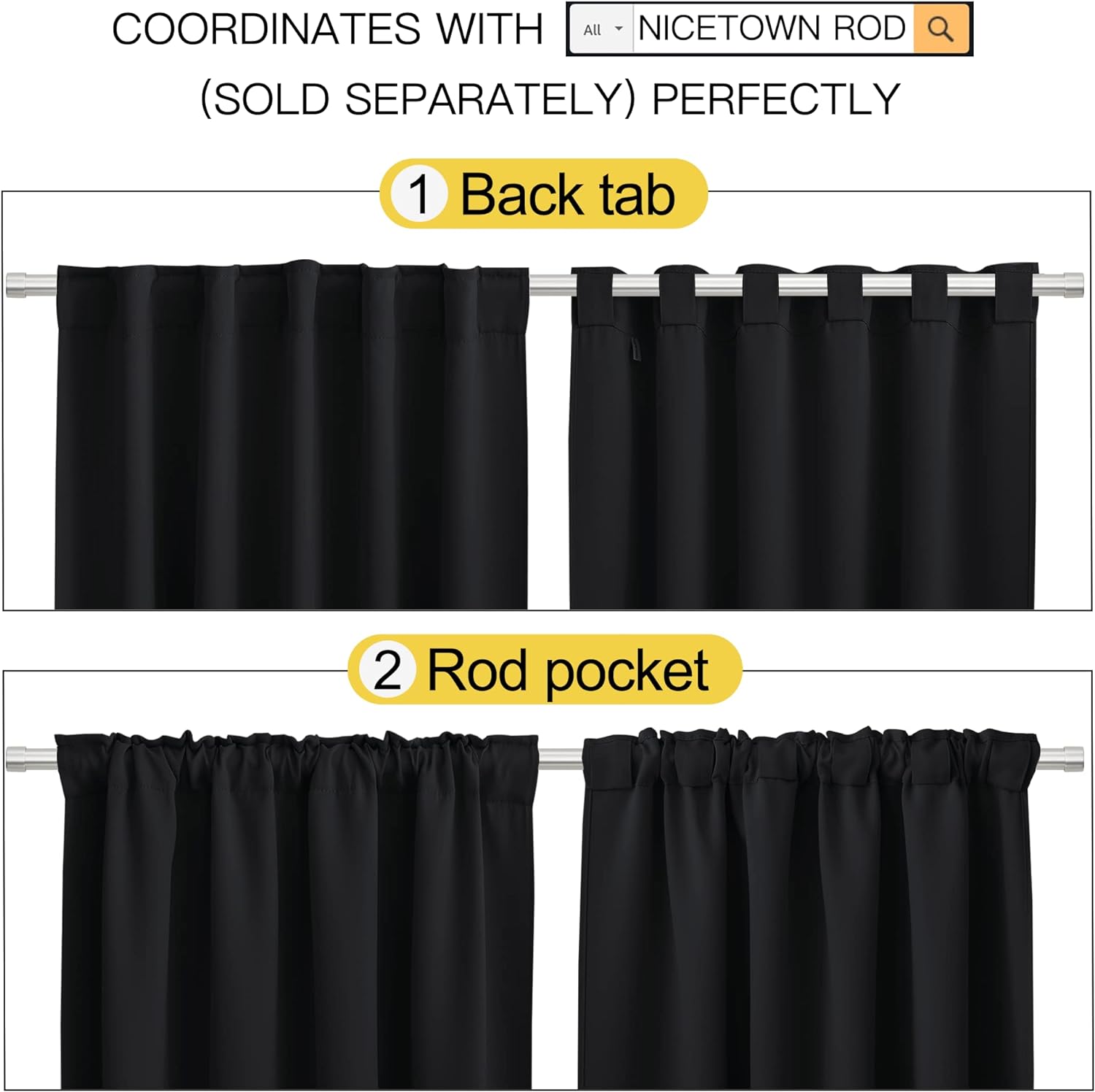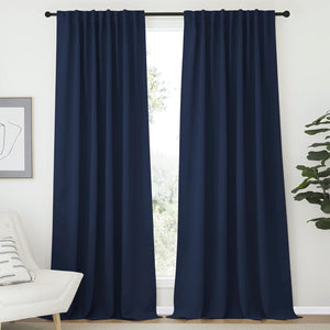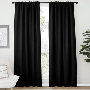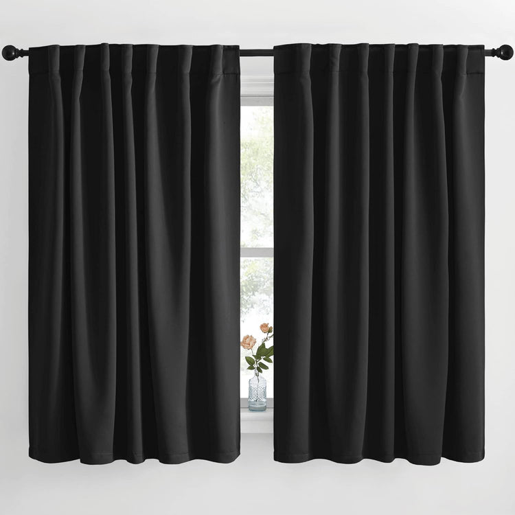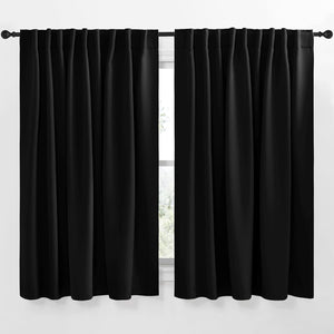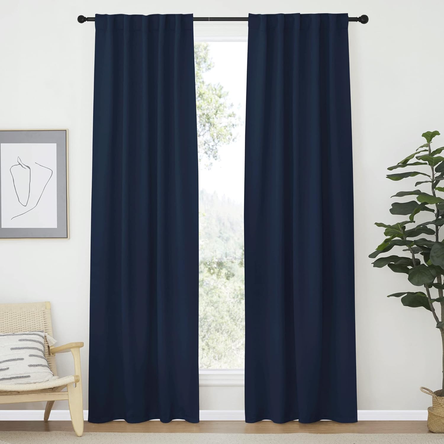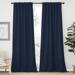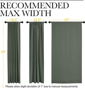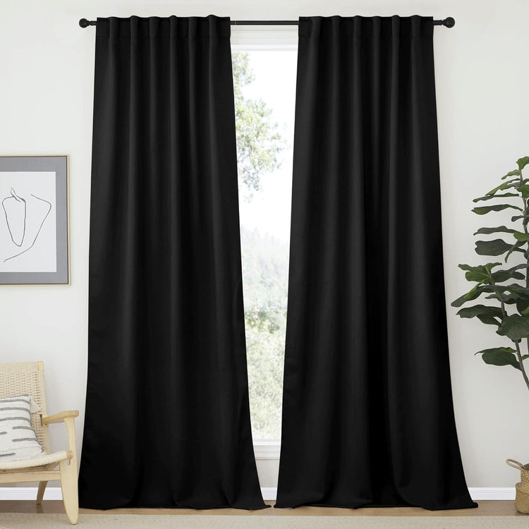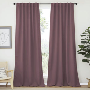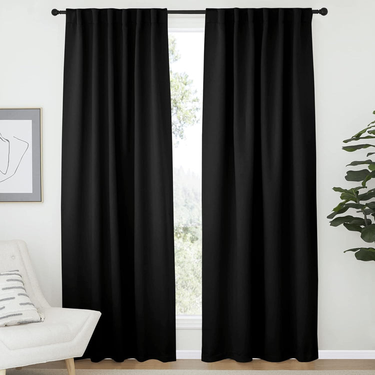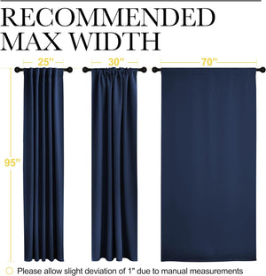 - READY-MADE: Set includes 2 blackout curtain panels, each panel measuring 52" wide x 95" length with 7 back loops. Quality fabric without liner feels soft and heavy. Thread trimmed and wrinkle-free, both sides are the same color.