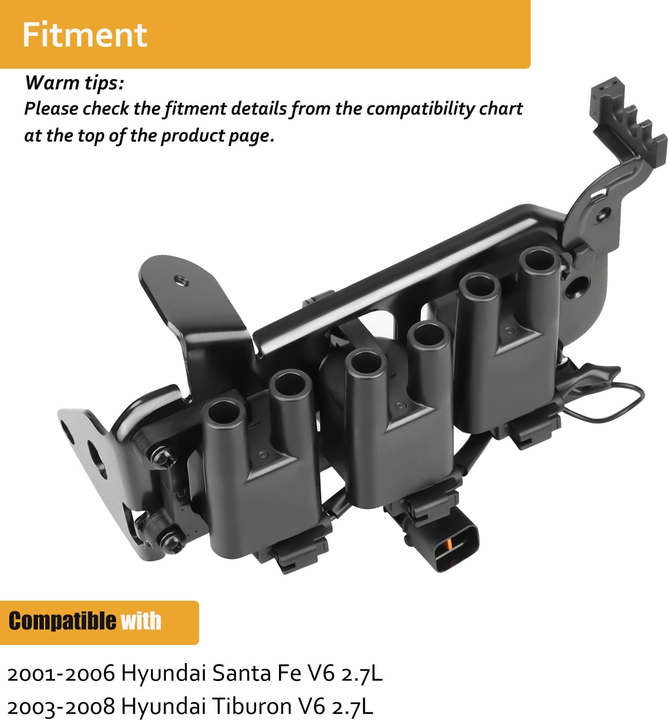 - [Vehicles Fit] - Coil pack replacement for V6 2.7L 2001 2002 2003 2004 2005 2006 Hyundai Santa Fe, 2003 2004 2005 2006 2007 2008 Hyundai Tiburon