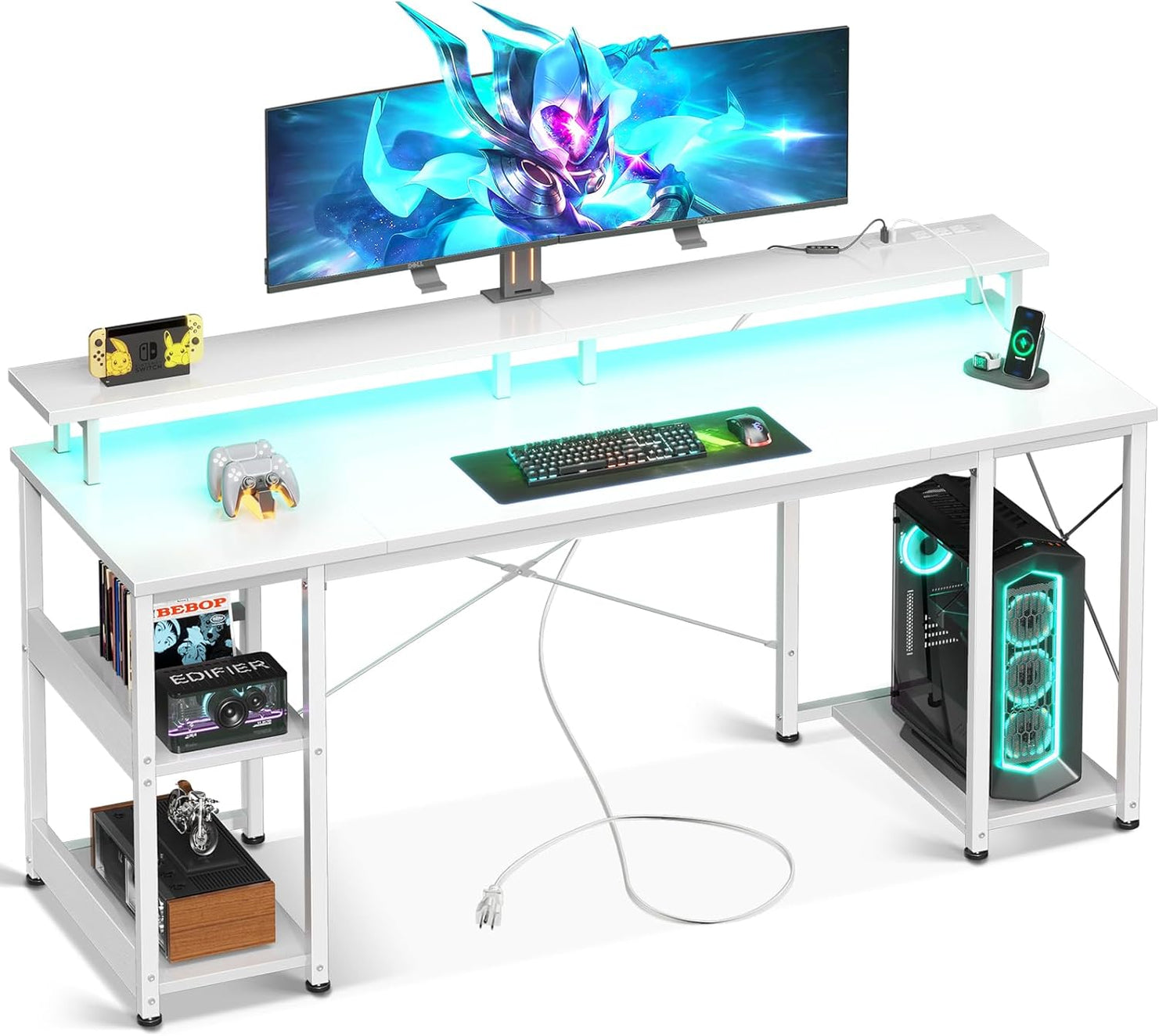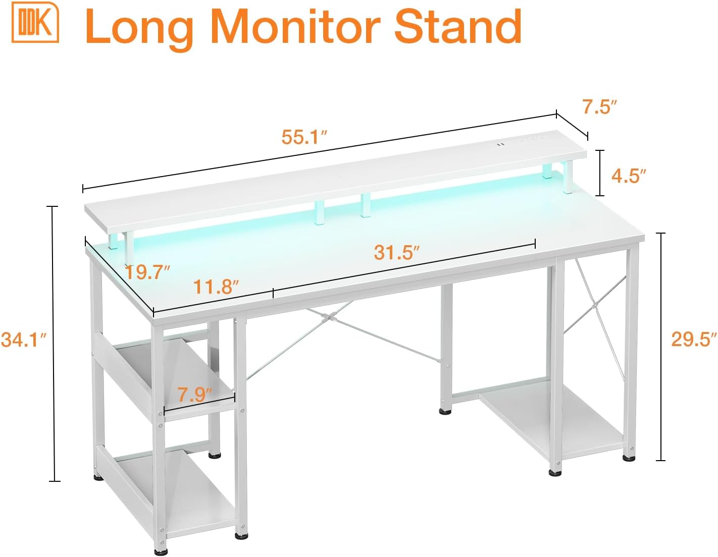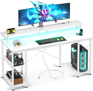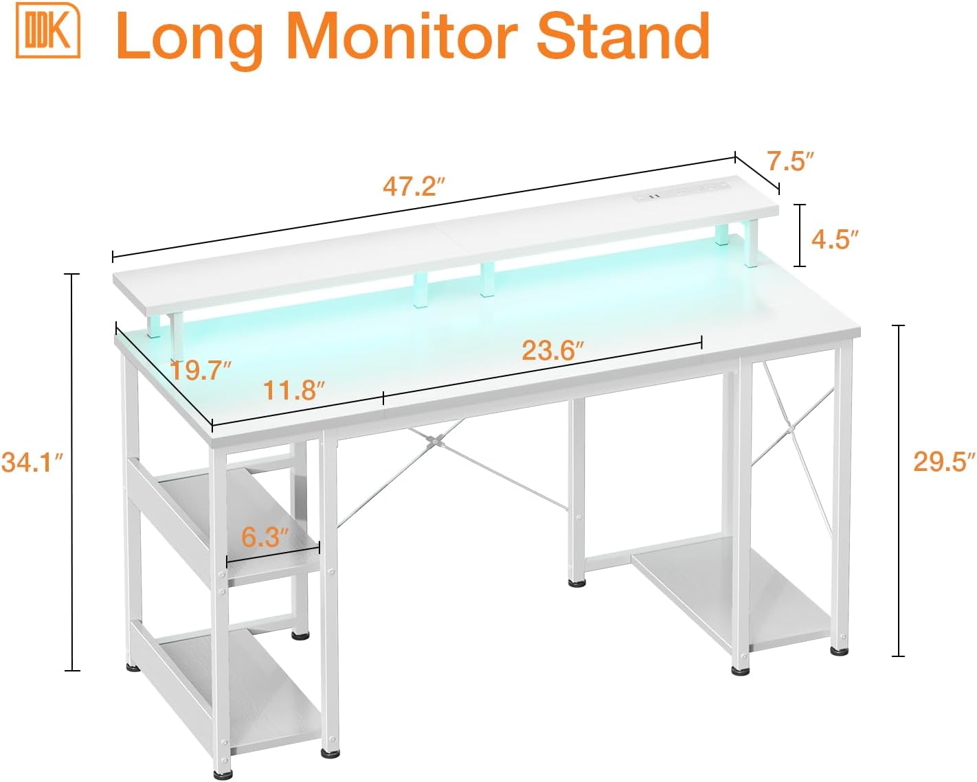 ODK 48 inch Computer Desk with Power Outlets & LED Lights, Gaming Desk with Monitor Stand & Storage Sheves, Home Office Desk, White