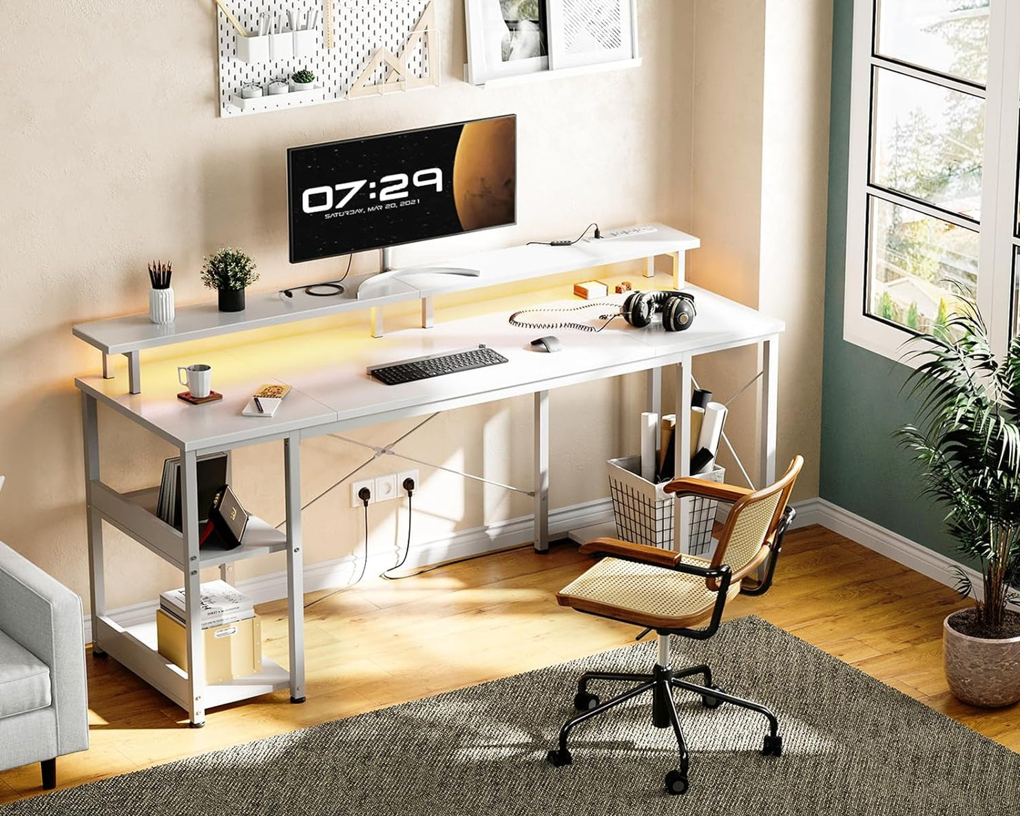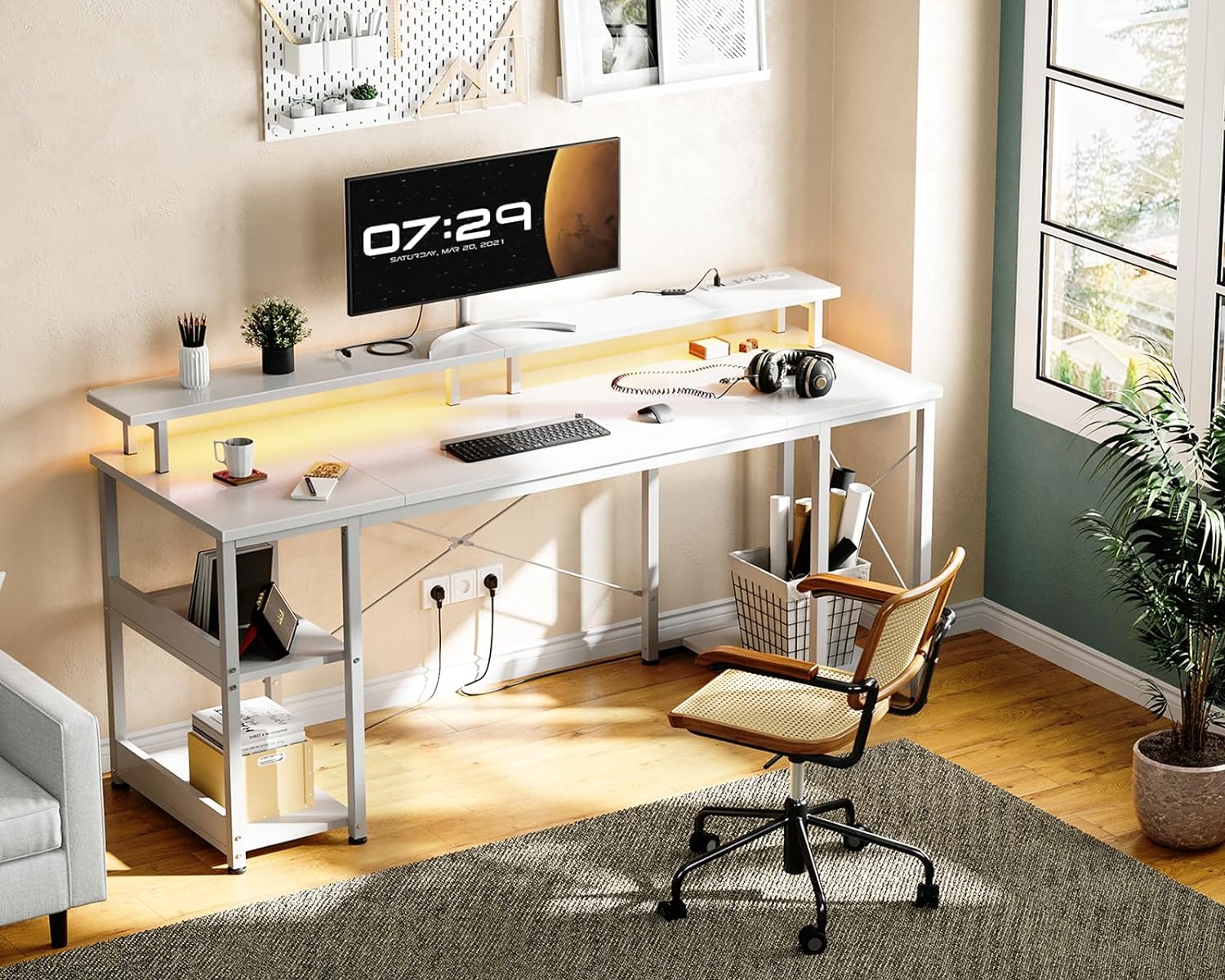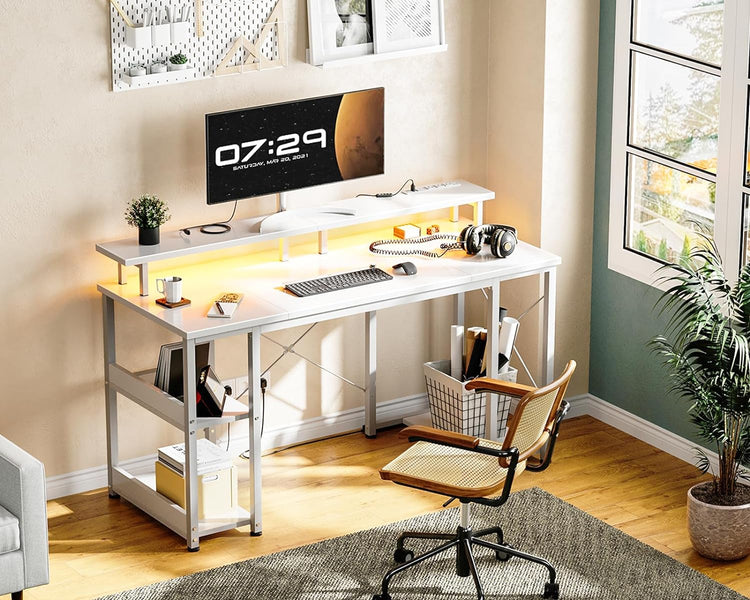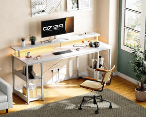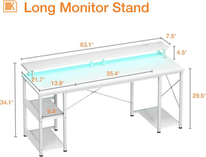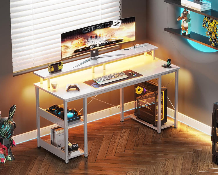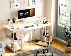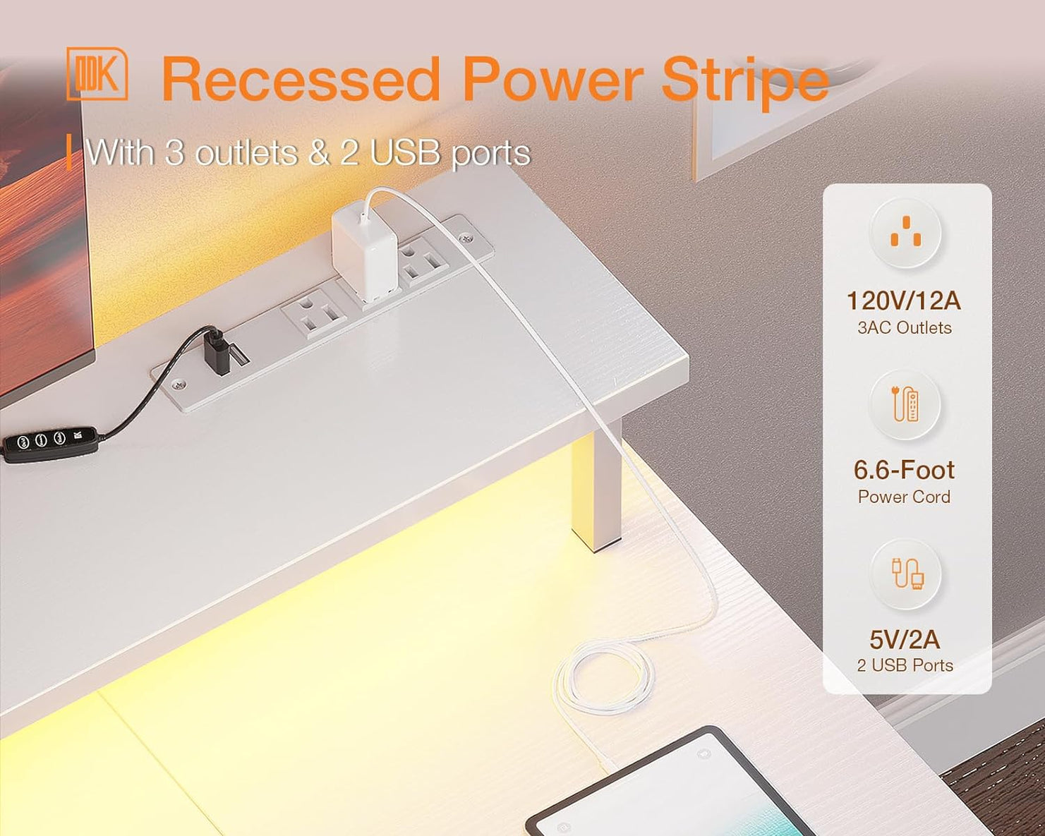 ODK 48 inch Computer Desk with Power Outlets & LED Lights, Gaming Desk with Monitor Stand & Storage Sheves, Home Office Desk, White