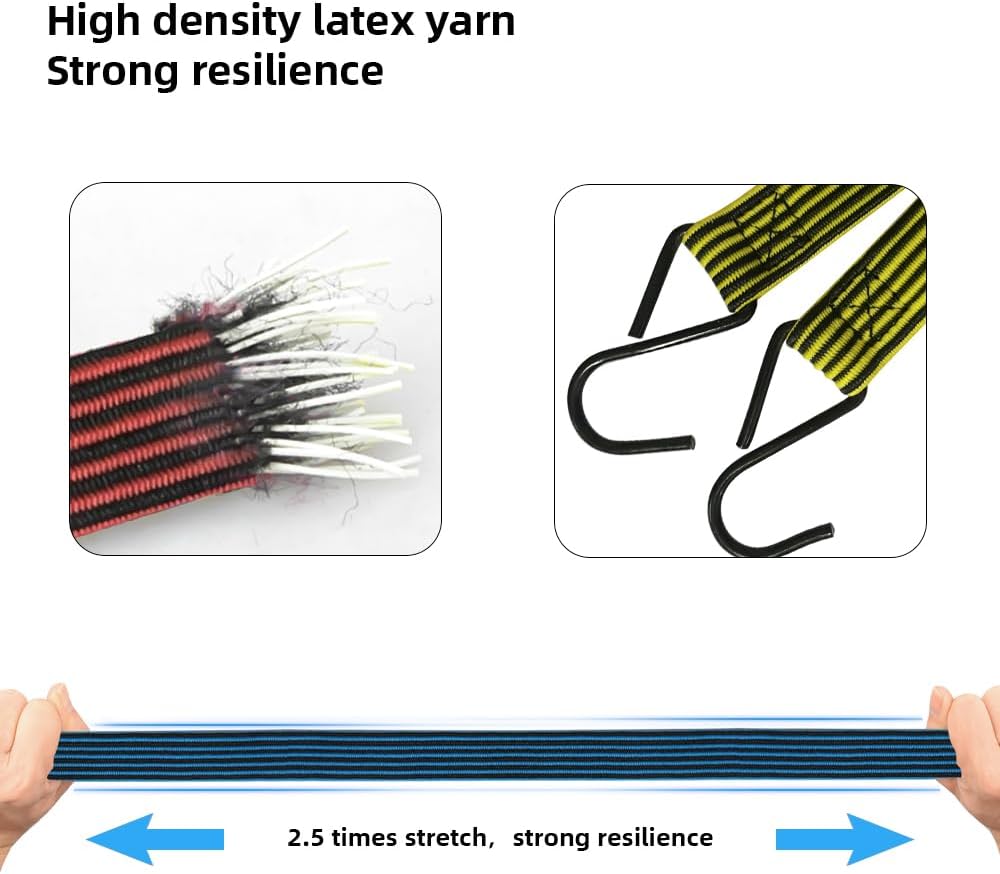- Stainless Steel Hooks: The flat elastic uses heavy duty stainless steel hooks that are strong and unbreakable, while other similar products use light and fragile plastic hooks. That's why our flat bungee cords are perfect for tying heavy loads.
