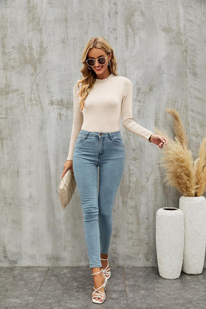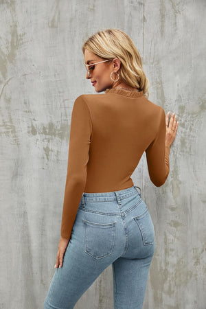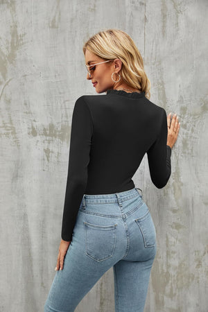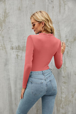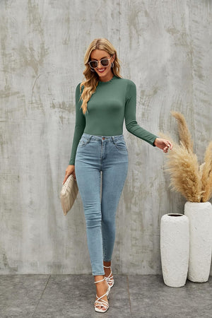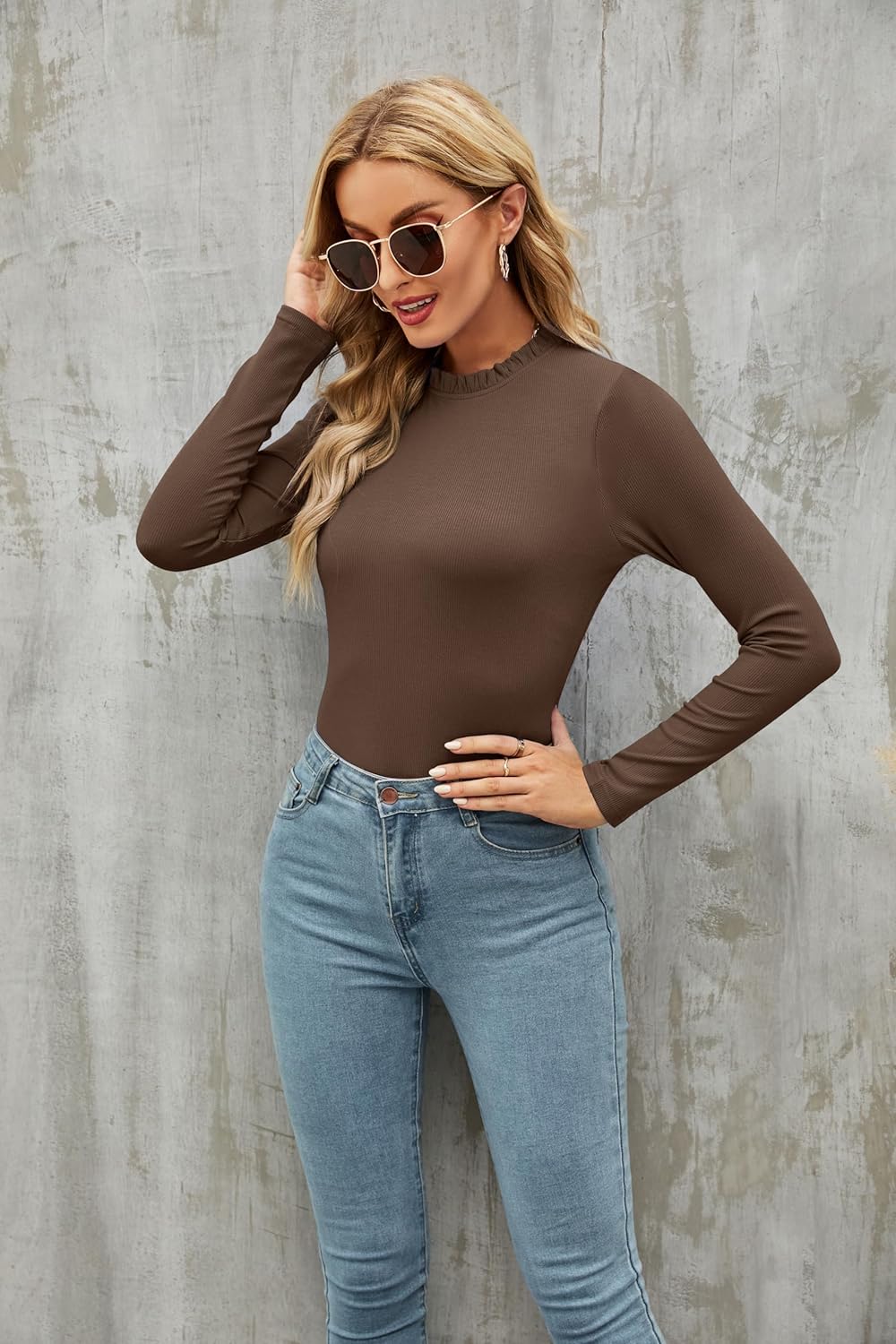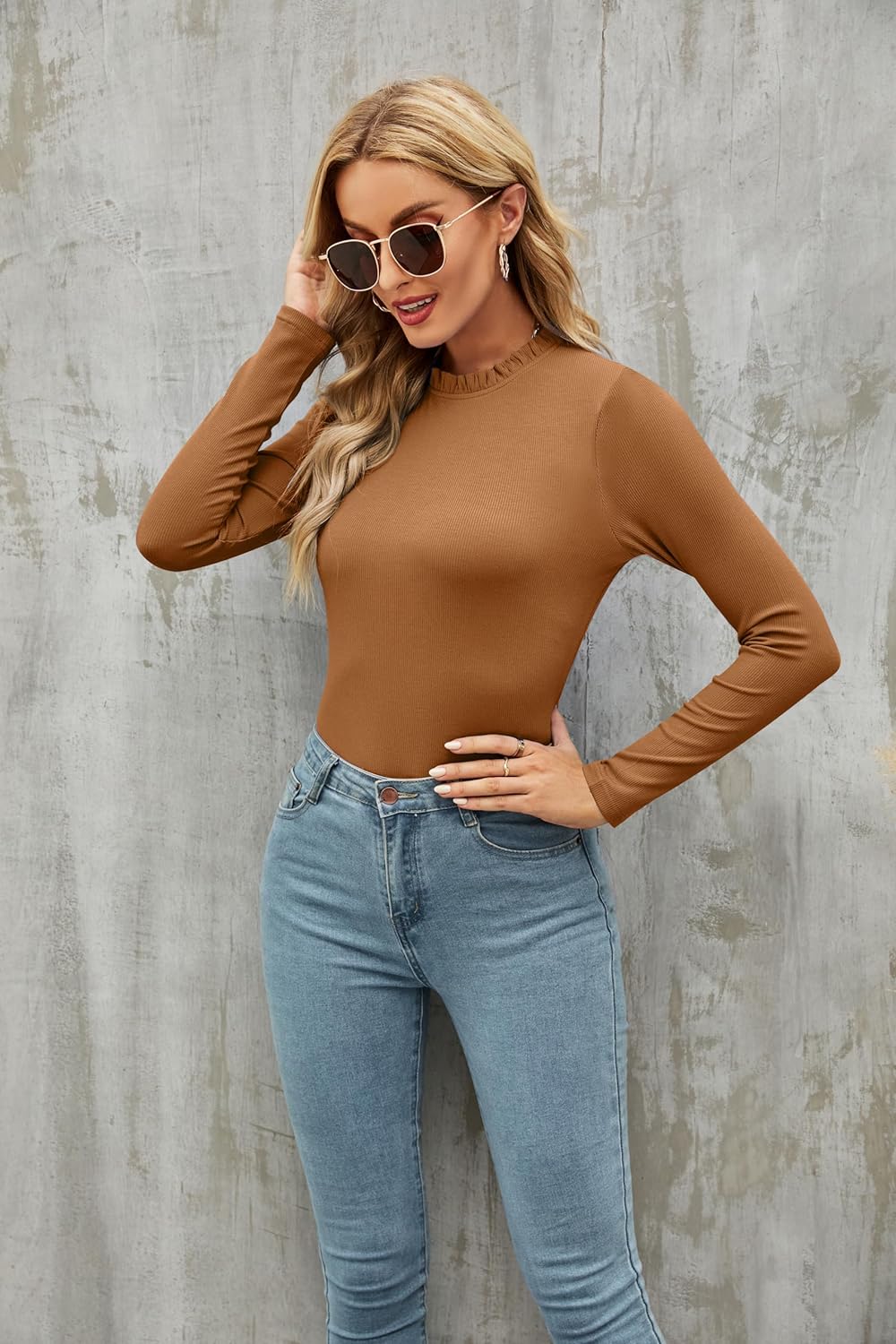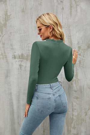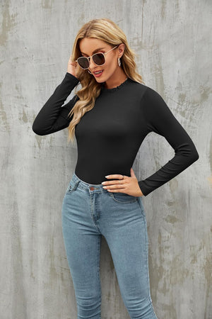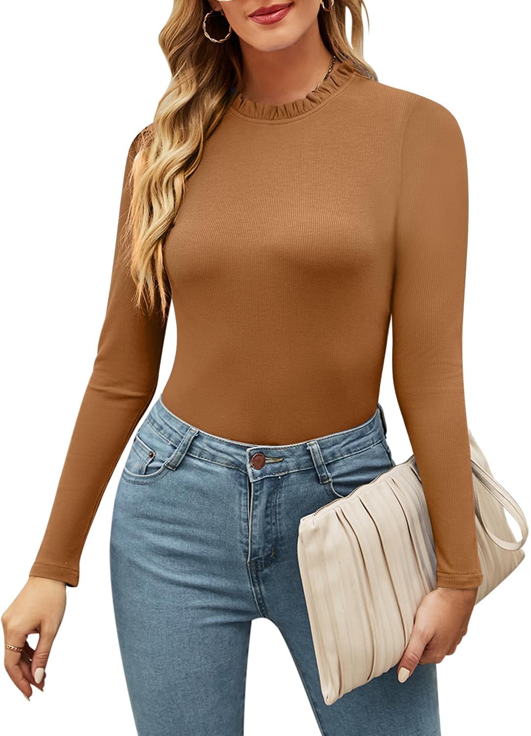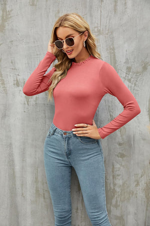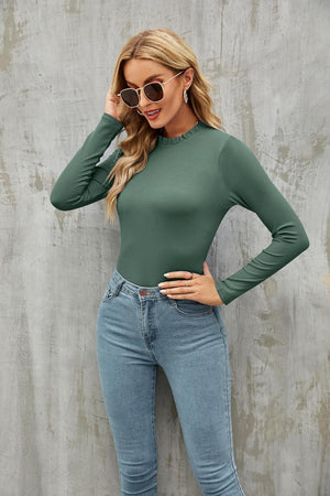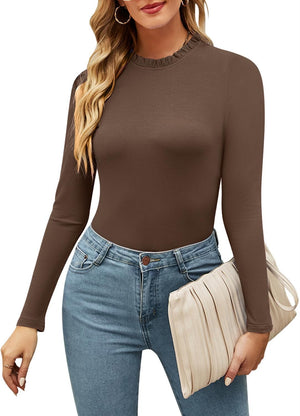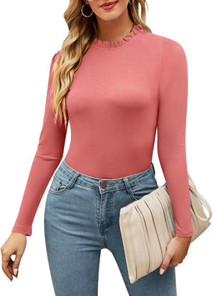 oten Women's Basic Ruffle Mock Turtle Neck Long Sleeve Slim Fit Stretchy Ribbed Bodysuit Tops