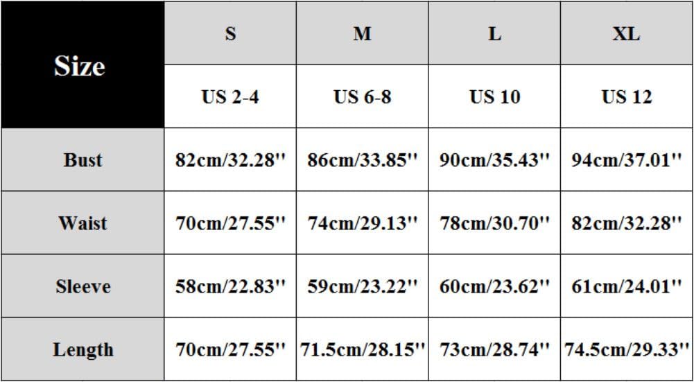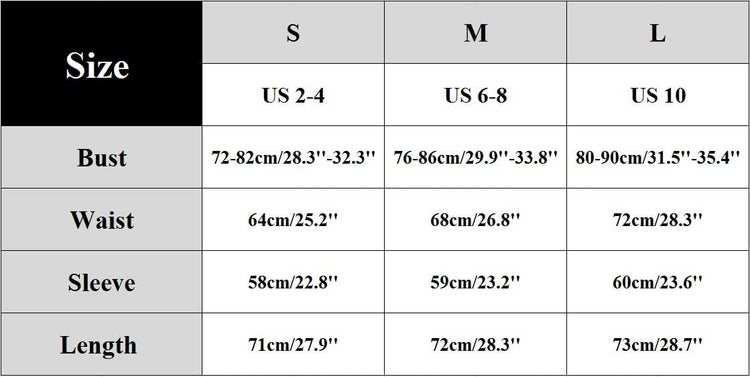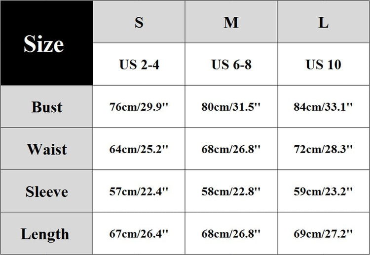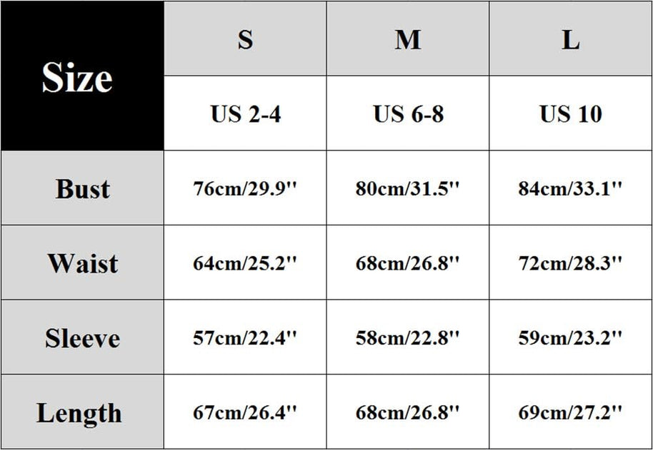XL : Bust- 88cm/34.6"---- Sleeve-60cm/23.6"---- Waist 76cm/29.9"---- Length-70cm/27.6"