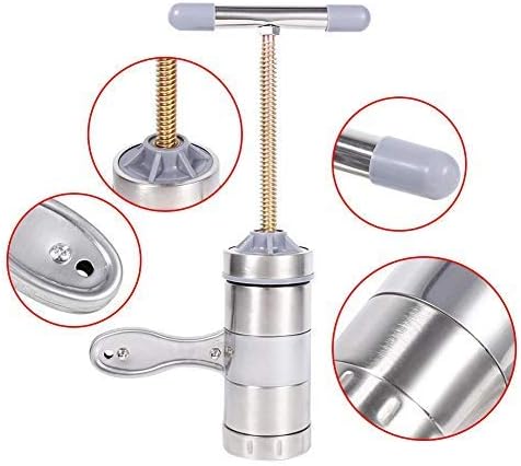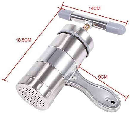 Made of high quality stainless steel material, anti-rust and corrosion-resistant, durable and sturdy to use. Easy operation, saving time, ideal for making your noodles in seconds. Coming with 5 mold heads, you can make different thickness noodles. Can be cleaned by water and keep as bright as new. Can be used to extract juice, perfect for home or restaurant using.