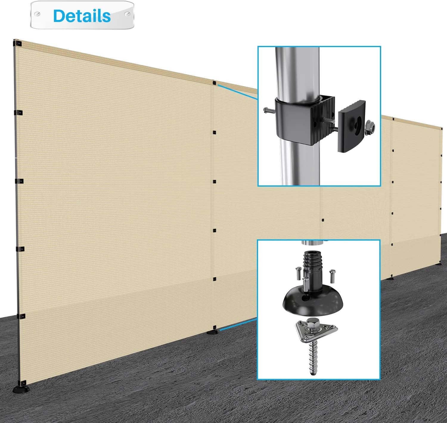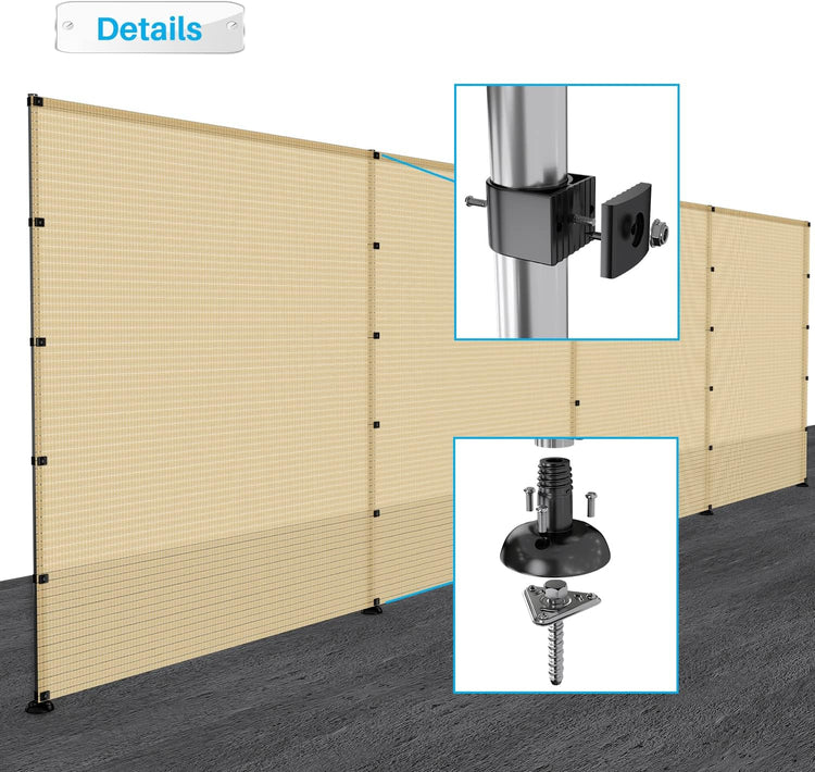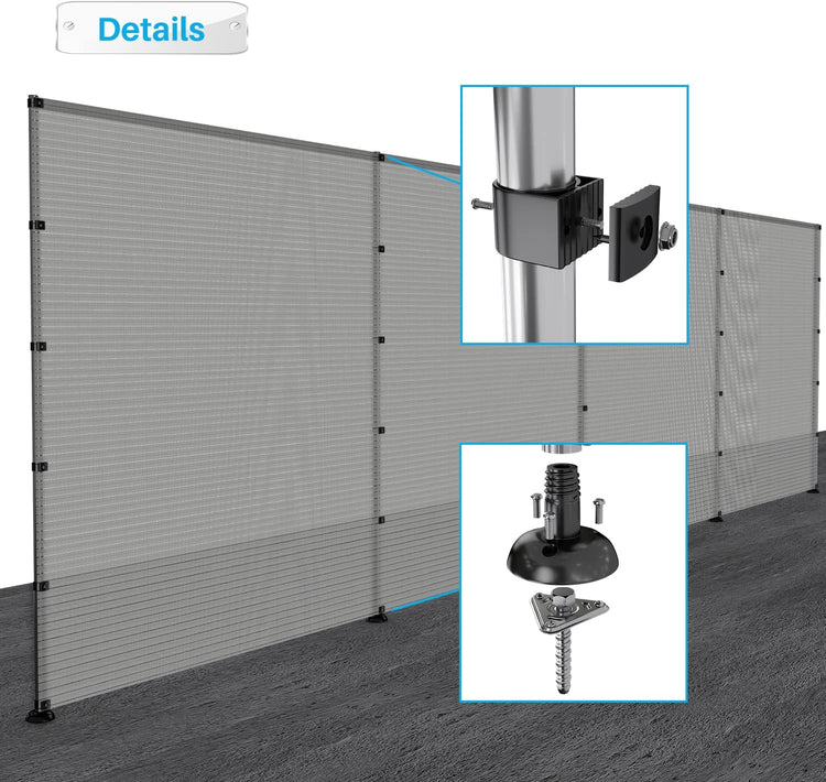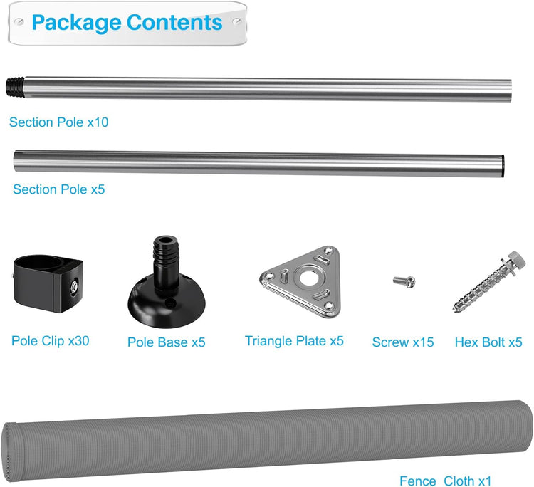 - Please note that Fence Fabric and Poles are unassembled, meaning that you can control the pole spacing. Simply attach Fence Fabric to the Poles with provided Clips.