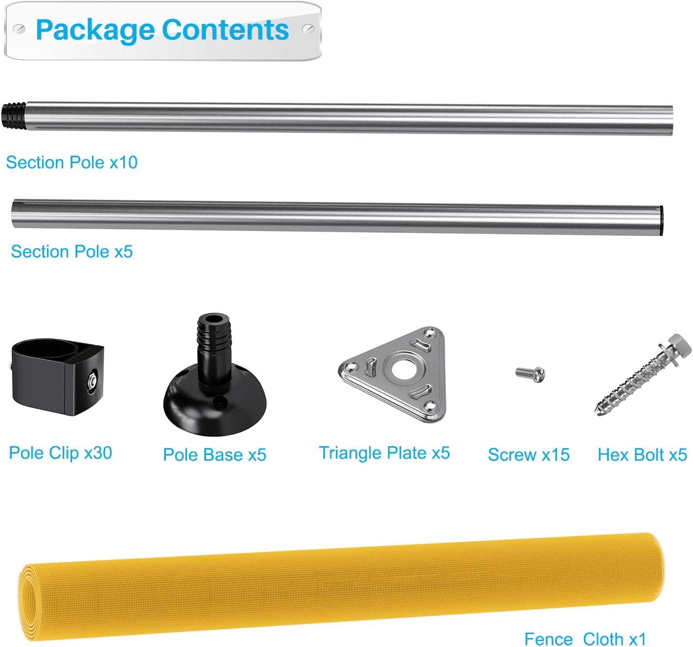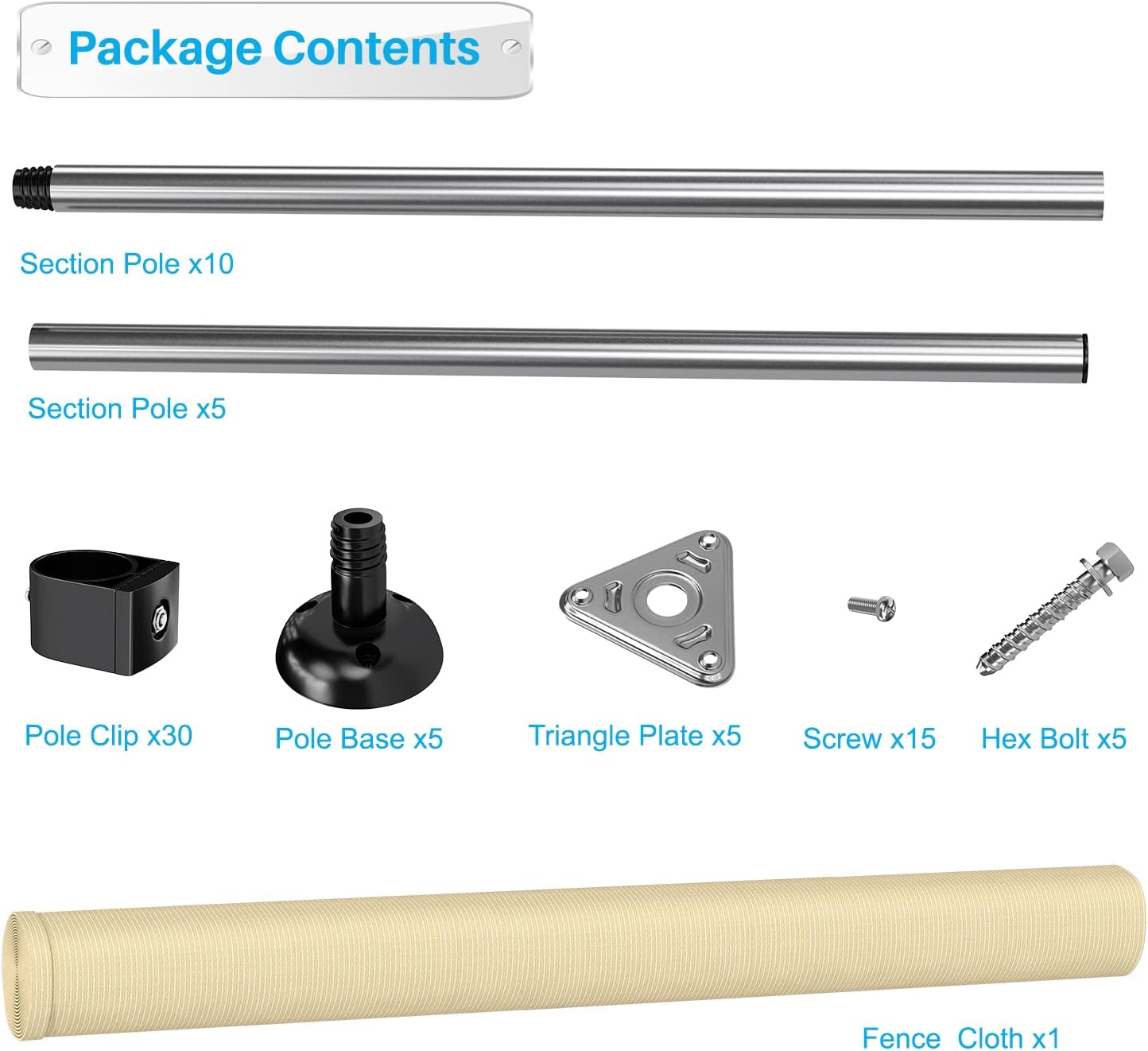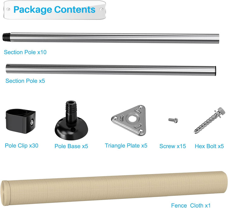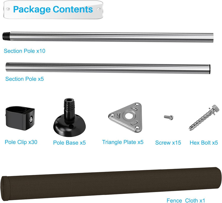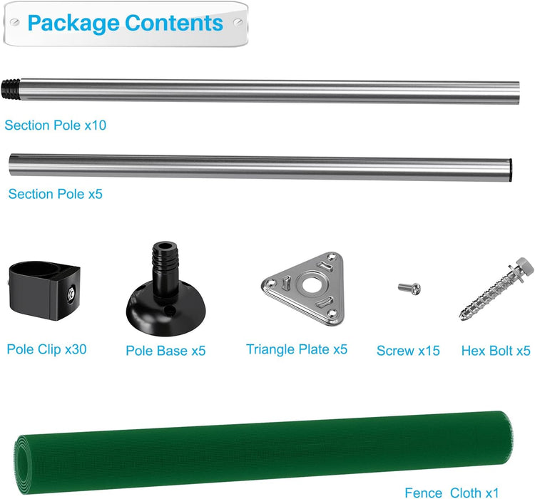 - Fencing kit comes with Fence Poles, Fence Fabric, Pole Bases, Bolts, Clips, Screws, Triangle Plates, Ground Pegs, Tie Down Ropes.