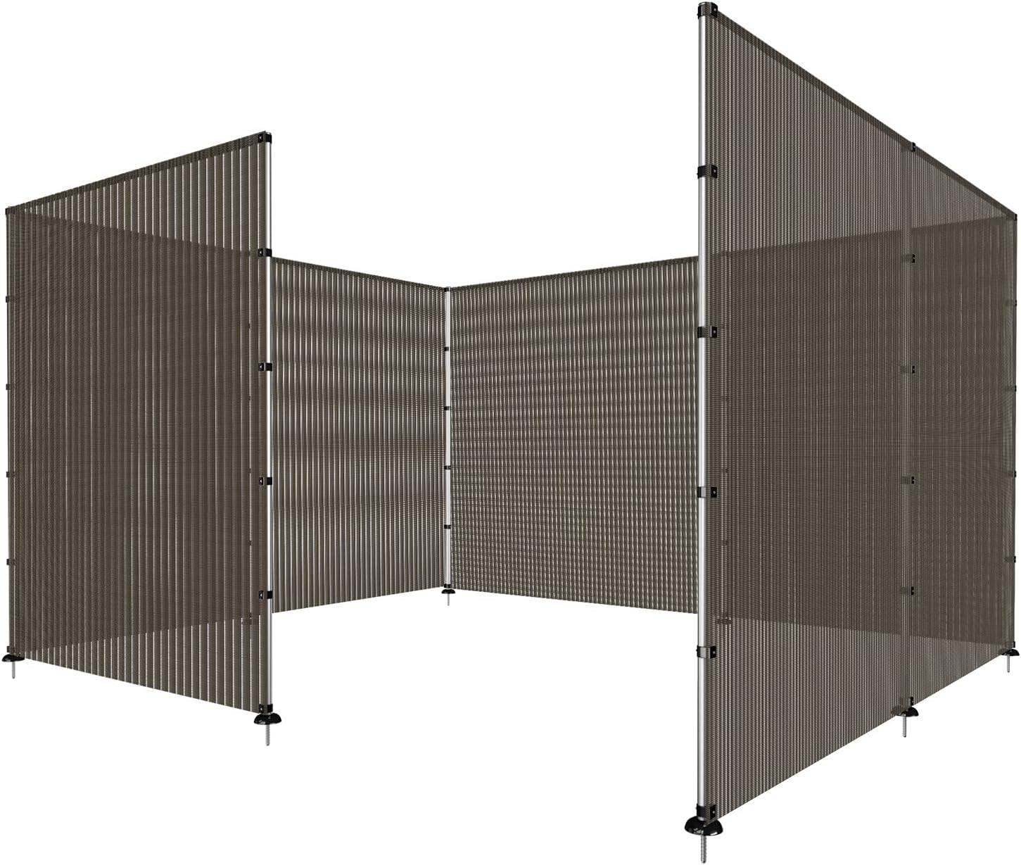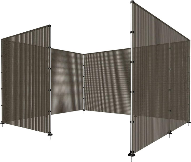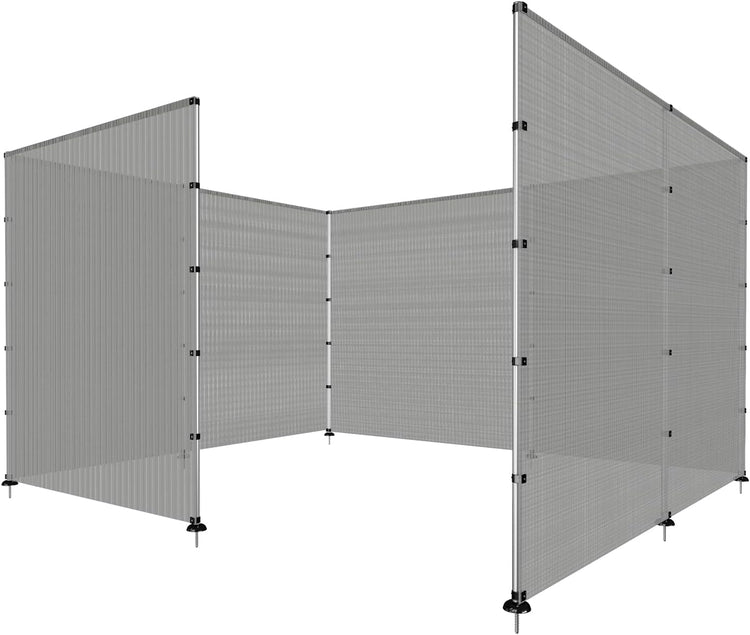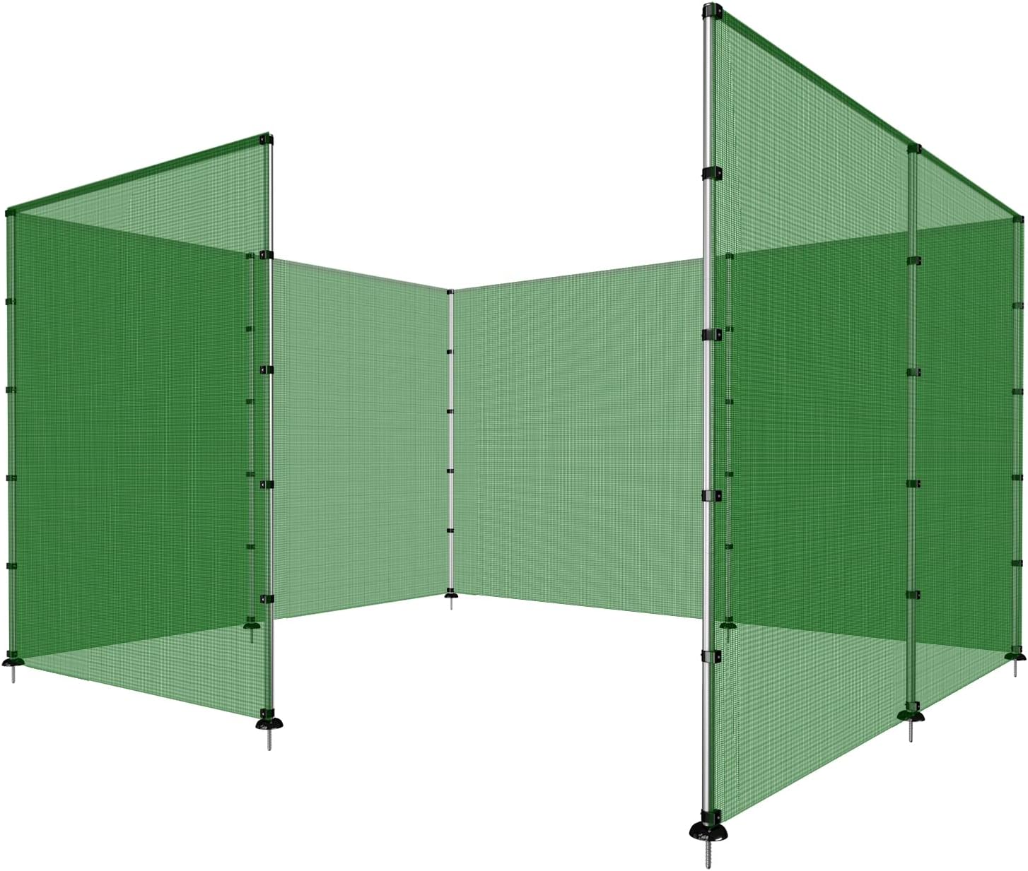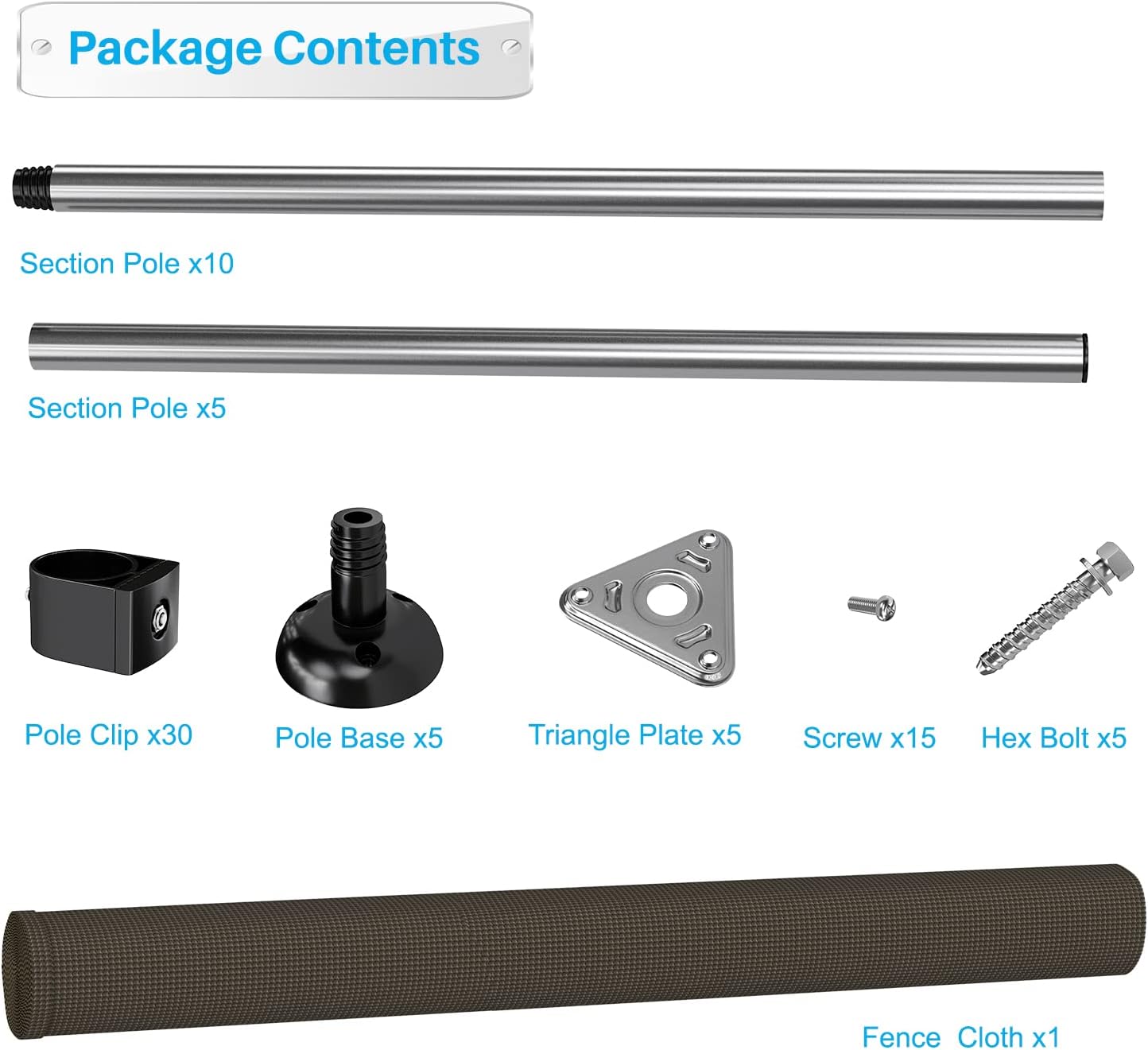 - Fencing kit comes with Fence Poles, Fence Fabric, Pole Bases, Bolts, Clips, Screws, Triangle Plates, Ground Pegs, Tie Down Ropes.
