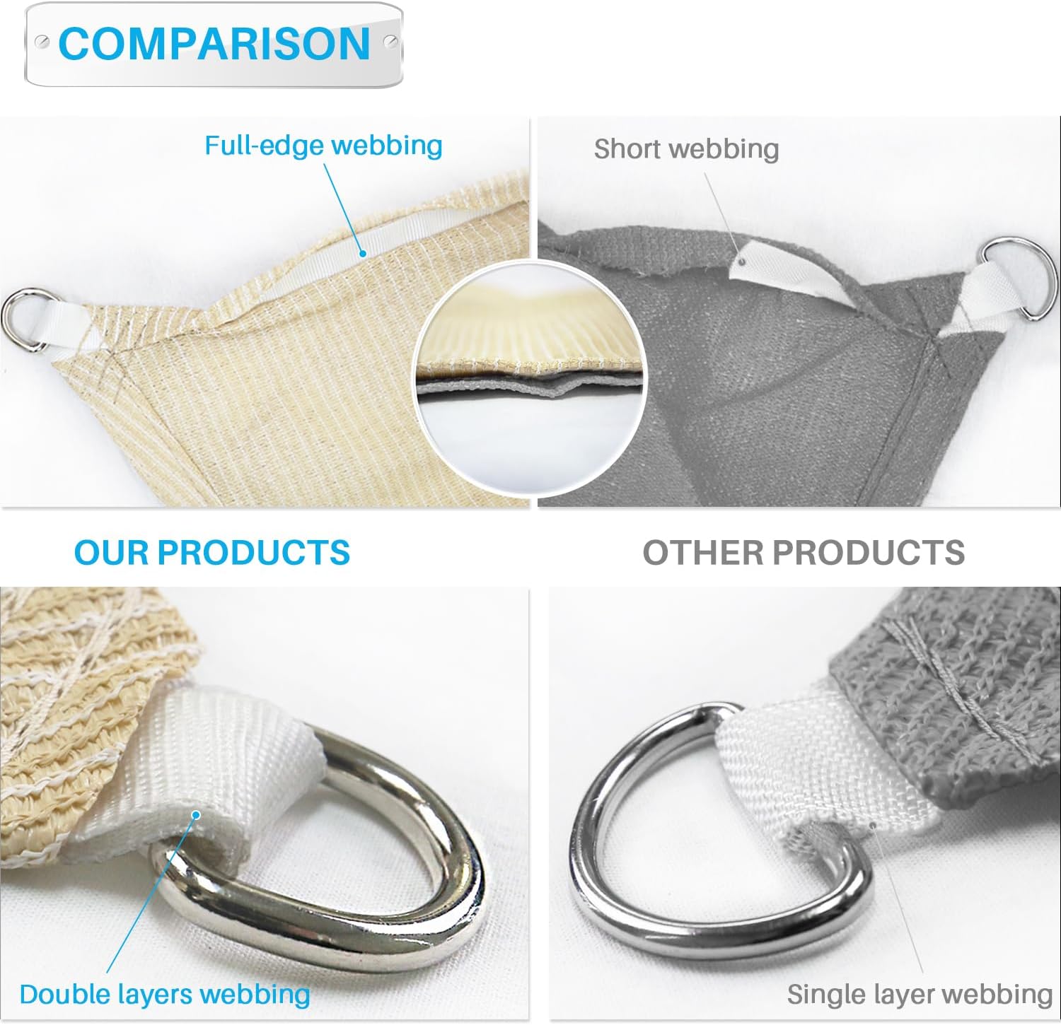 - ★【STRUCTURE DESIGNED FOR DURABILITY】: All edges are constructed with heavy-duty double-layered reinforced stitched seams, preventing frayed edges and out of shape. Each corner ends with a durable D-ring for easy hanging, and extra heavy stitching to help the D-rings strongly attached to the shade sail.