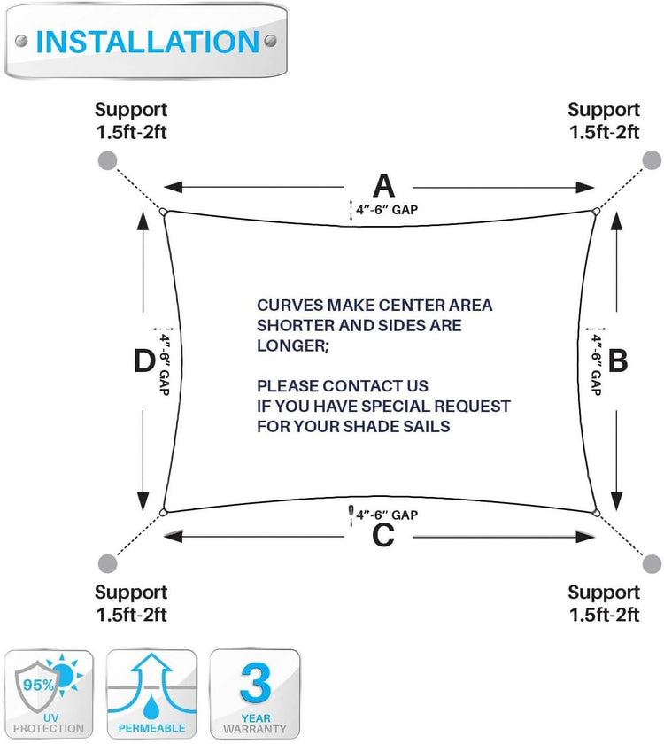 - ★【MEASUREMENT & WARRANTY】: Measurement is taken from D ring to D ring, leave 1 - 1.5 foot space for the hardware kit between shade sail D ring and mounting points, all edges are finished slightly curved so it can be stretched tightly, prevent middle from sagging, shade sails come with 3 years limited warranty, under normal weather and usage. Your 100% satisfaction is our goal.