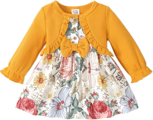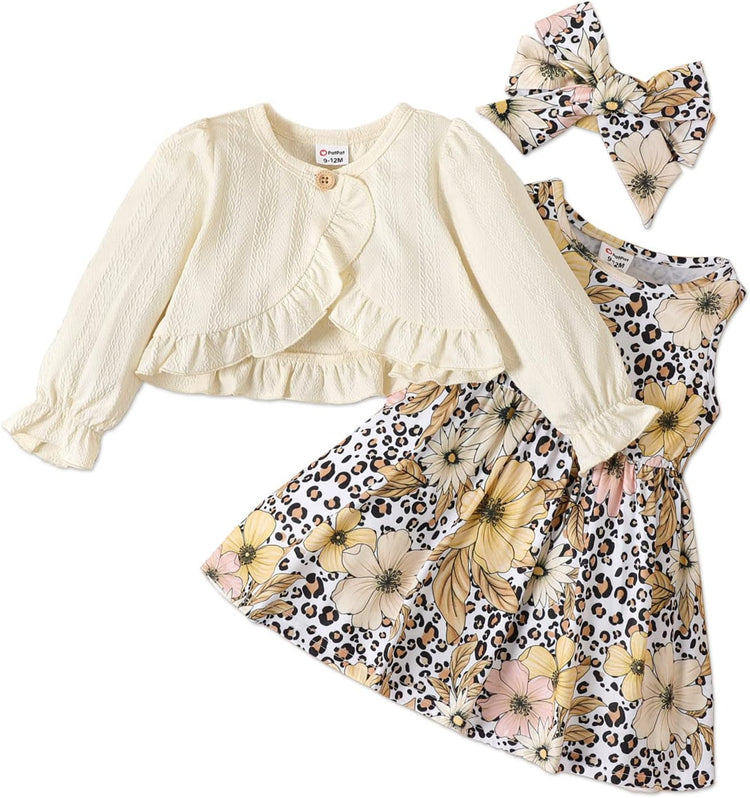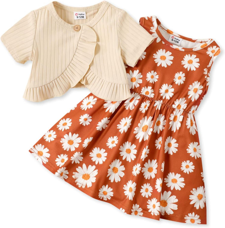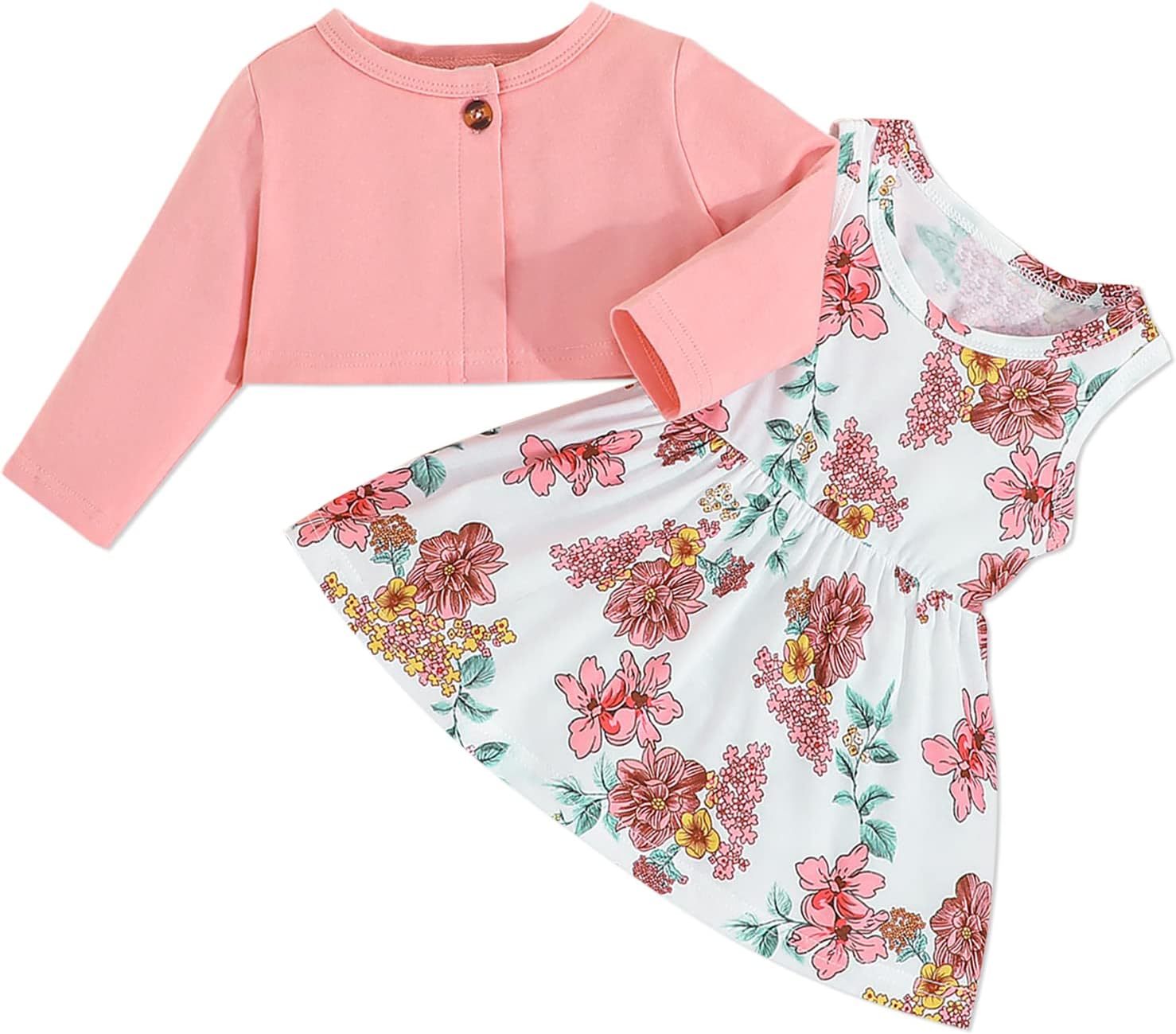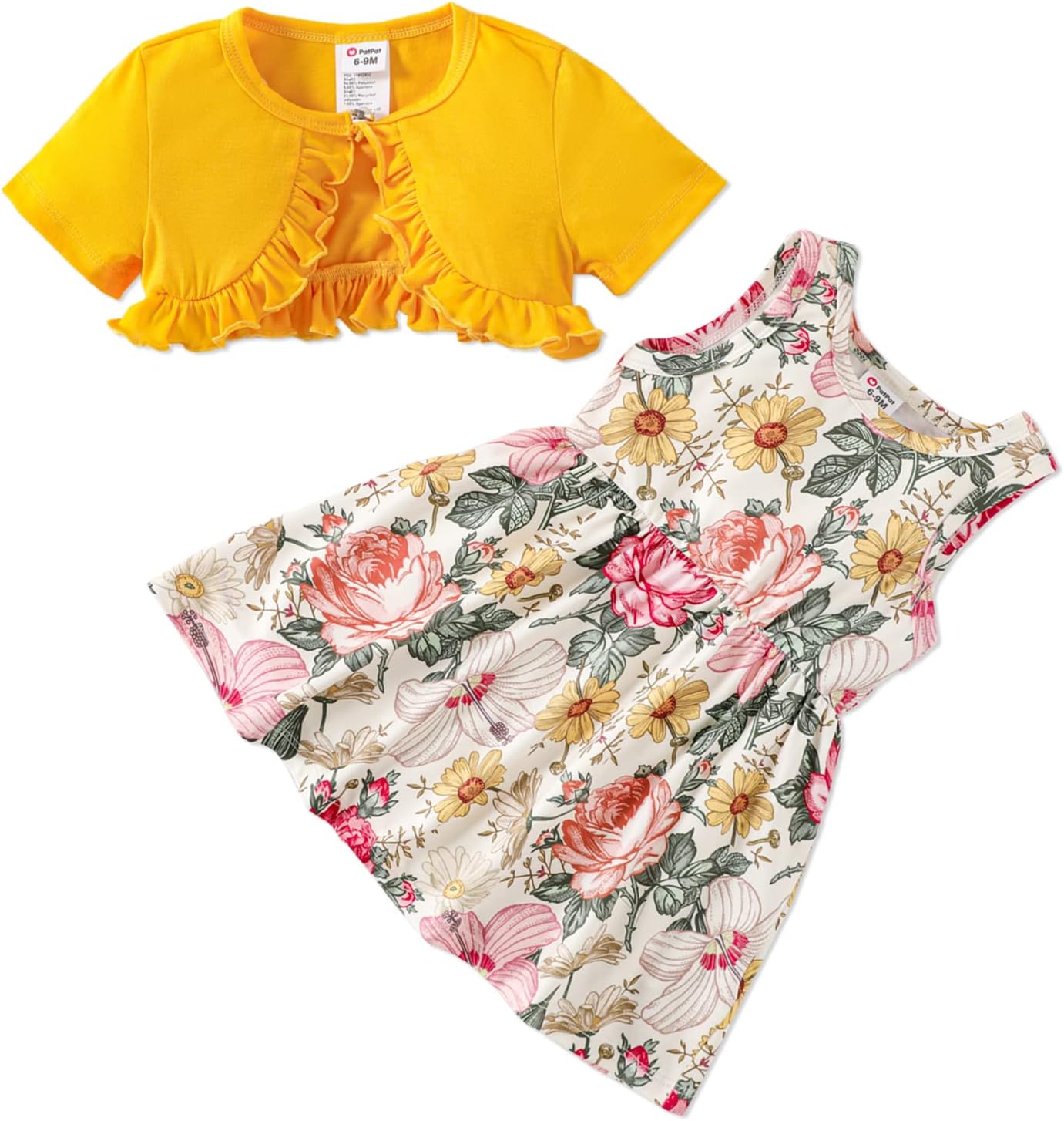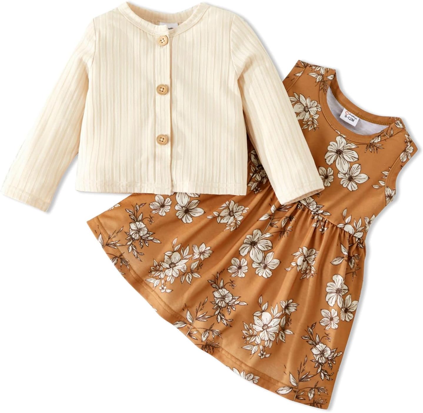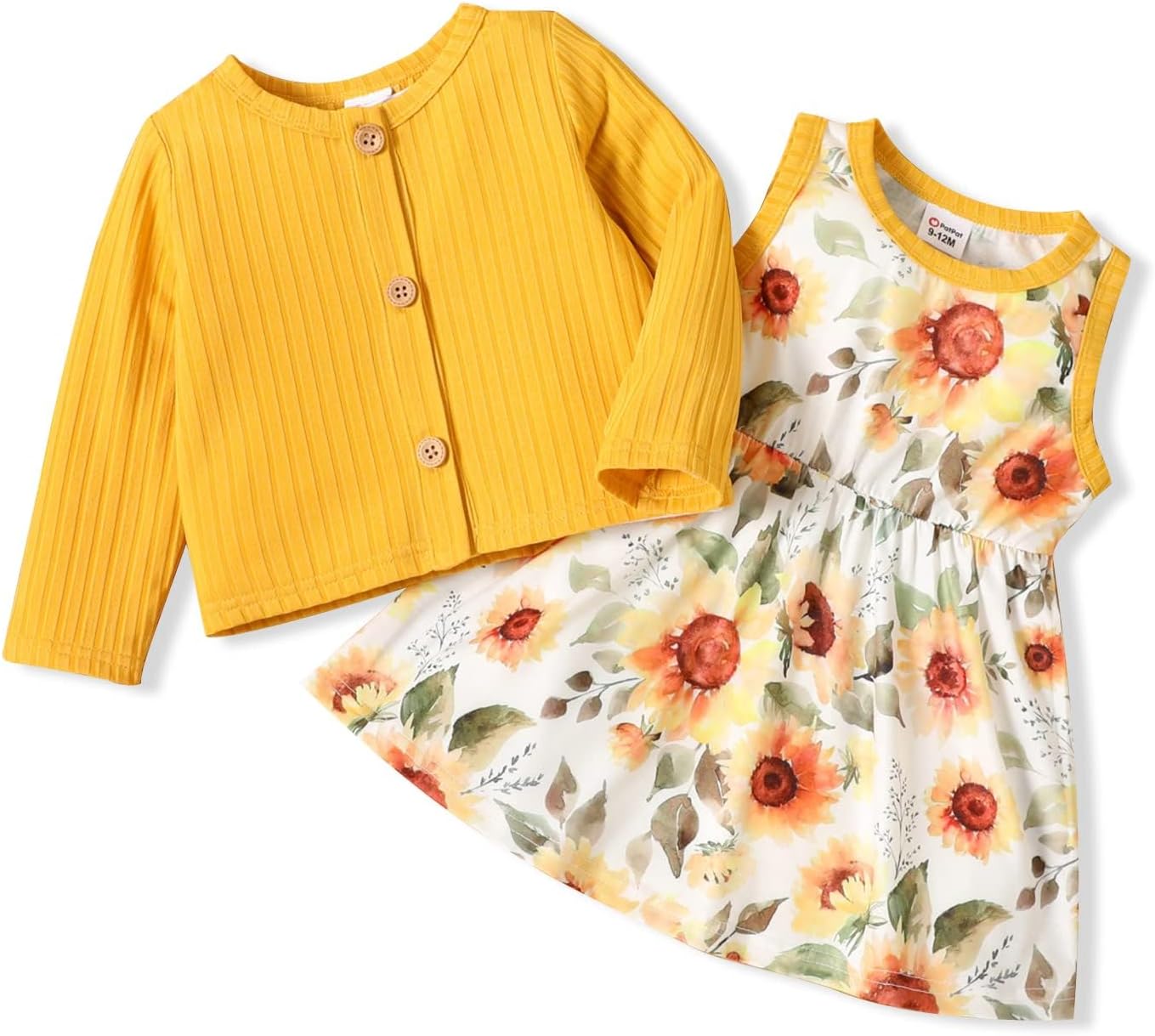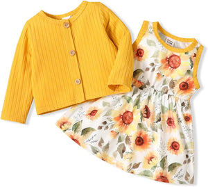 PATPAT Baby Girls Dress and Cardigan Sets 2 PCS Toddler Girl Sunflower Print Sleeveless Dress and Long Sleeve Cardigan Set