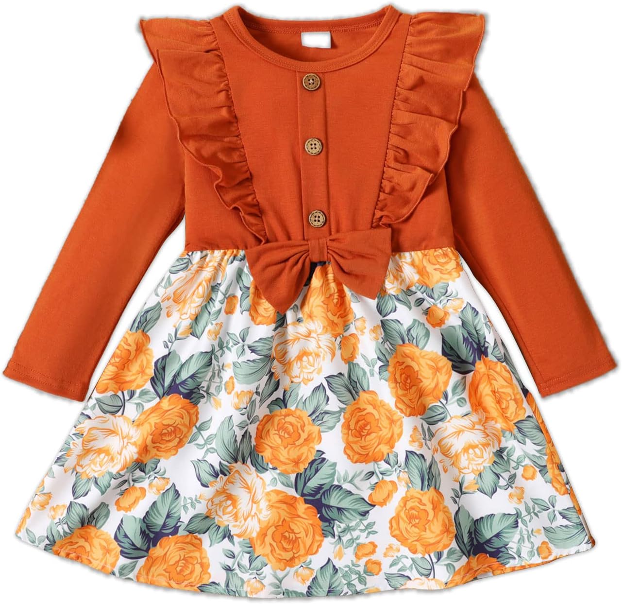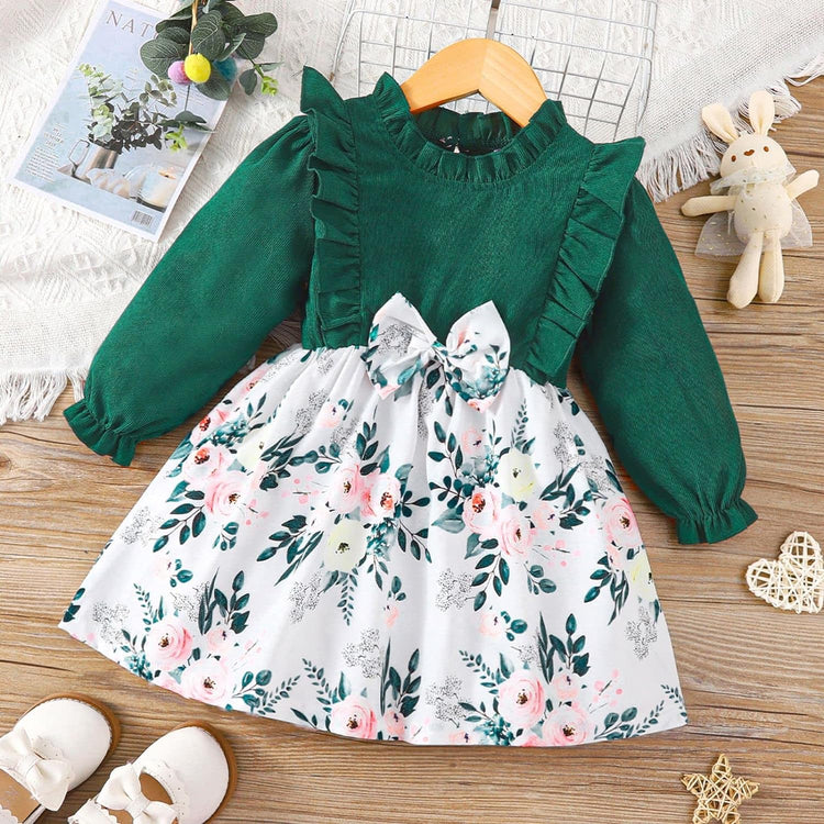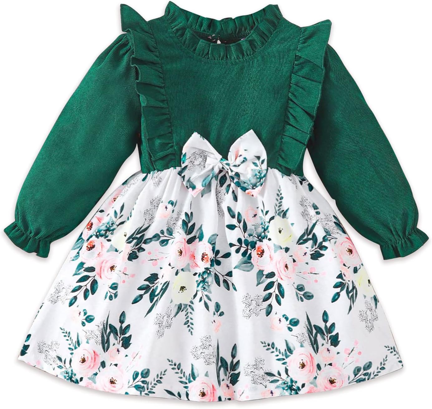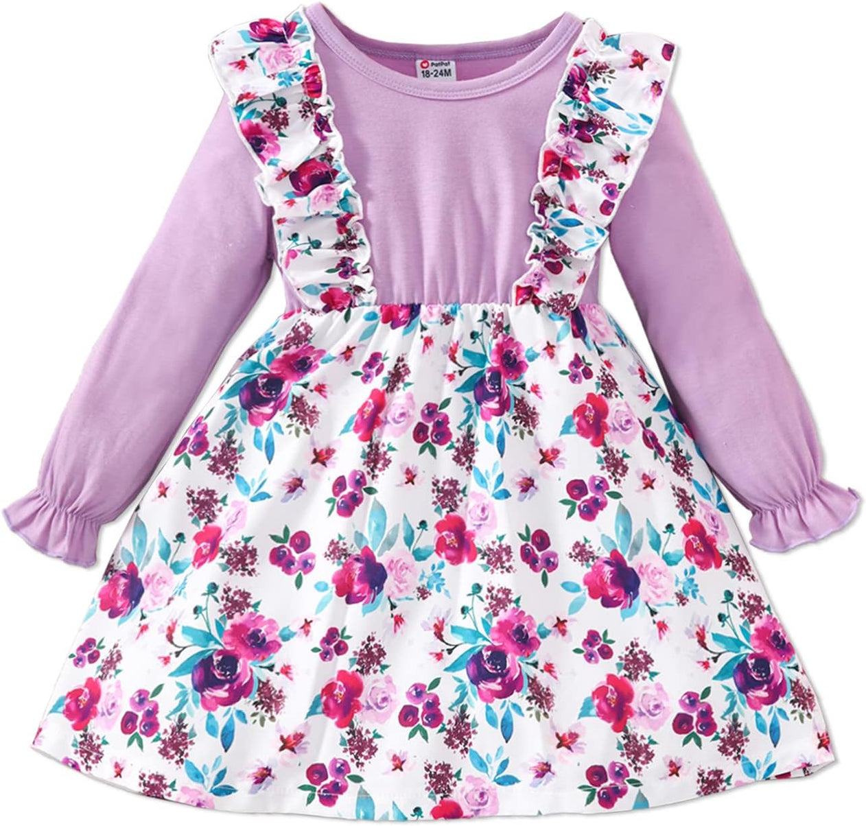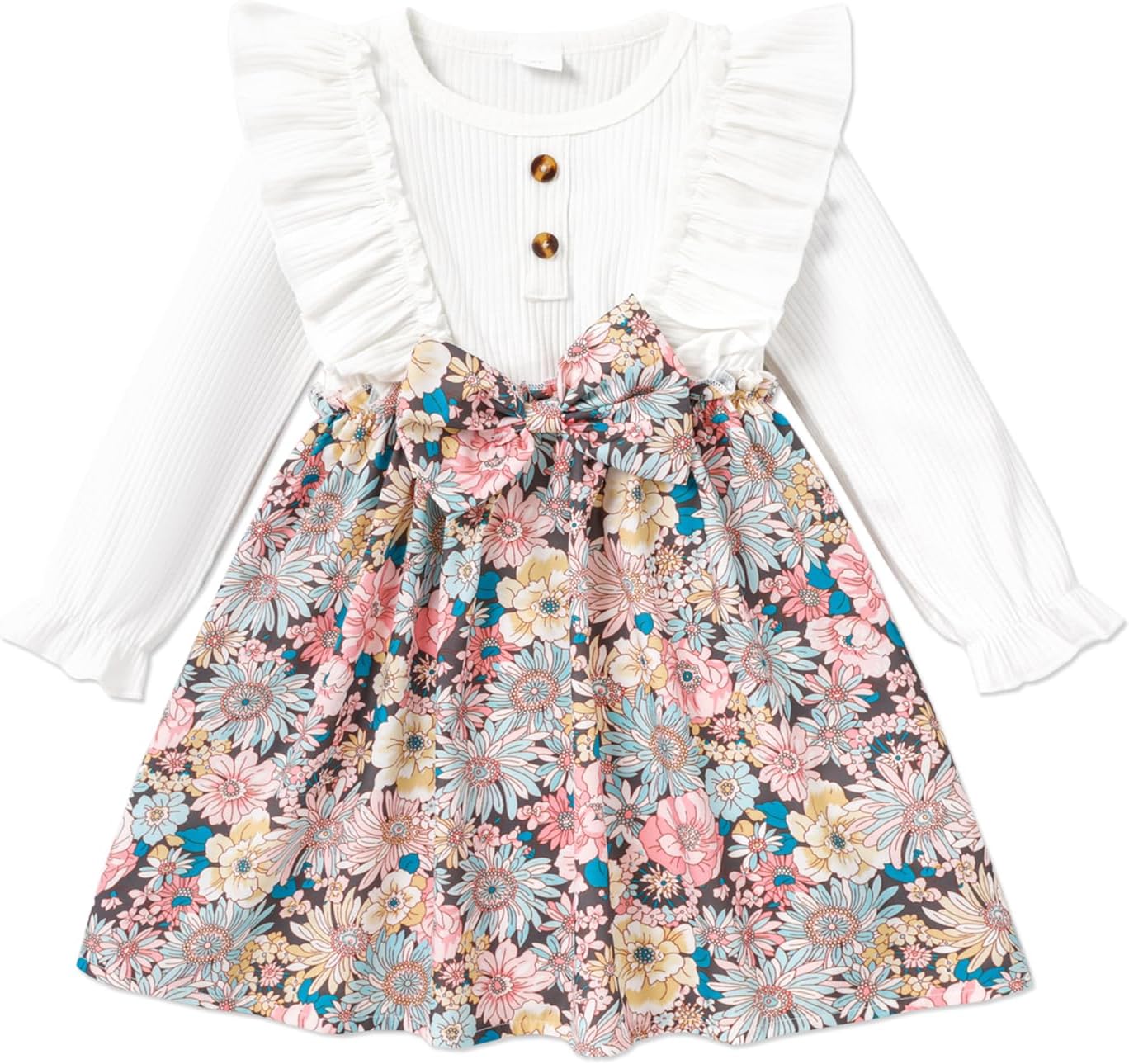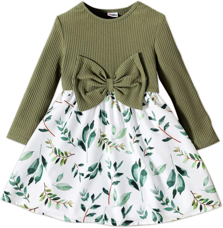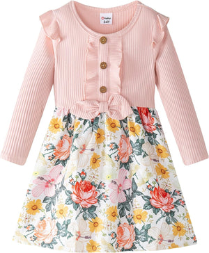 PATPAT Baby Toddler Floral Print Bowknot Dress Colorblock Round Neck Long Sleeves Fall Dress for Girls