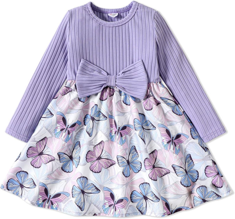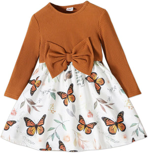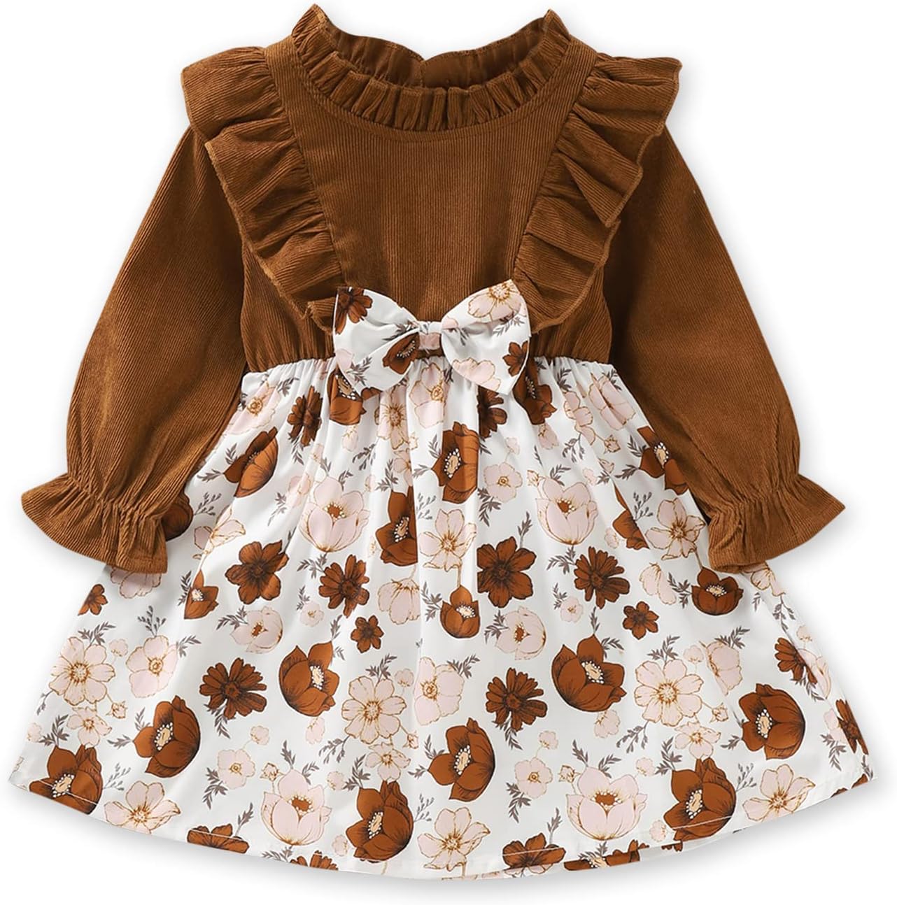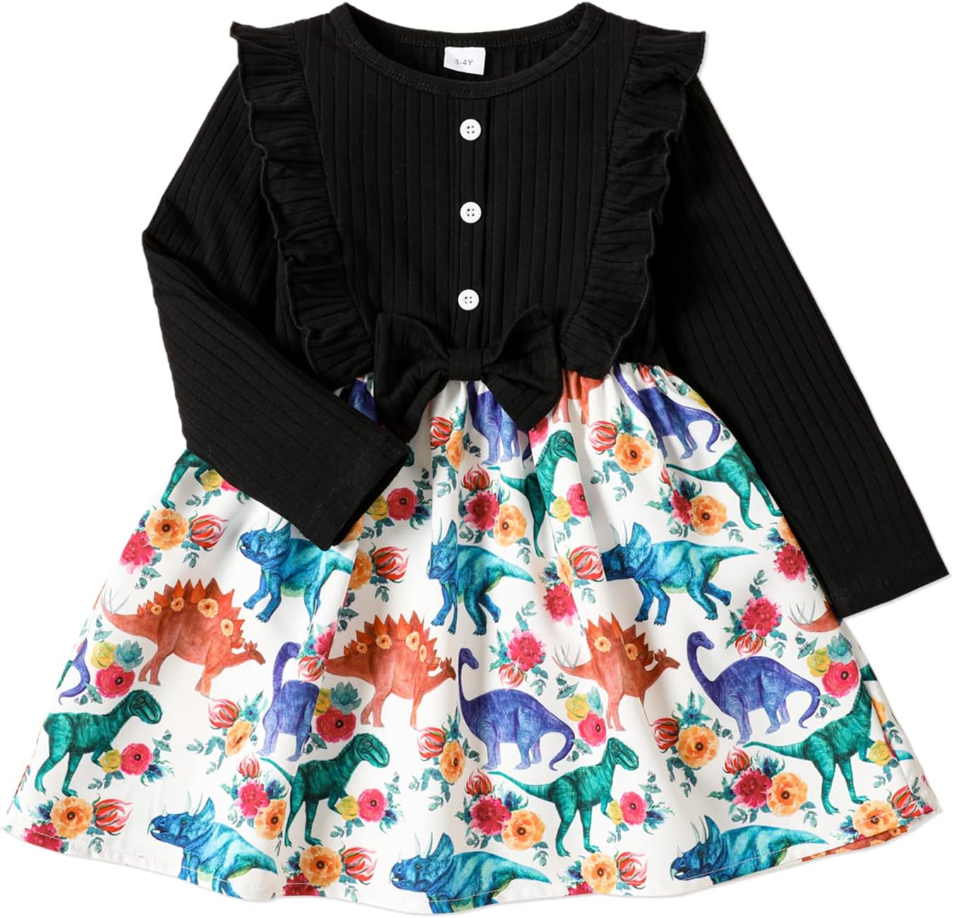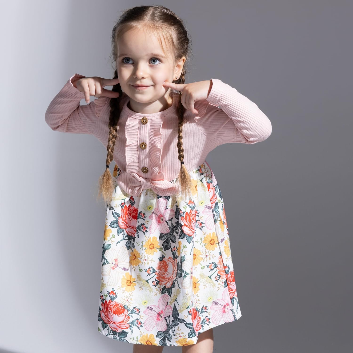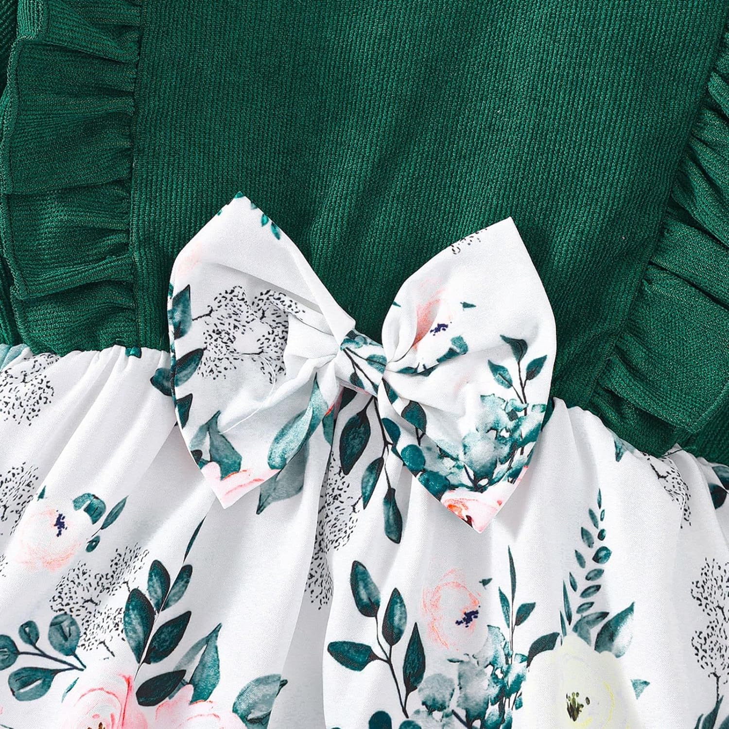 PATPAT Baby Toddler Floral Print Bowknot Dress Colorblock Round Neck Long Sleeves Fall Dress for Girls