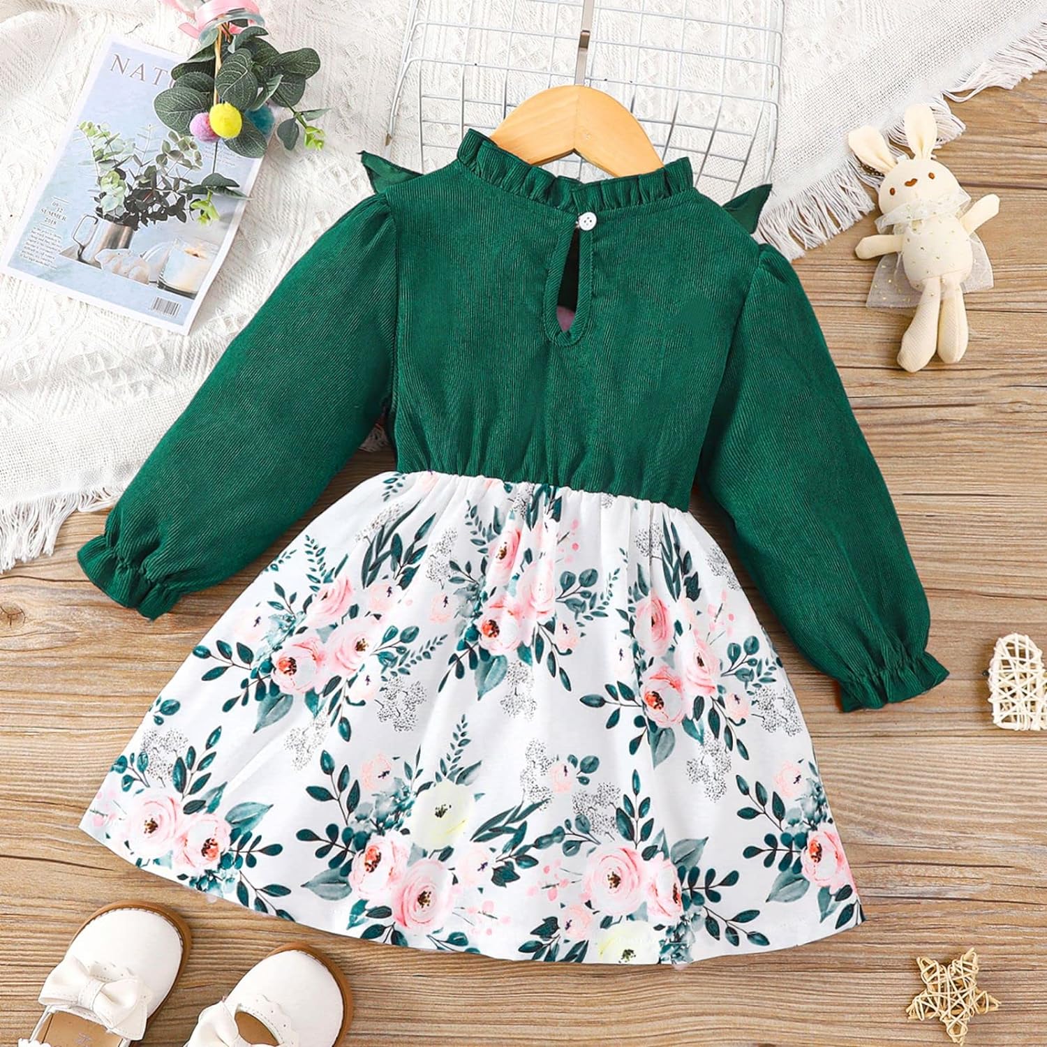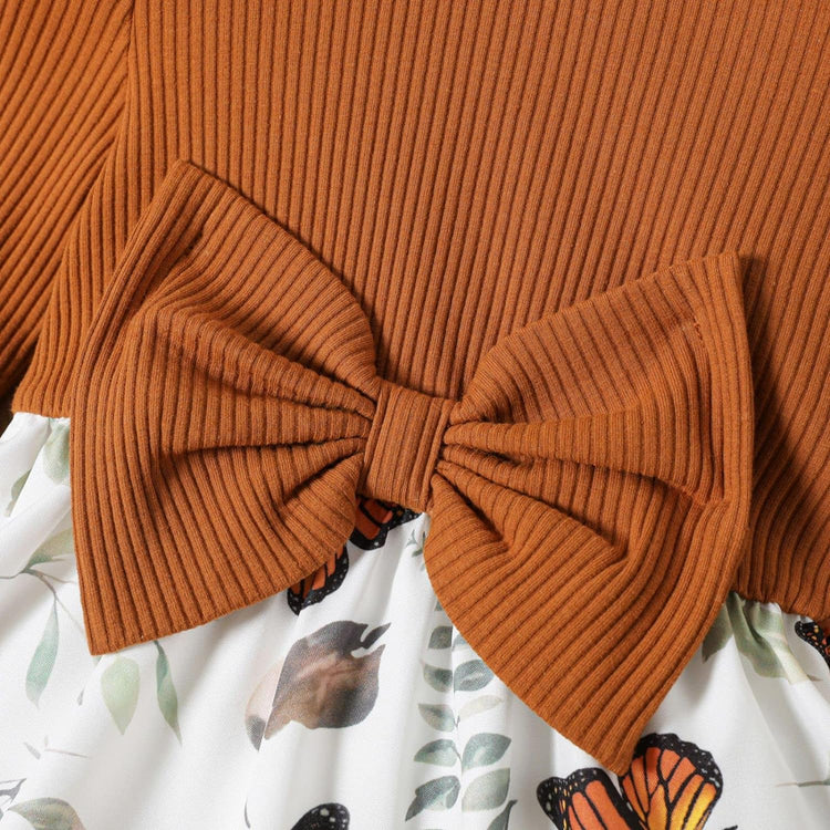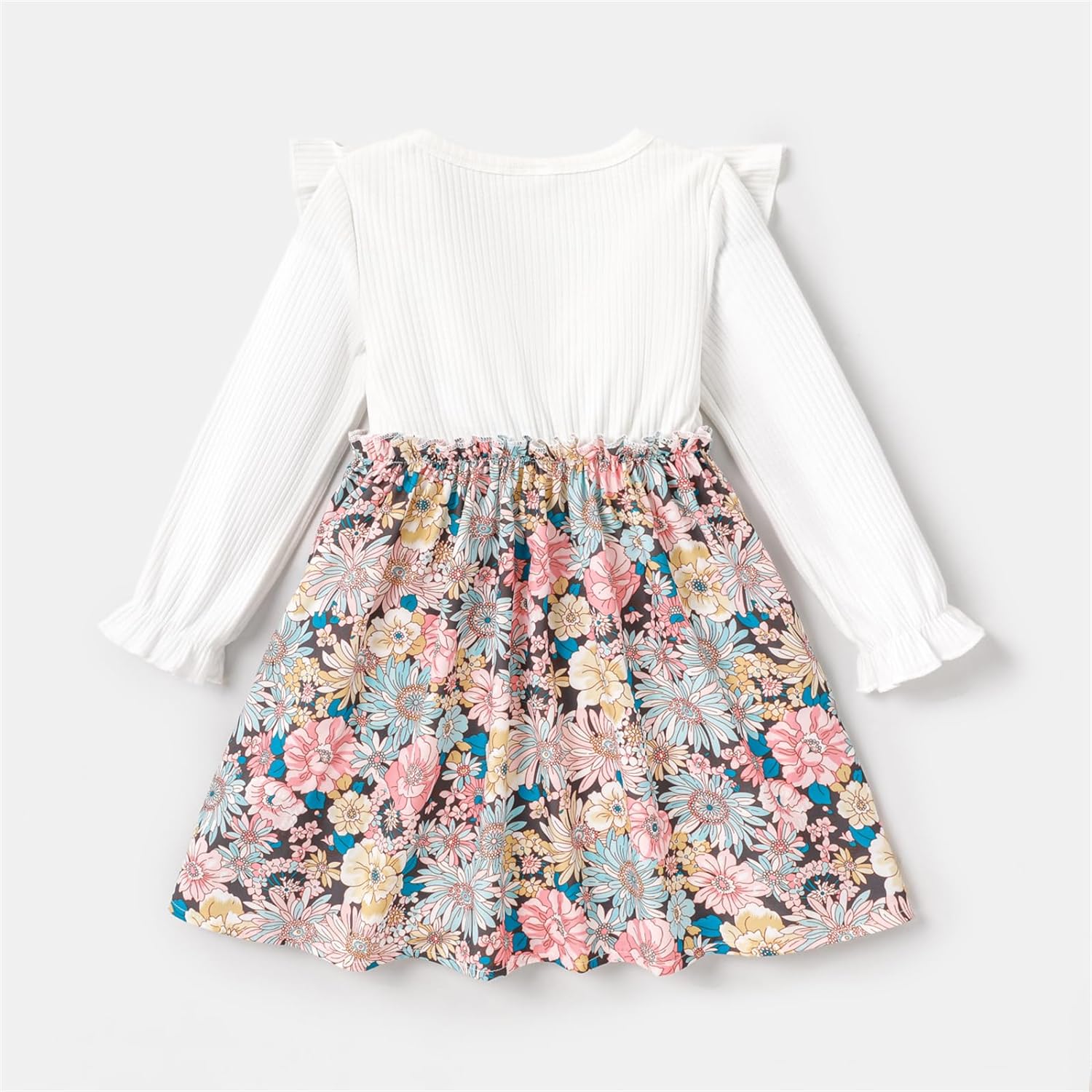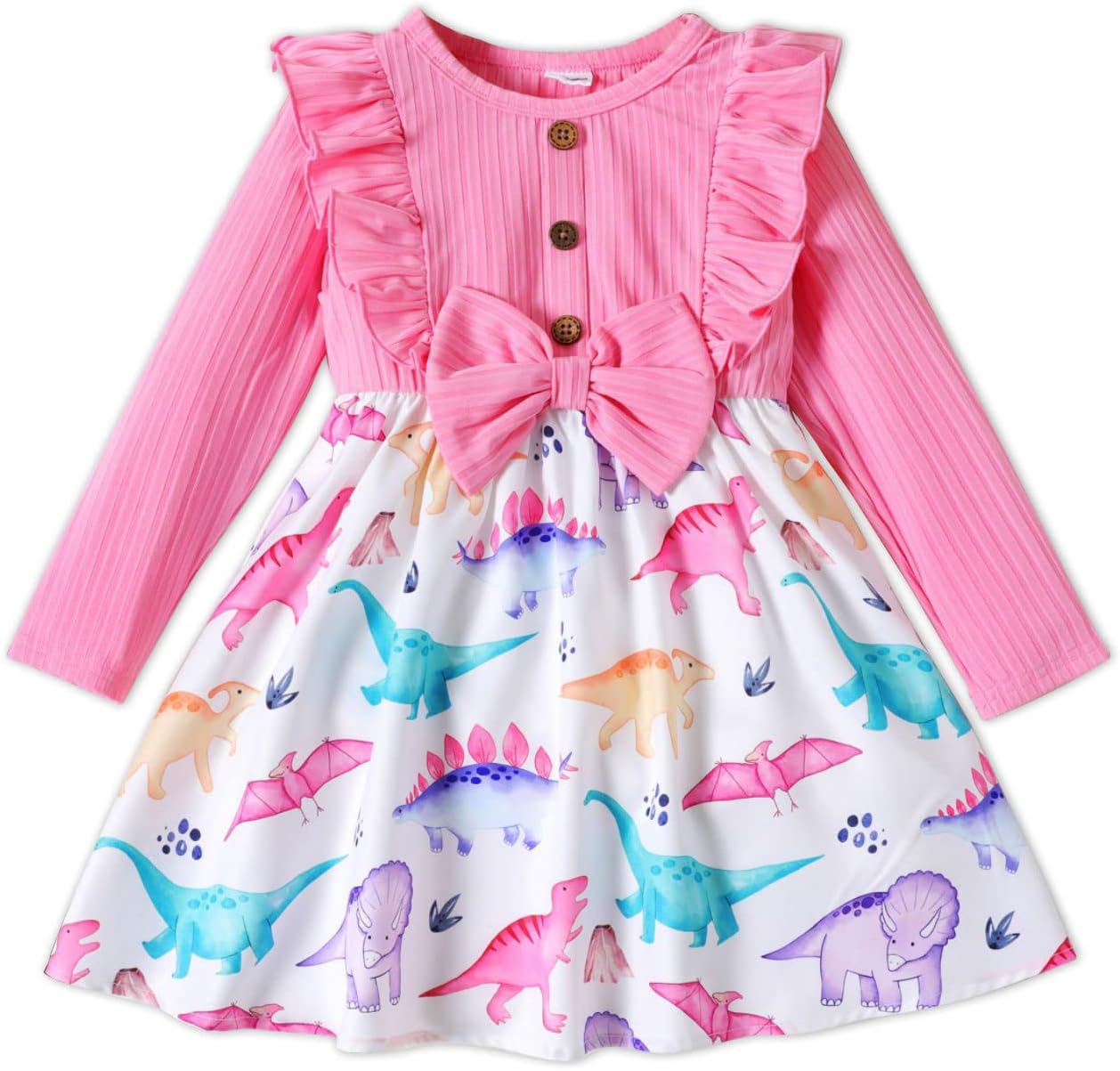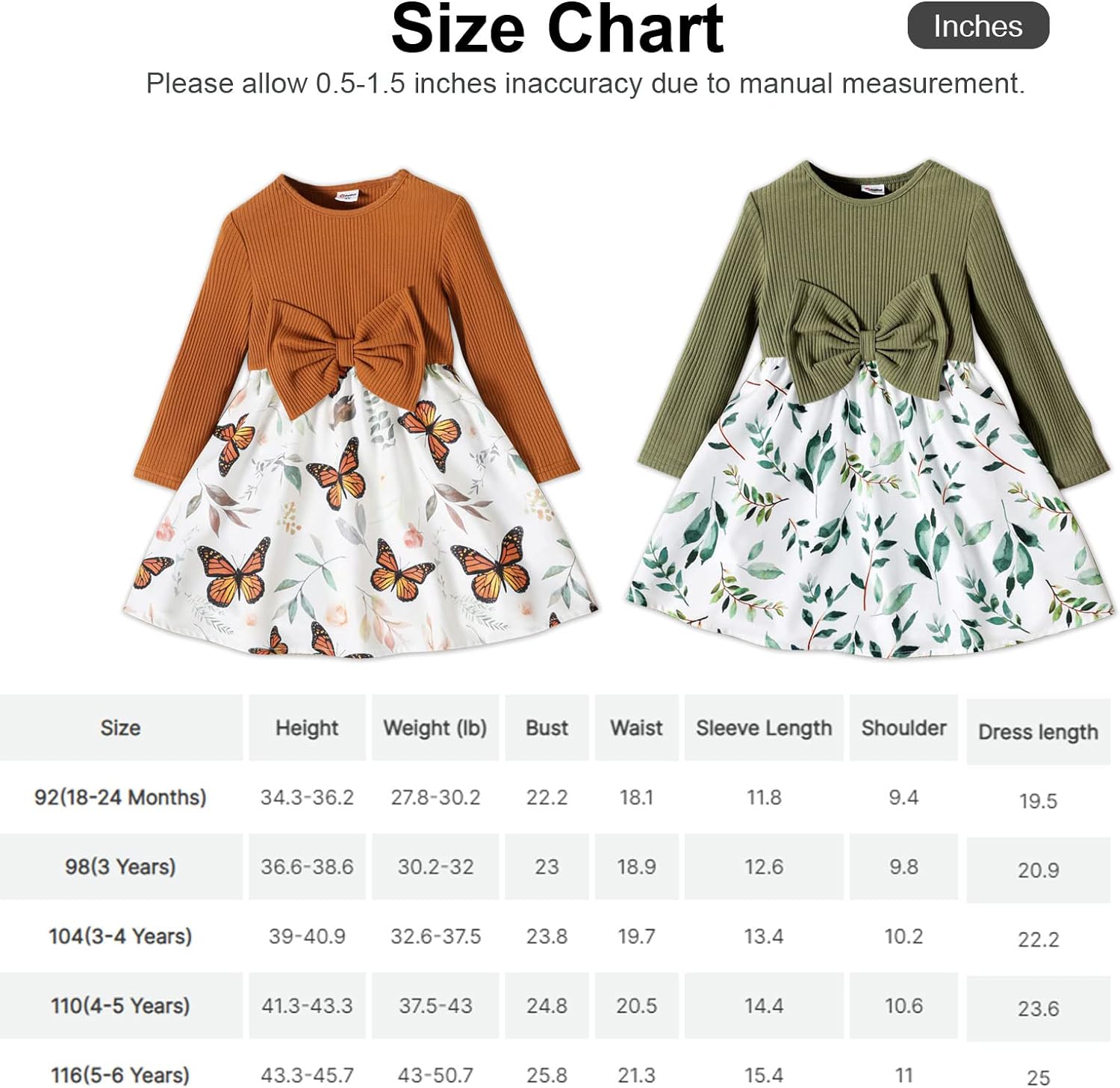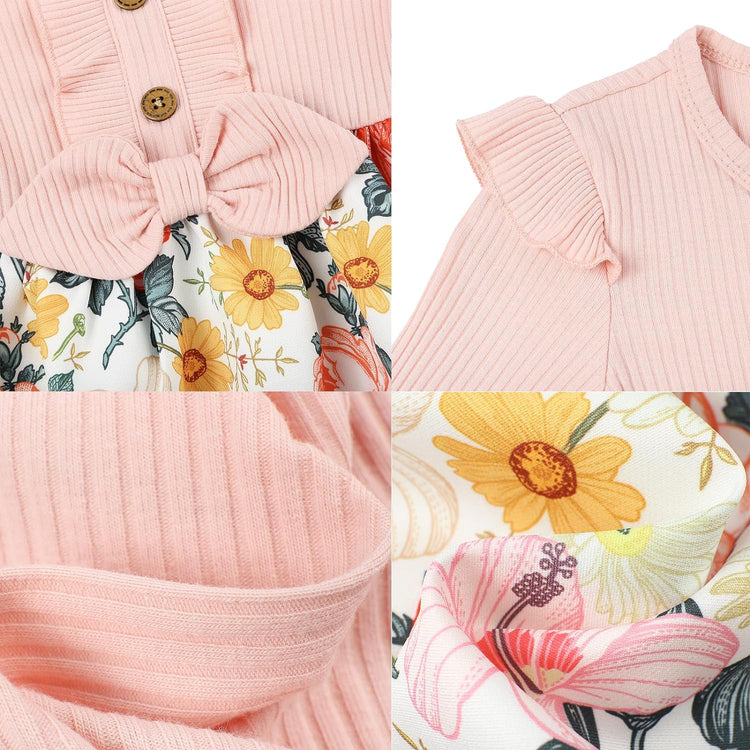 PATPAT Baby Toddler Floral Print Bowknot Dress Colorblock Round Neck Long Sleeves Fall Dress for Girls