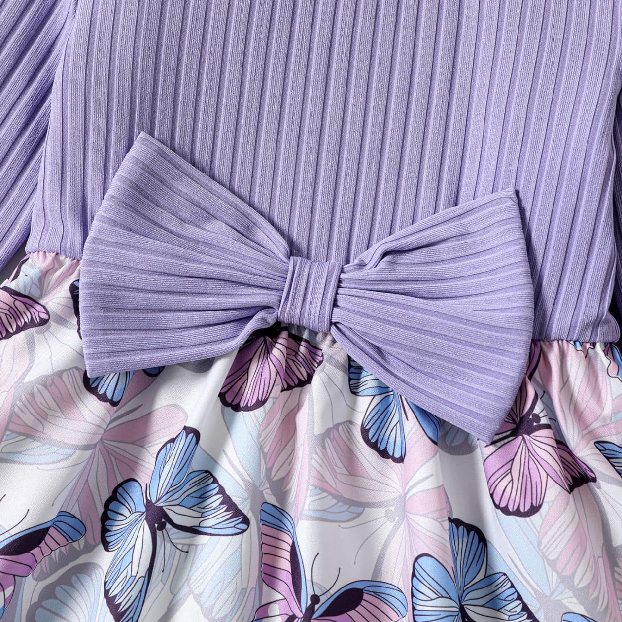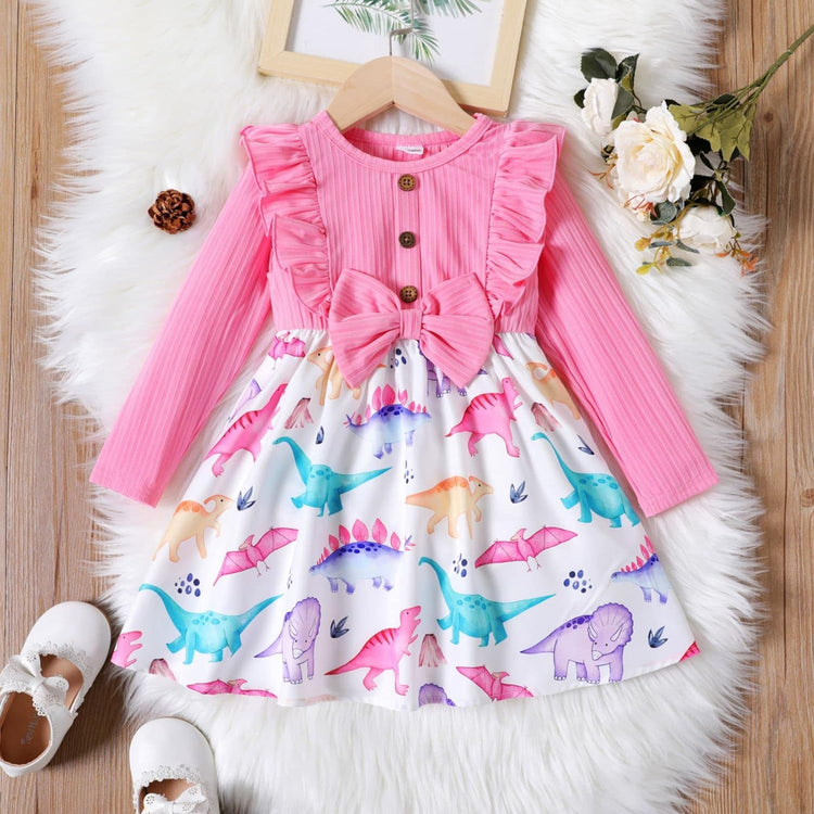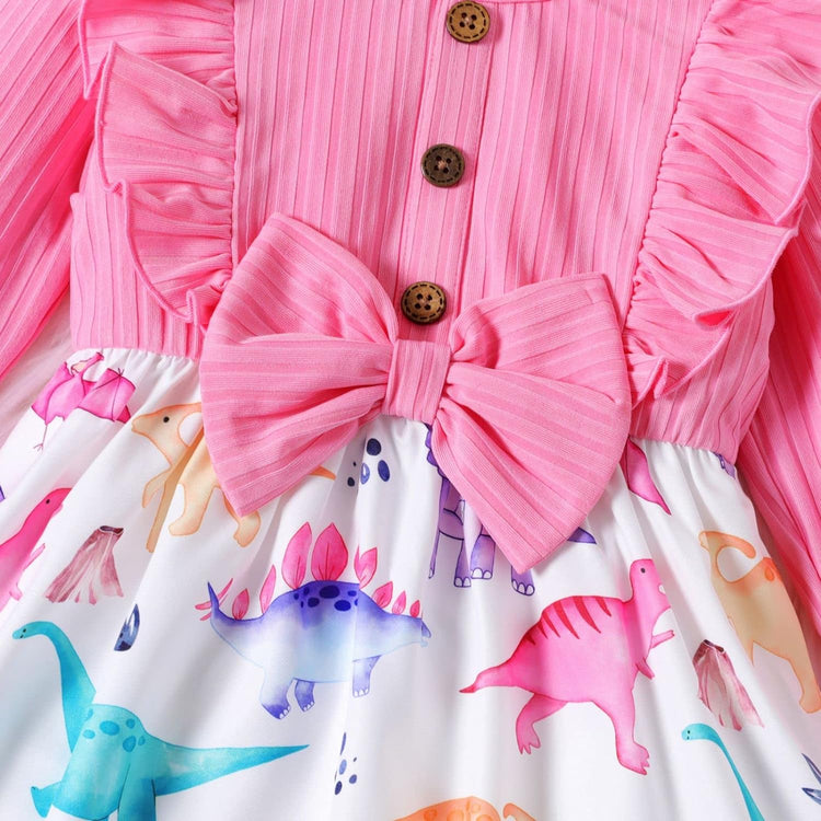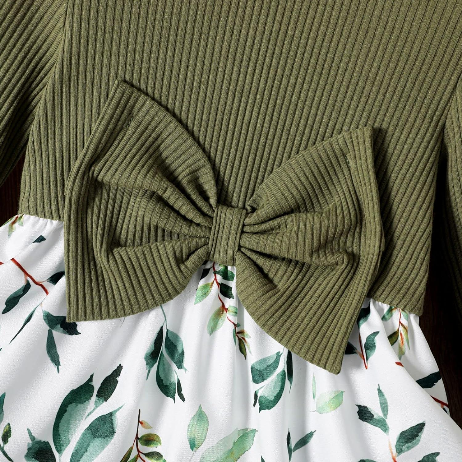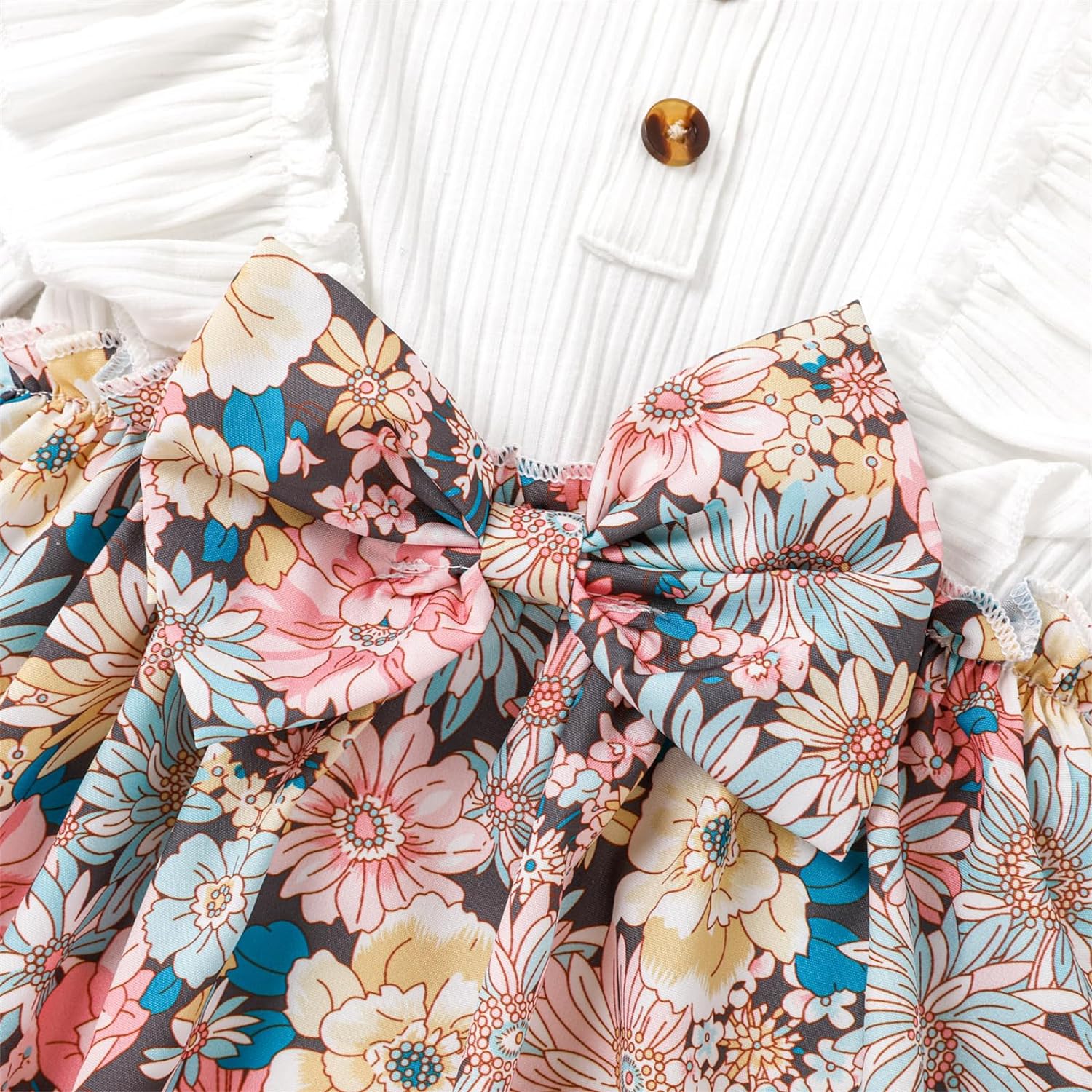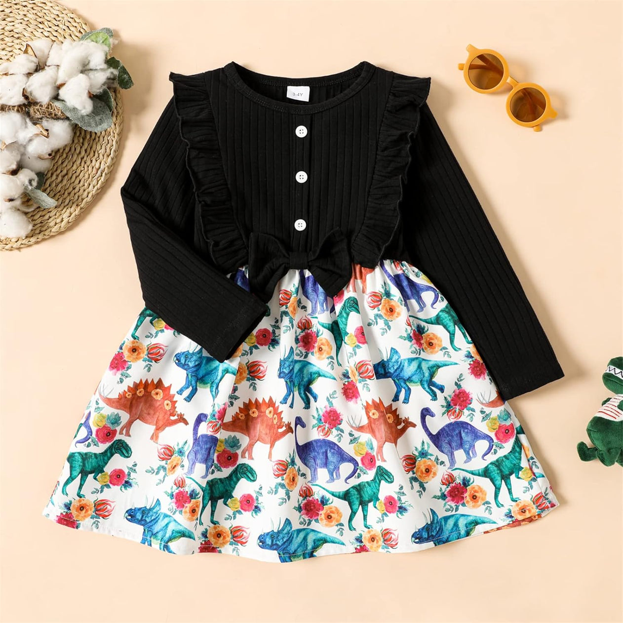 PATPAT Baby Toddler Floral Print Bowknot Dress Colorblock Round Neck Long Sleeves Fall Dress for Girls