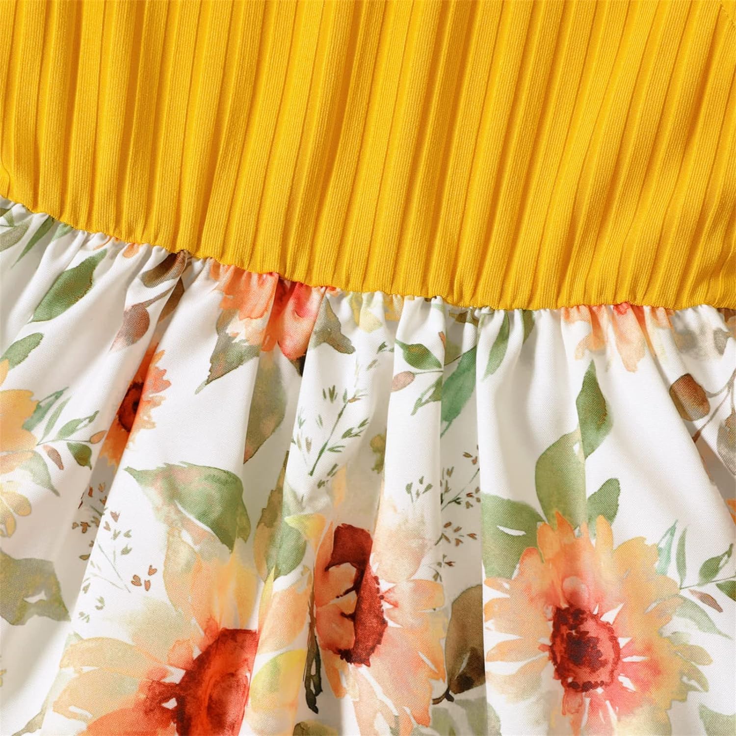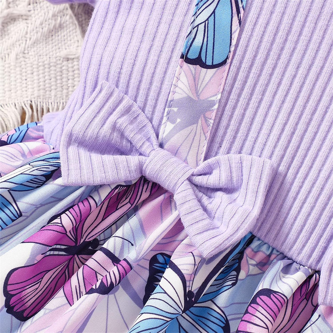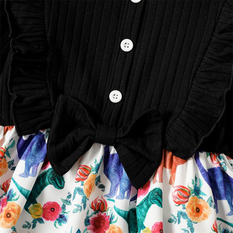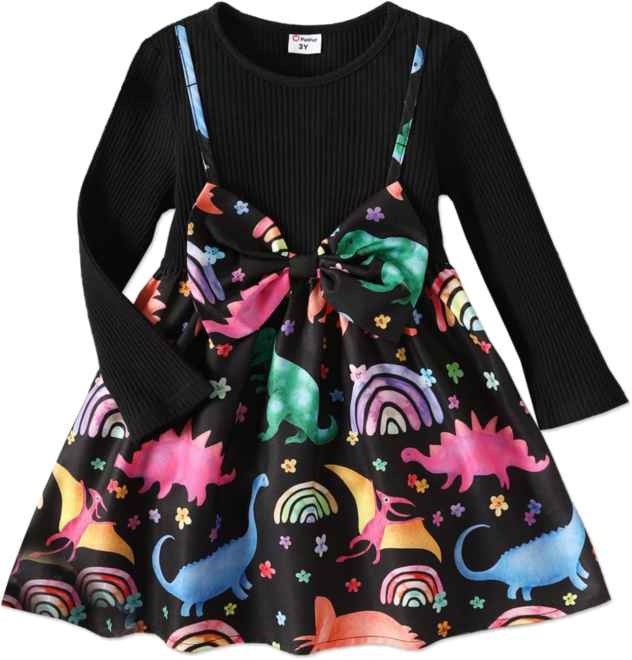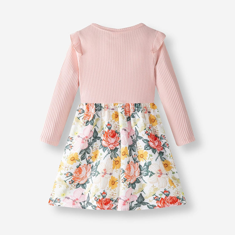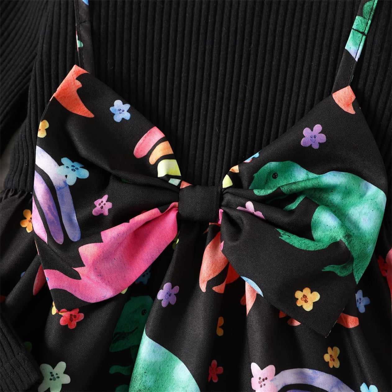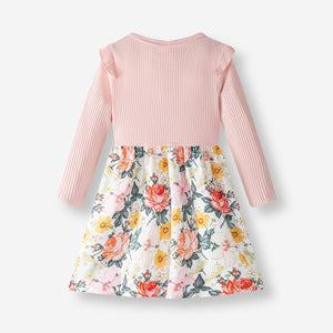PATPAT Baby Toddler Floral Print Bowknot Dress Colorblock Round Neck Long Sleeves Fall Dress for Girls